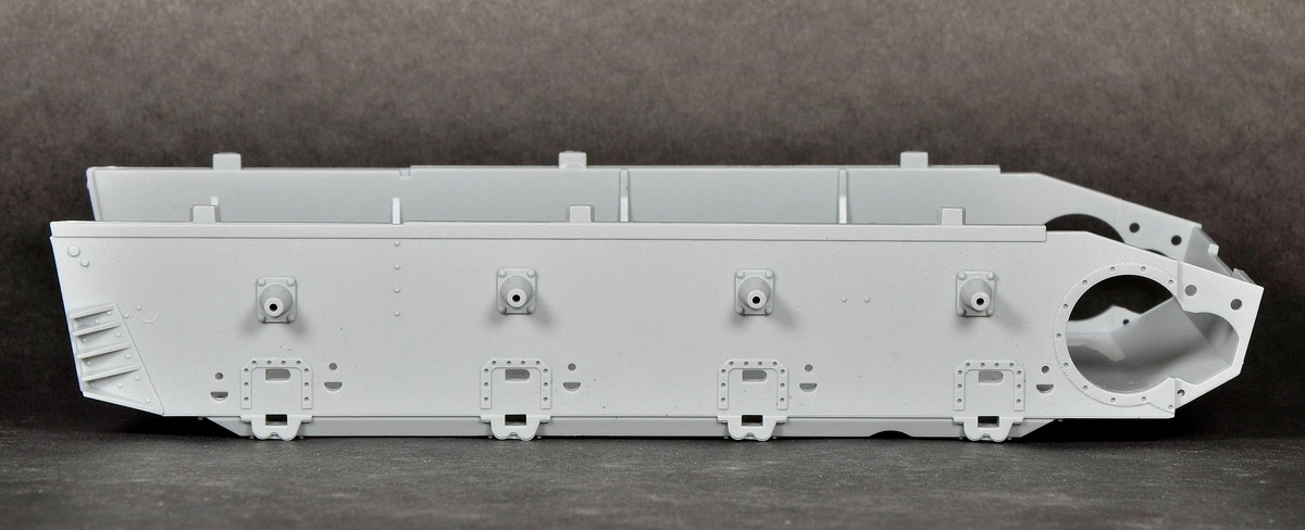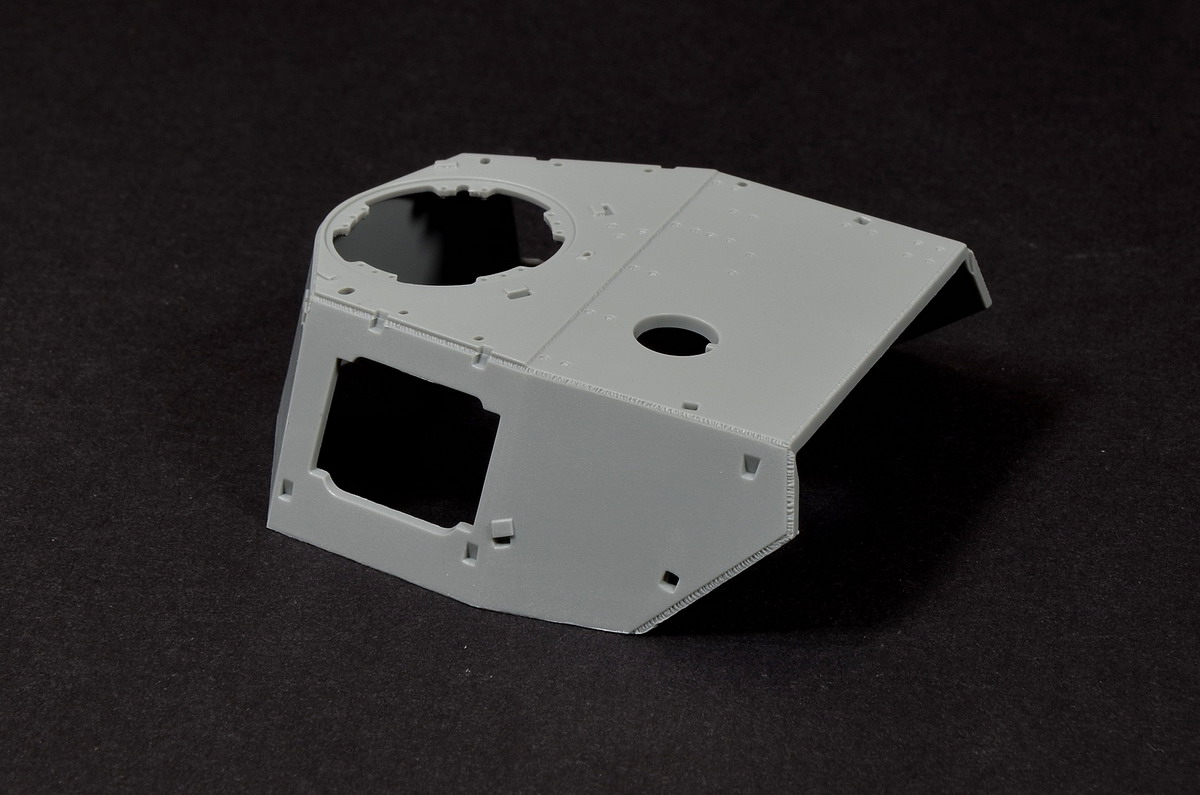 Отдельно хочу остановиться на циммерите. Исполнение, как это ни странно, мне понравилось. Не пострадала ни толщина башенных экранов, ни внешний вид. Выполнено всё на уровне, довольно реалистично. Полоса циммерита на передней части ВЛД дана травленой деталью, правда, в инструкции я описание этого момента не нашел.