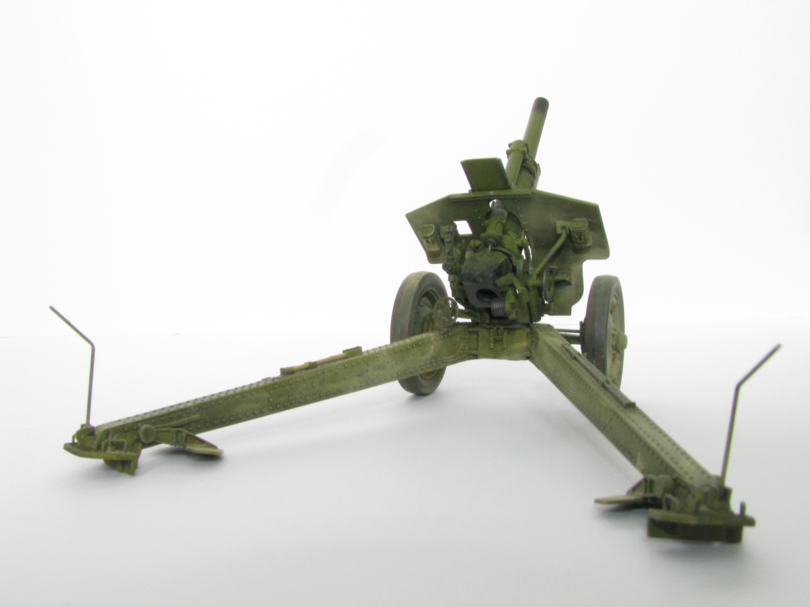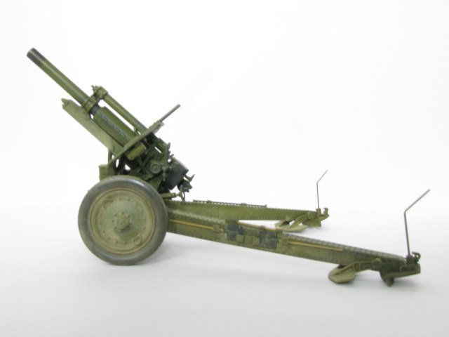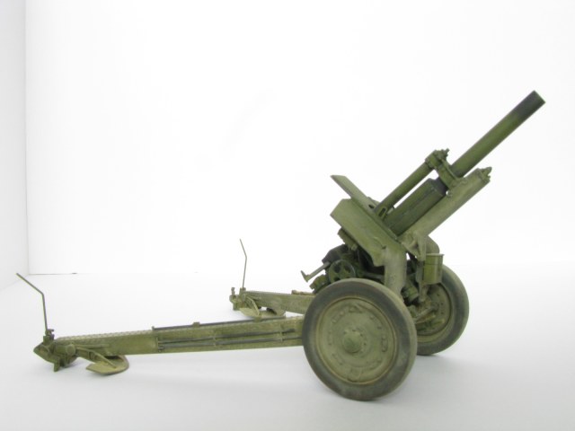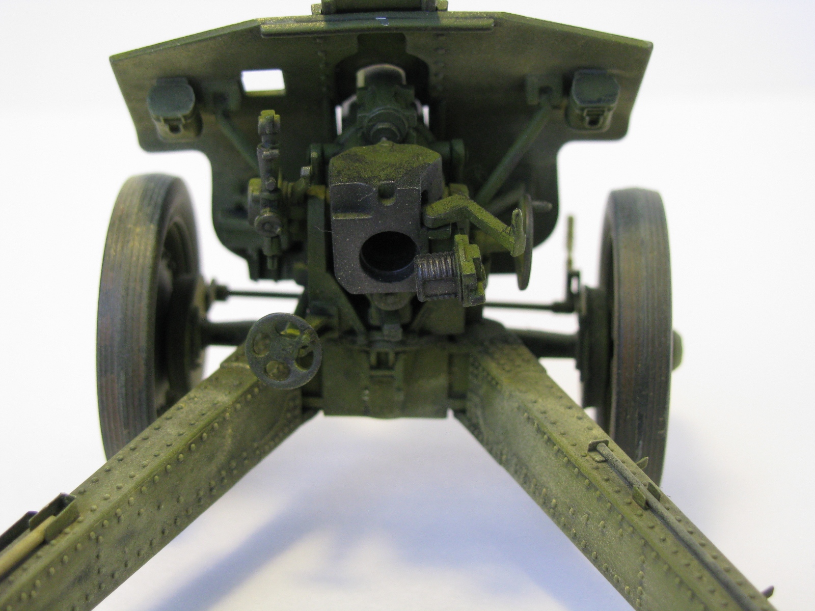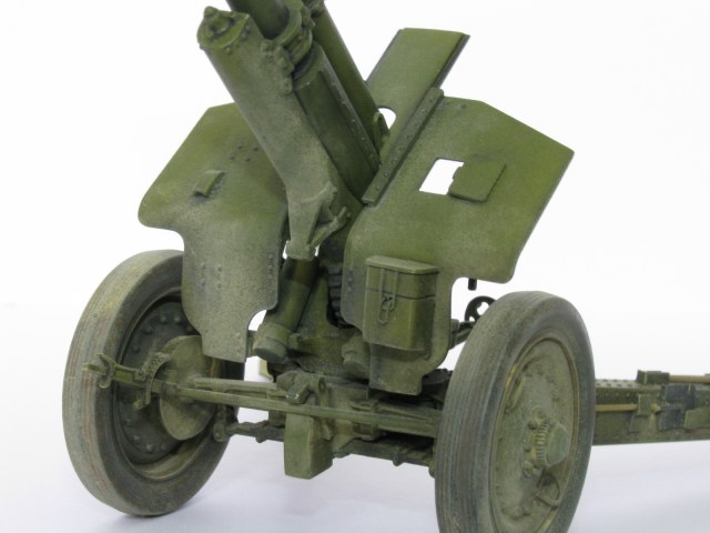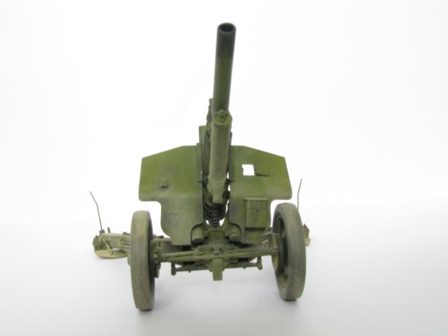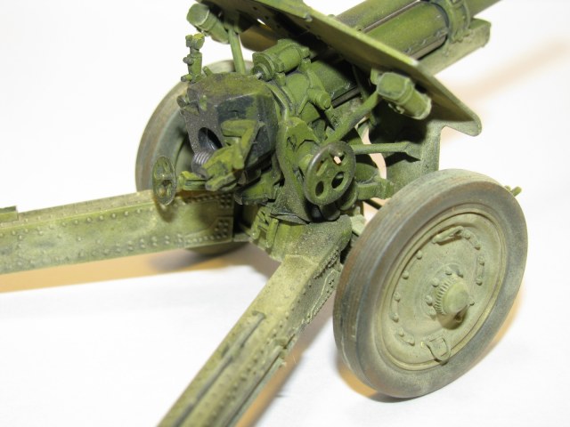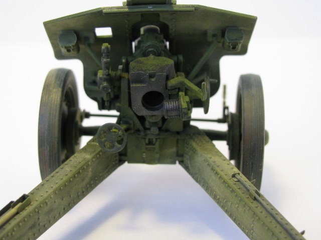 Очень качественное орудие. Два замечания: при таком положении поршня затвора рукоятка должна быть под 90 градусов к оси ствола и 2) сектор механизма вертикального наведения (зубцы в передней части) не красились, должен быть голый металл.