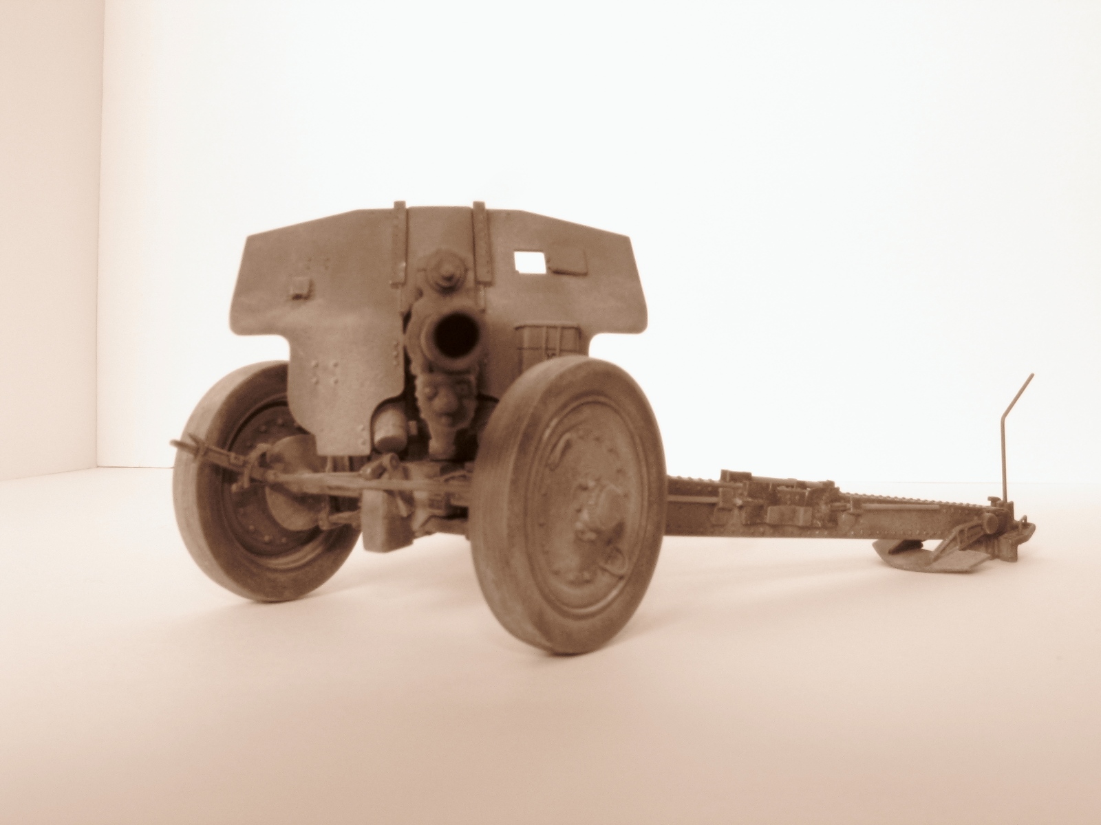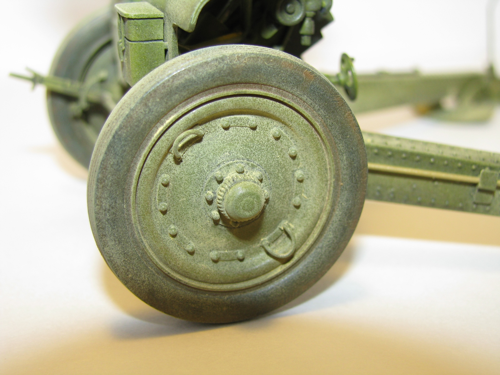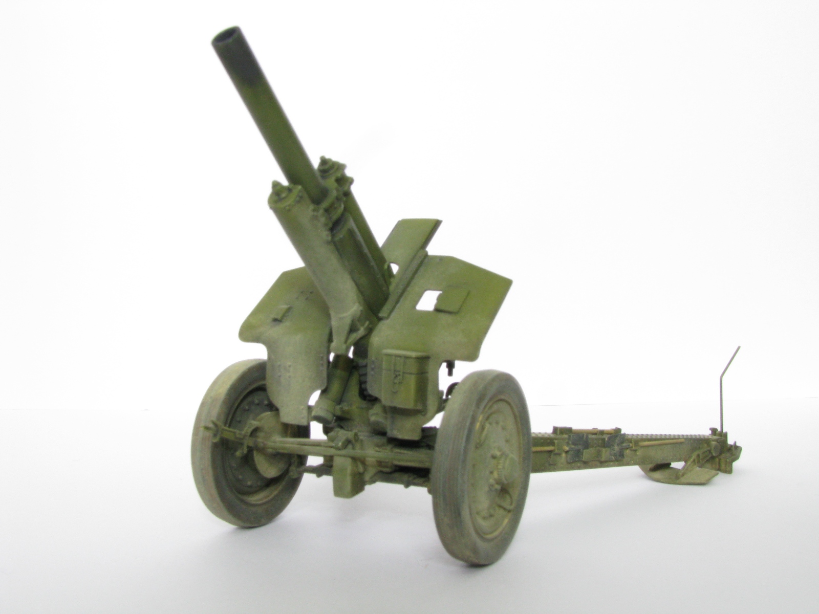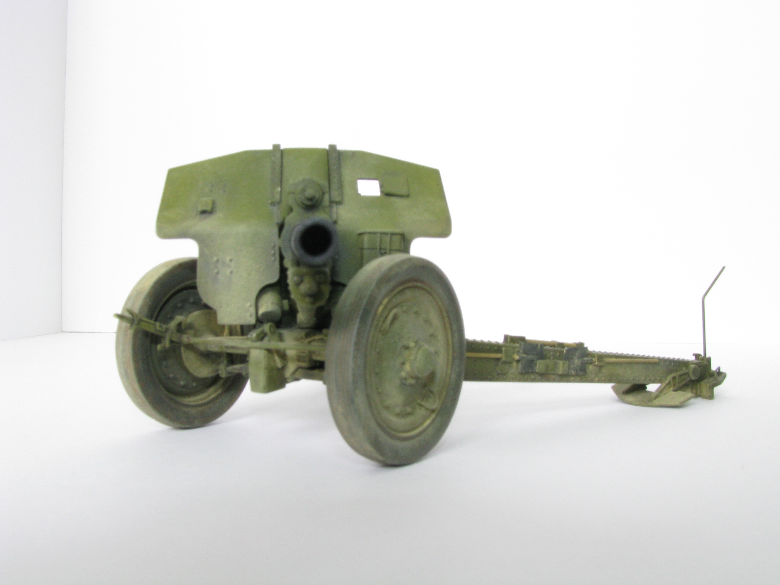 Очень качественное орудие. Два замечания: при таком положении поршня затвора рукоятка должна быть под 90 градусов к оси ствола и 2) сектор механизма вертикального наведения (зубцы в передней части) не красились, должен быть голый металл.