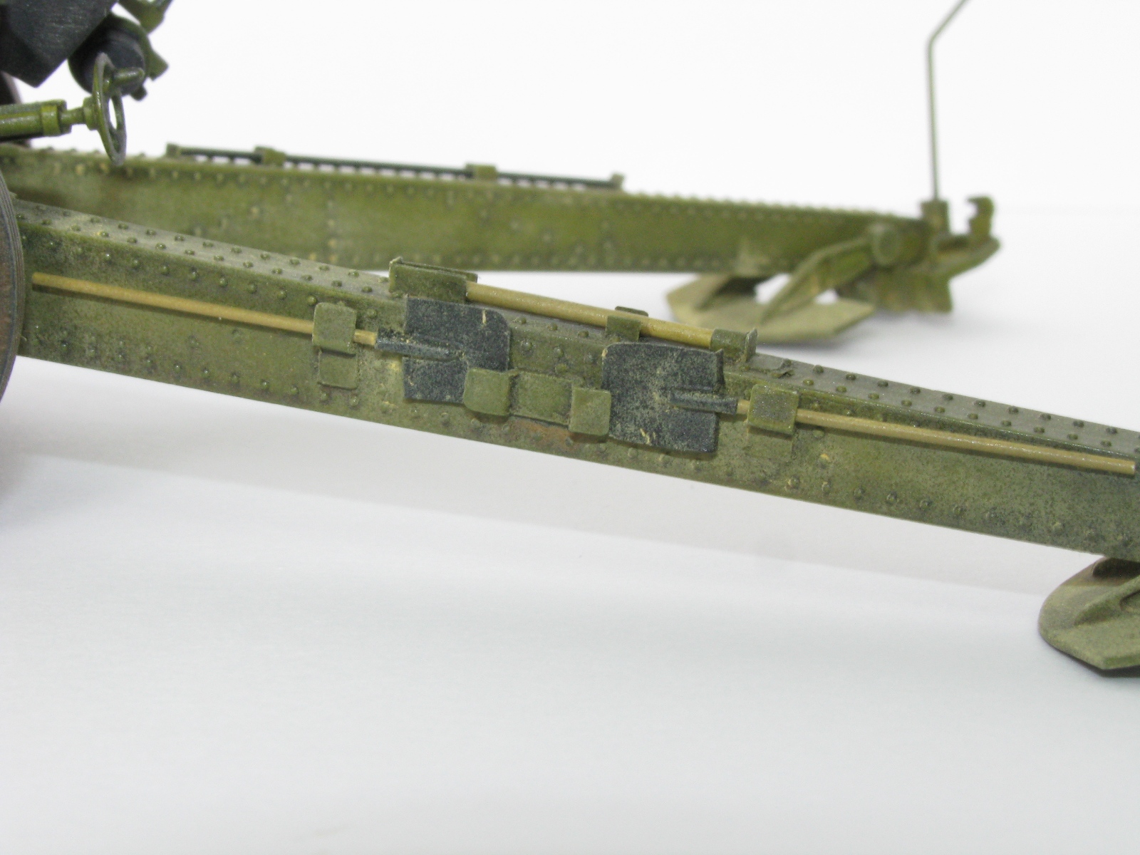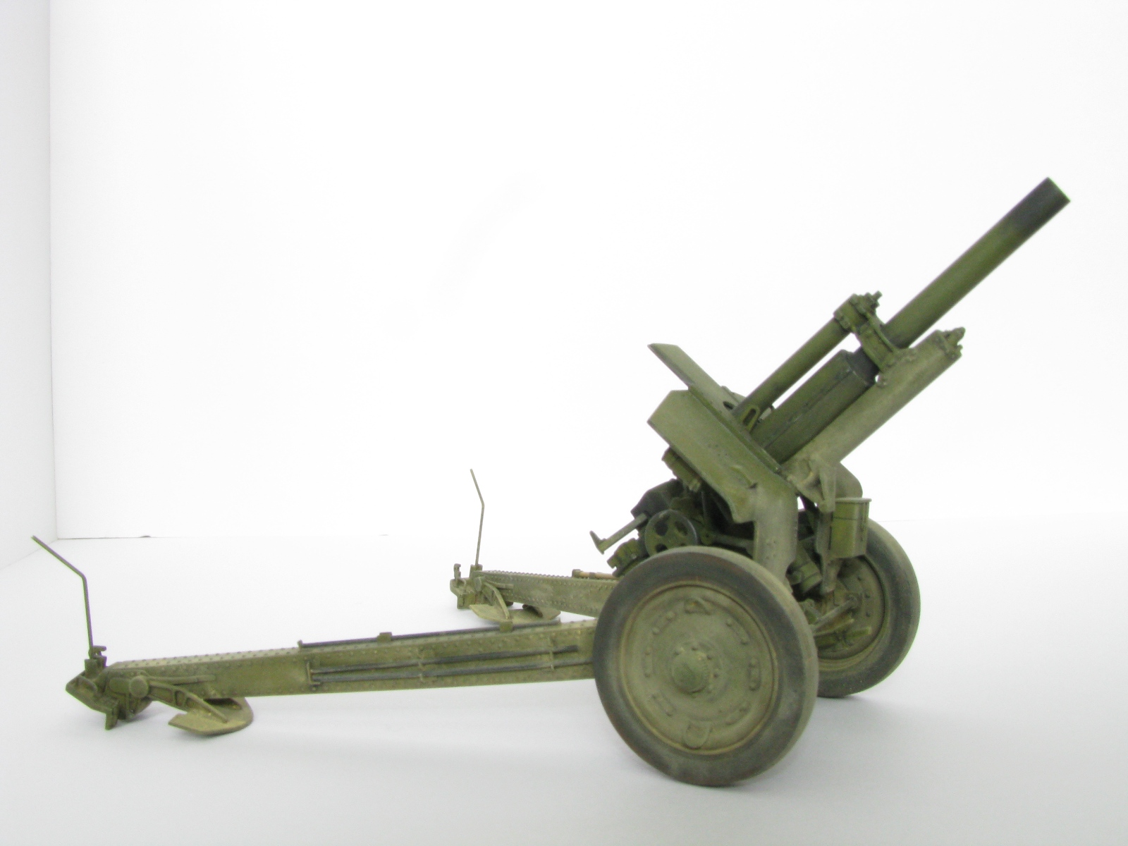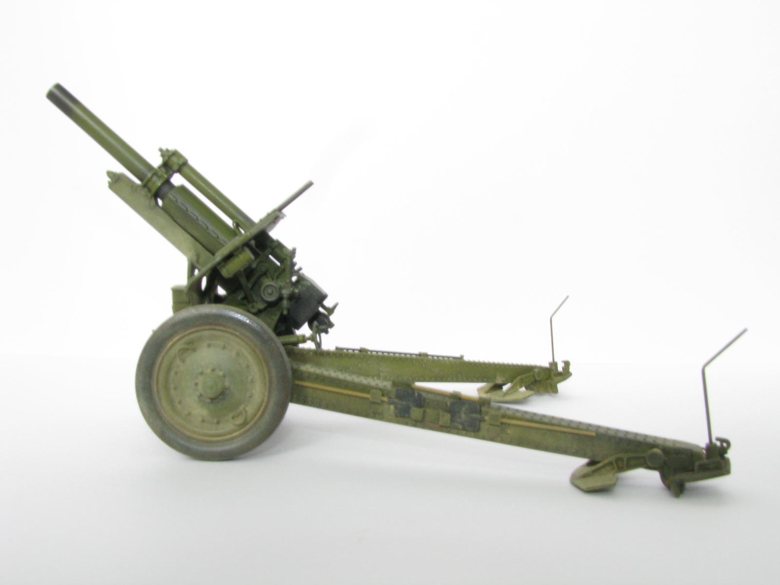 Процесс постройки происходил из коробки с некоторыми доработками подручным материалом, не обошлось и без шпаклевки. Станины гаубицы были частично зачищены от клепки, отшпаклеванны ( после покраски правда выяснилось что не все убрала шпаклевка, но снова возитья со станинами и клепкой не было желания). Доработал колеса сделав проушины из проволоки, штоки цилиндров подъема ствола сделал из мед. игл. Также полностью заменил весь шансовый инструмент из набора на самодельный из проволоки, мед игл, из жести и проволоки сделал новые лопаты, петли крепления так же из жести. По возможность оставил рабочими некоторые узлы гаубицы.