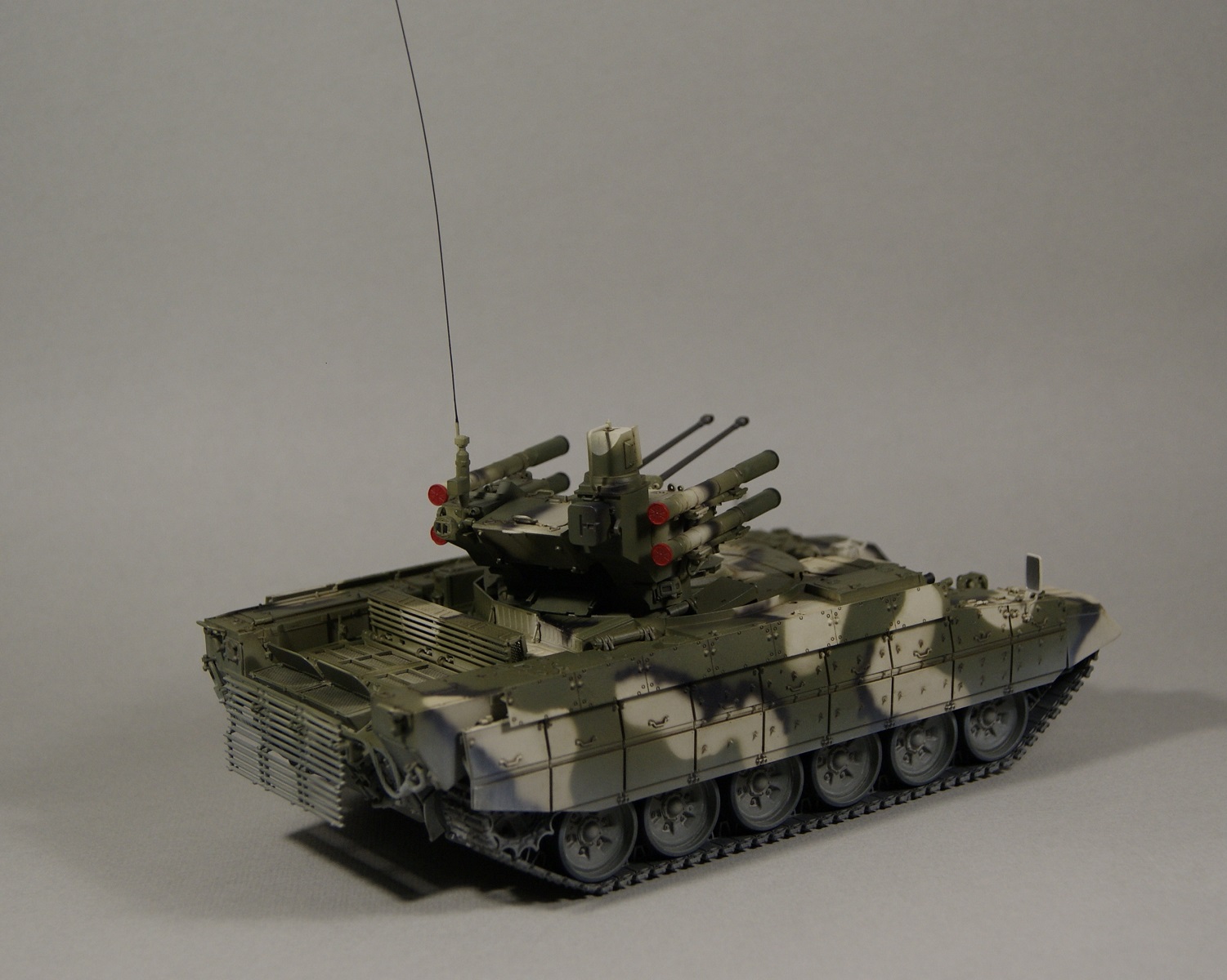 Модель дополнена только стволами, остальное из коробка . Красилось XF-57 и Зеленый Акан для современки, химия Аммо . Что касается самого набора - много вопросов как по матчасти так и стыкуемости, все детские болезни от Т-90 , перечислять не буду все описано и так много раз. Звезда даже порадовала поворотом башни только на 90 градусов, что меня несомненно осчастливило. Звезду на будущее можно рекомендовать только как сборку без любых дополнений т.к. вложения явно не слишком оправданы ( полное вооружение как 3 модели ). В сборке модель доставила запоминающиеся впечатления, что стоила только хрупкая ходовая.... хорошо что внешне модель очень приятна и в готовом виде мощна и презентабельна.