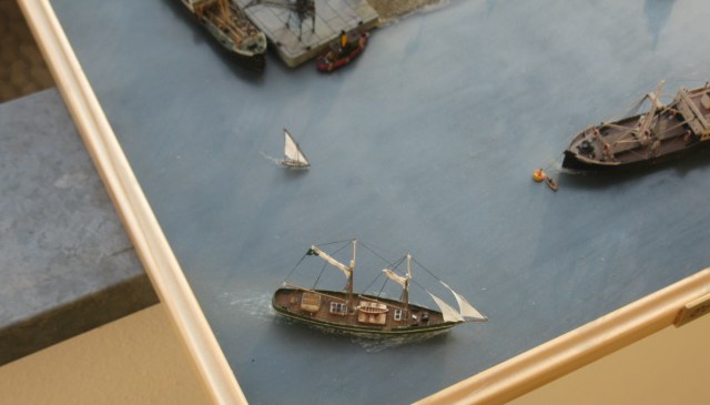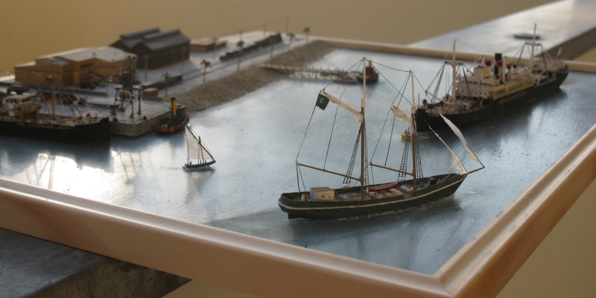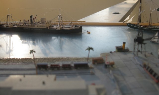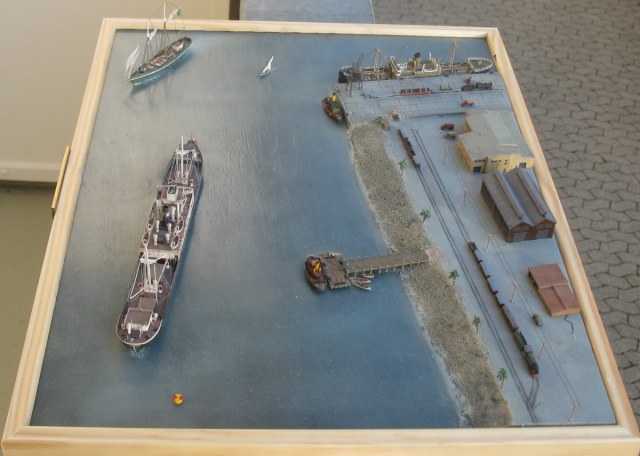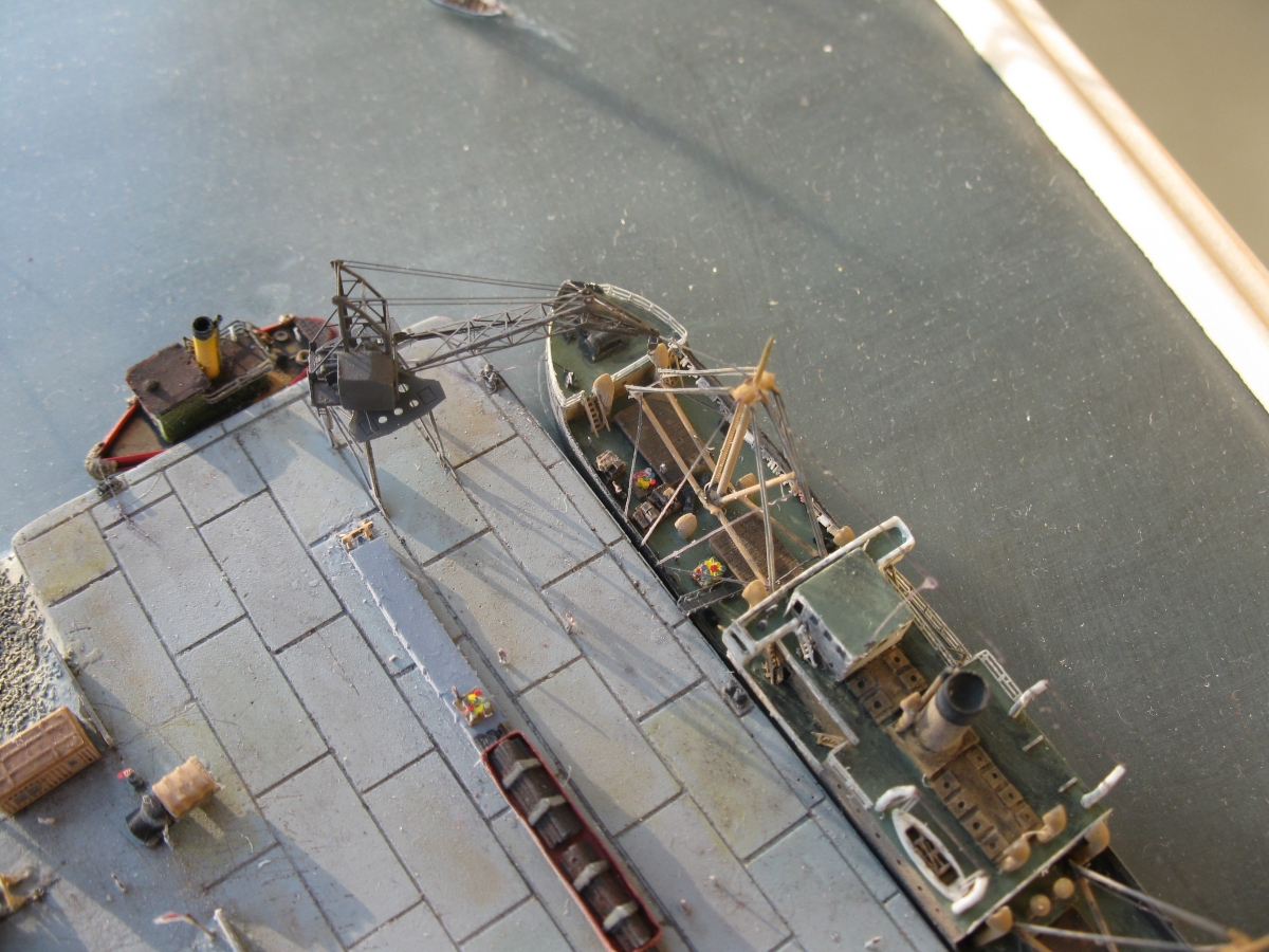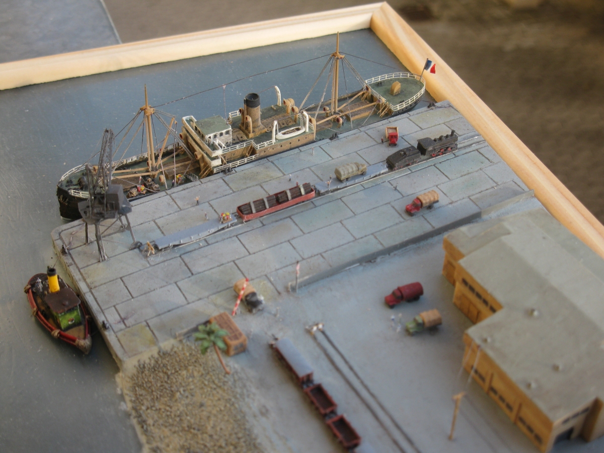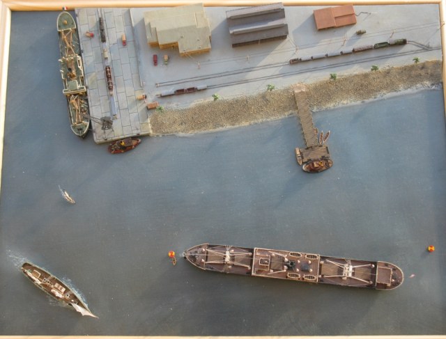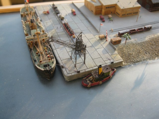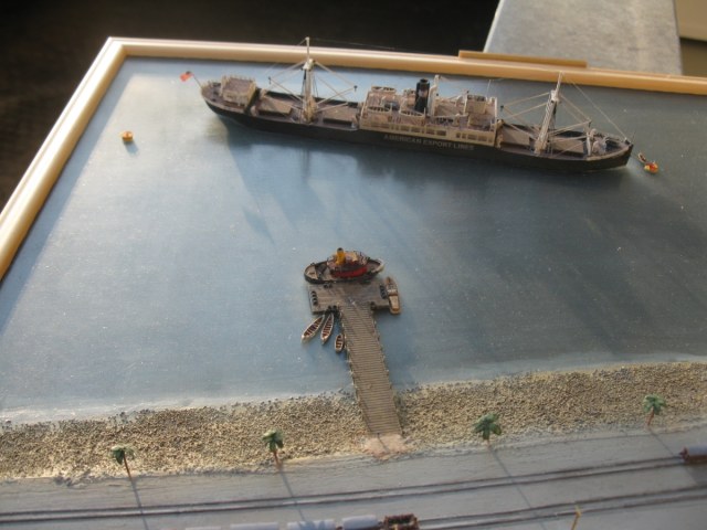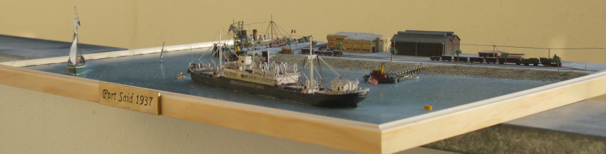 Эту модель я завершил в 2010 году. На ней изображен участок порта Порт Саида в Египте в довоенное время, конкретно угол набережной у Басин Шериф. Мелкий французский трамп стоит под погрузкой, а грузопассажир Эксилона компании Американ Экспорт Лайнз становится на бочку.