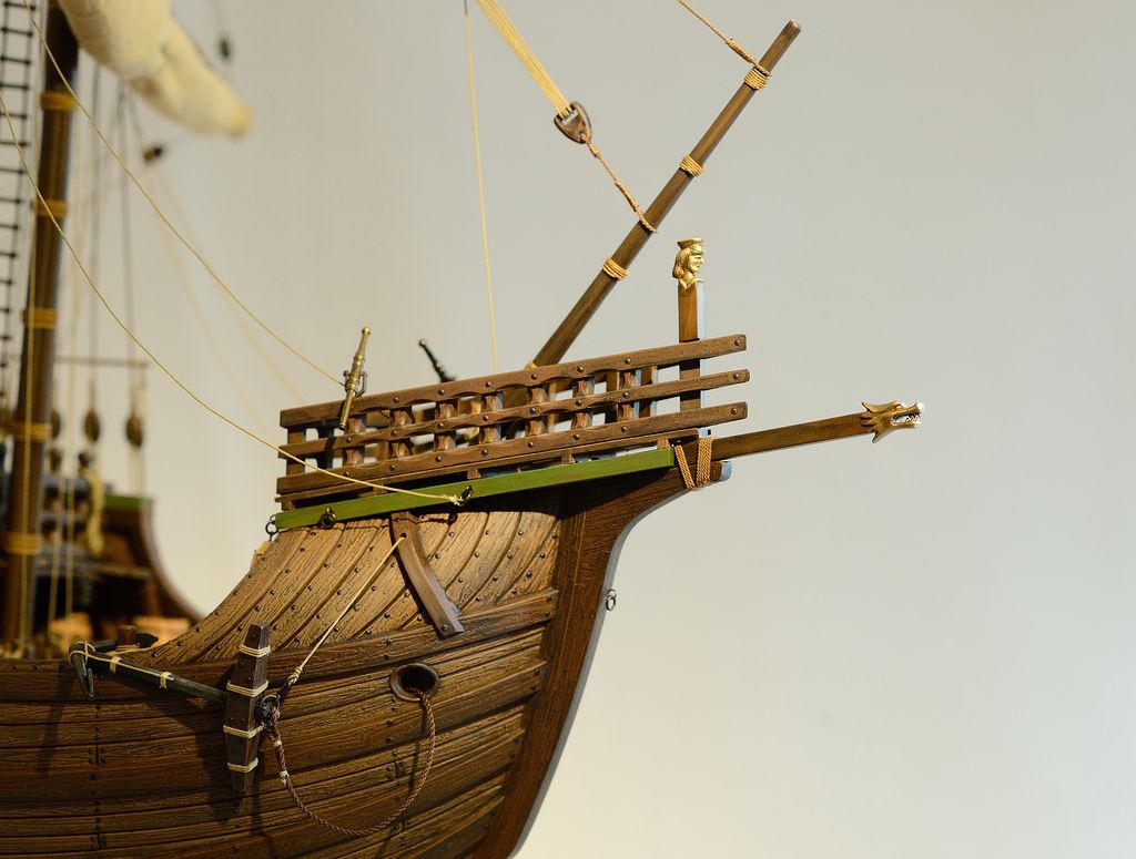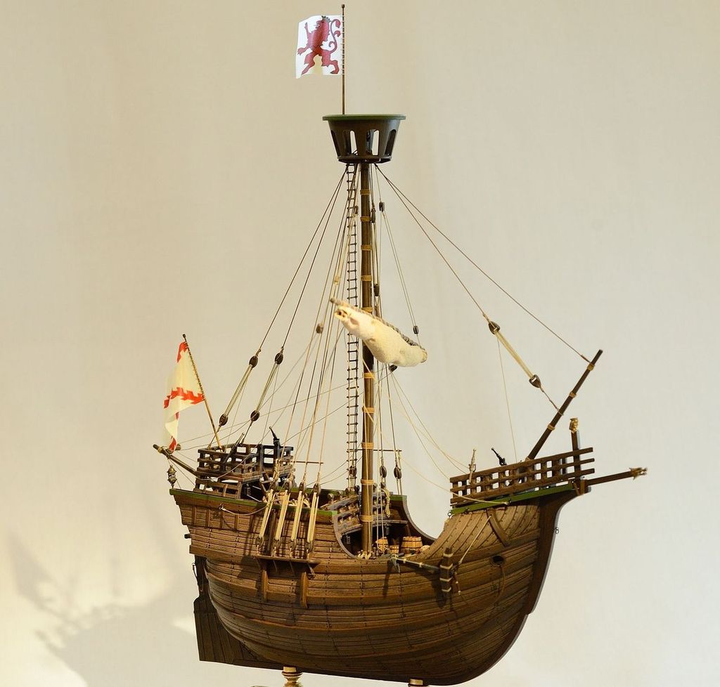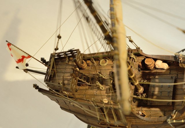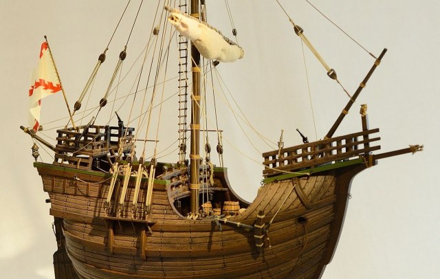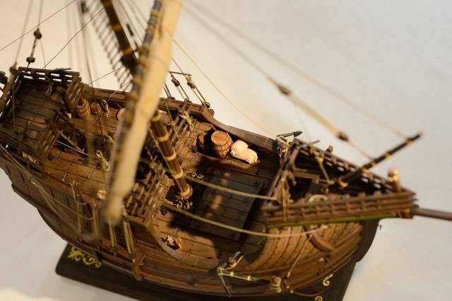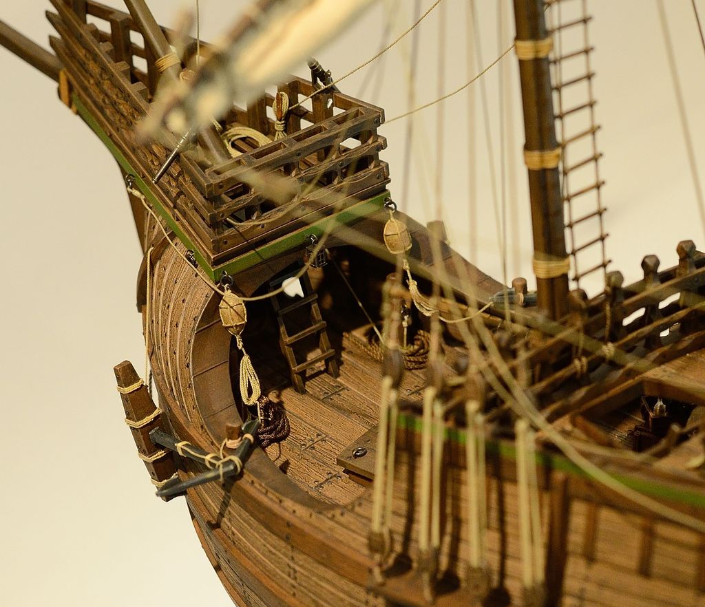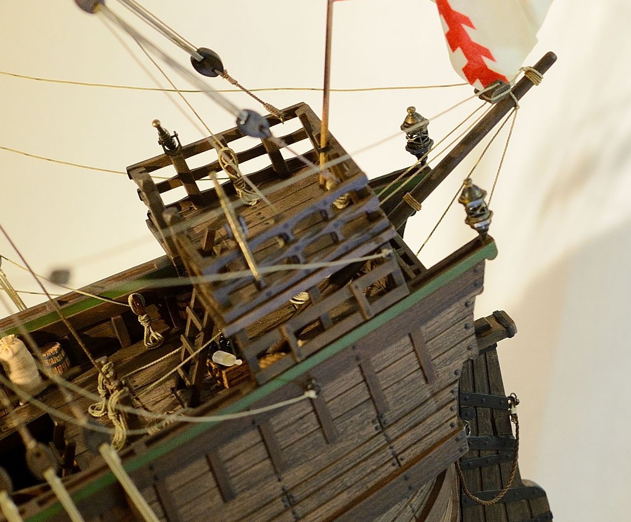 В оригинальной модели 15 века похоже, было 2 мачты - на корме в палубе есть отверстие, в которое раньше, скорее всего, была вставлена бизань мачта.