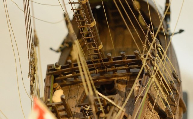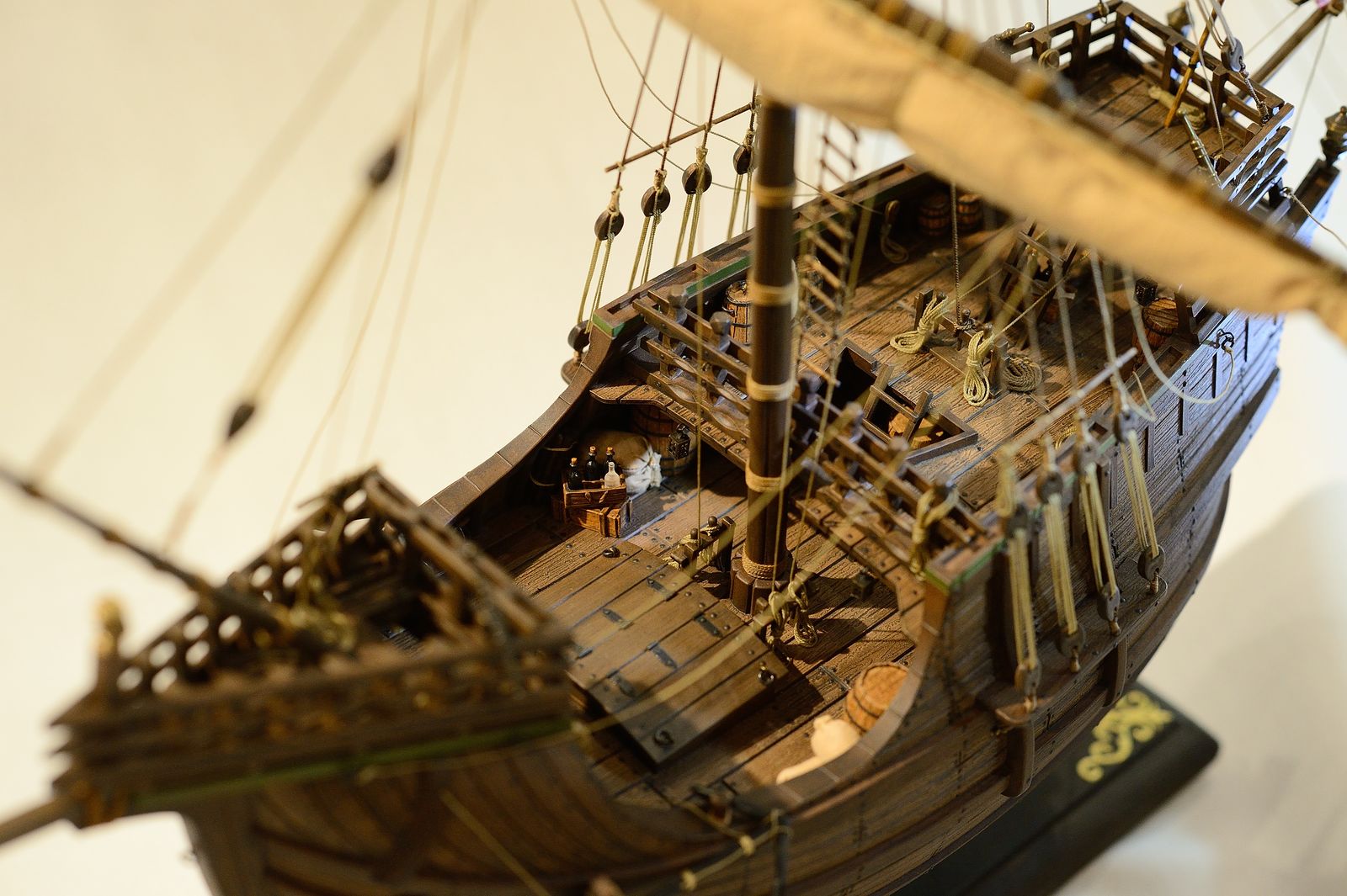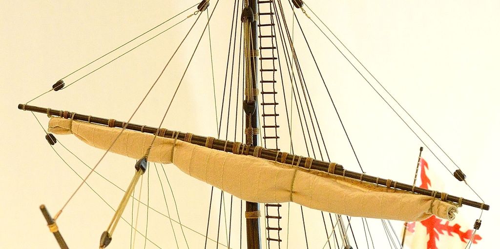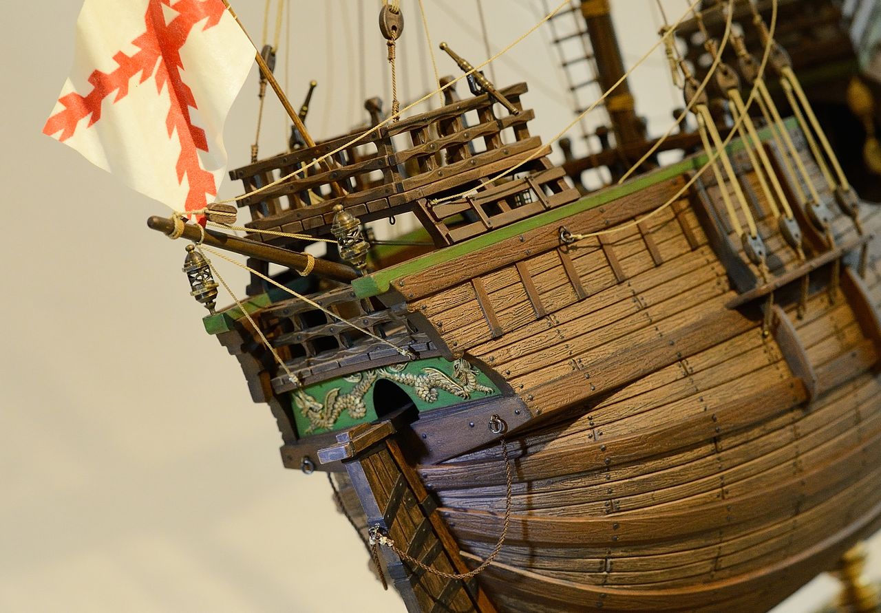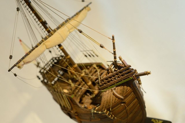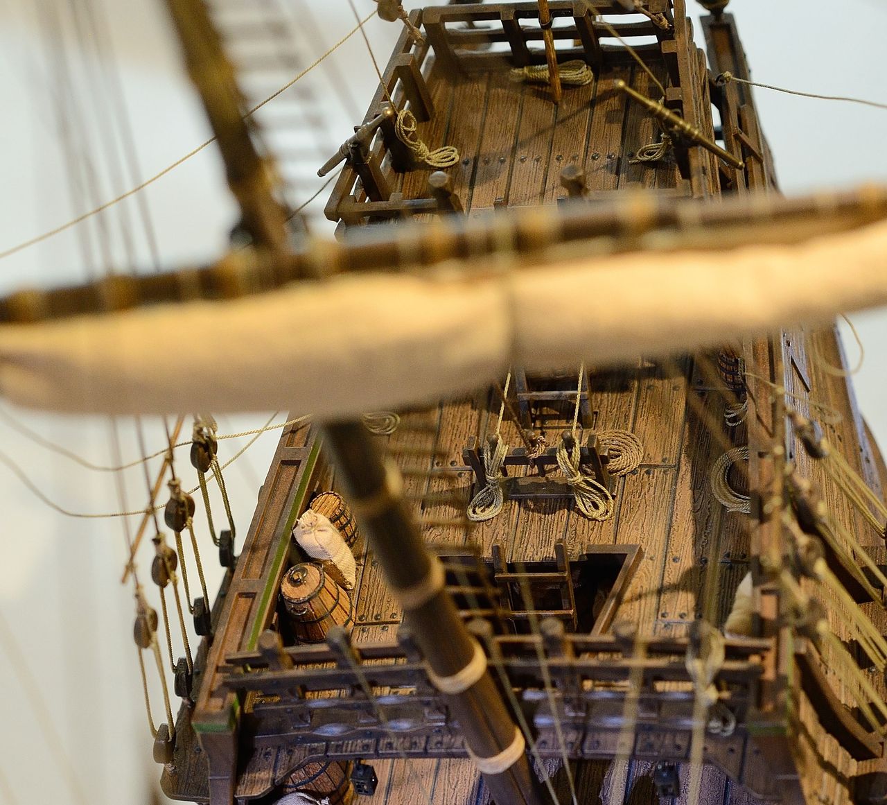 В оригинальной модели 15 века похоже, было 2 мачты - на корме в палубе есть отверстие, в которое раньше, скорее всего, была вставлена бизань мачта.