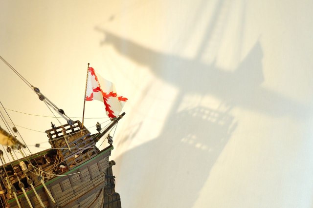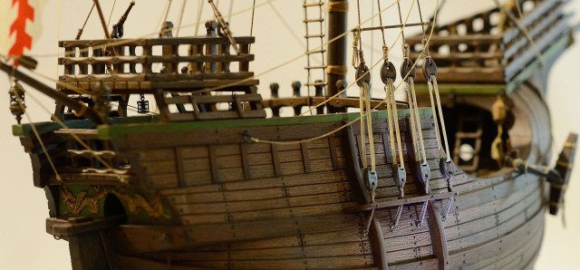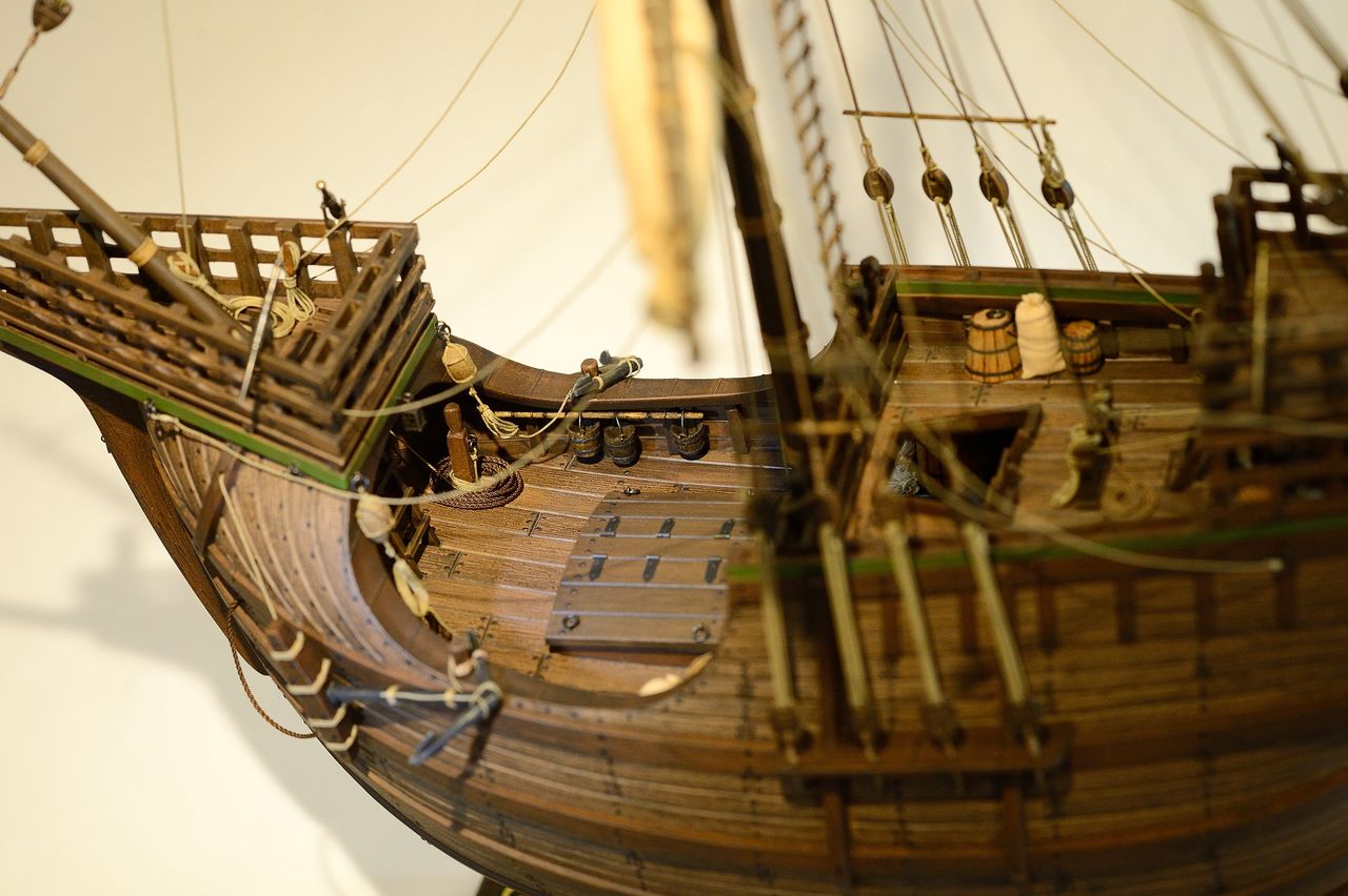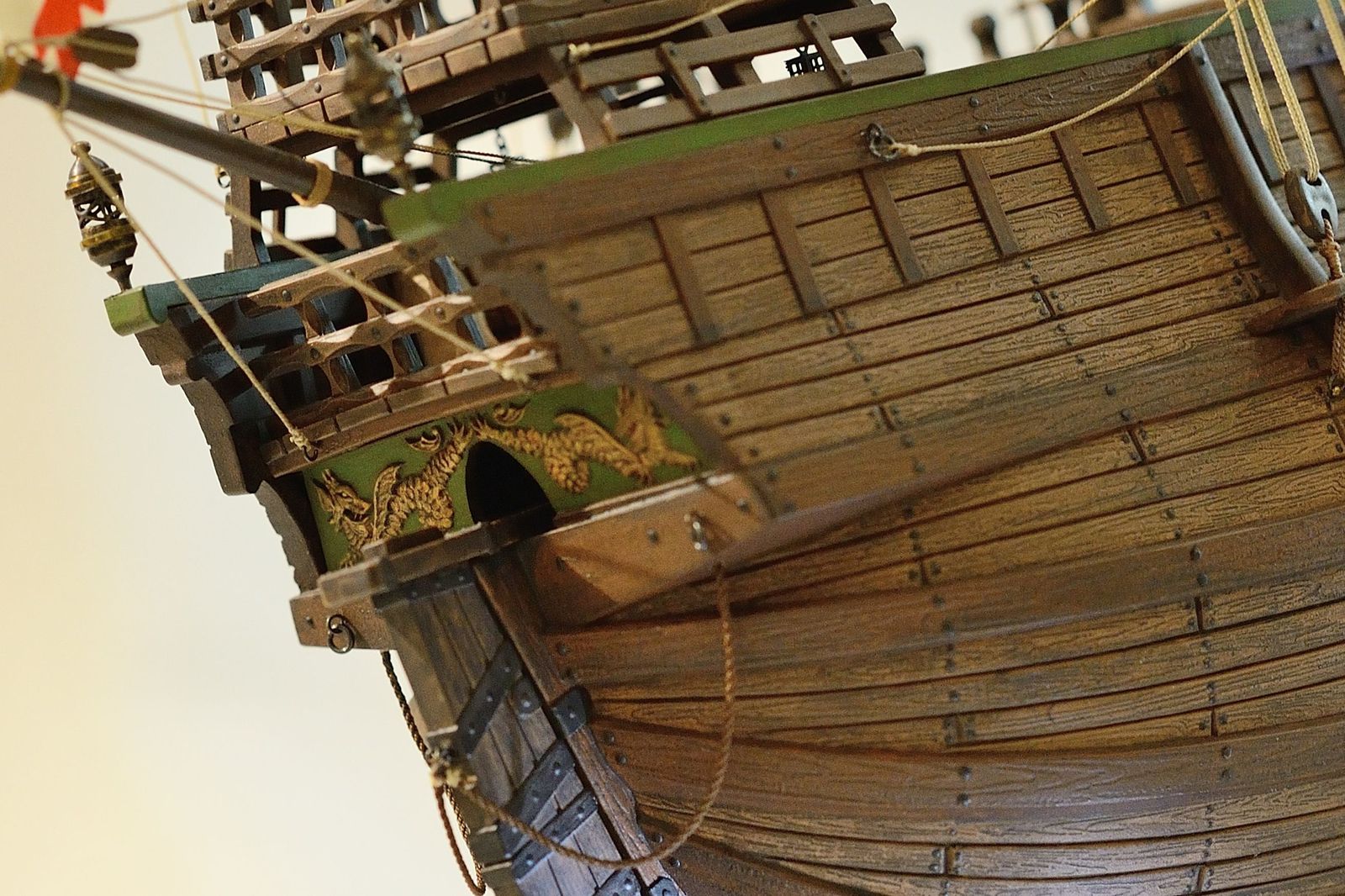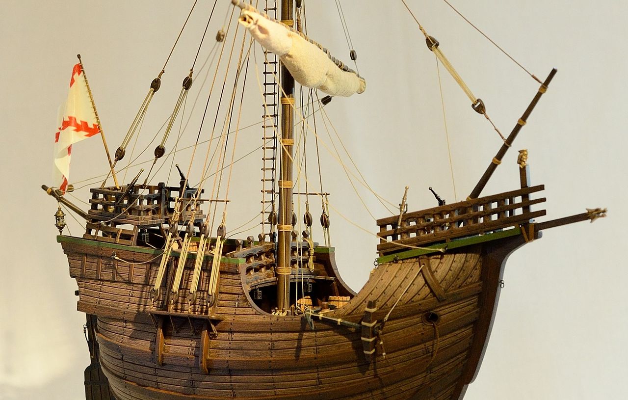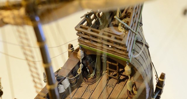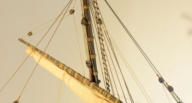 В оригинальной модели 15 века похоже, было 2 мачты - на корме в палубе есть отверстие, в которое раньше, скорее всего, была вставлена бизань мачта.