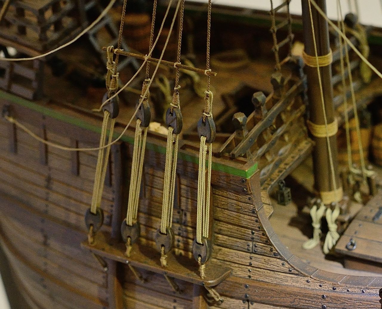 Доработки:1.гвоздевание корпуса2.замена пластиковых якорей на металл- якоря Amati с полной обвязкой ,устройством ,включая томбуй 3.стоячий, бегущий такелаж-тросомот(нить гутерман,амати,корел)4.рымы,блоки,нагеля,утки5.добавил фонари на корму,фонари судовые , фальконеты(Amati)6.бочки сборные (мир моделей),ящики,бутыли 7.парус,мешки,скрутки,веревочная лестница,петли,ведра,флаги(через термотрансферную бумагу на ткань) –самодел.