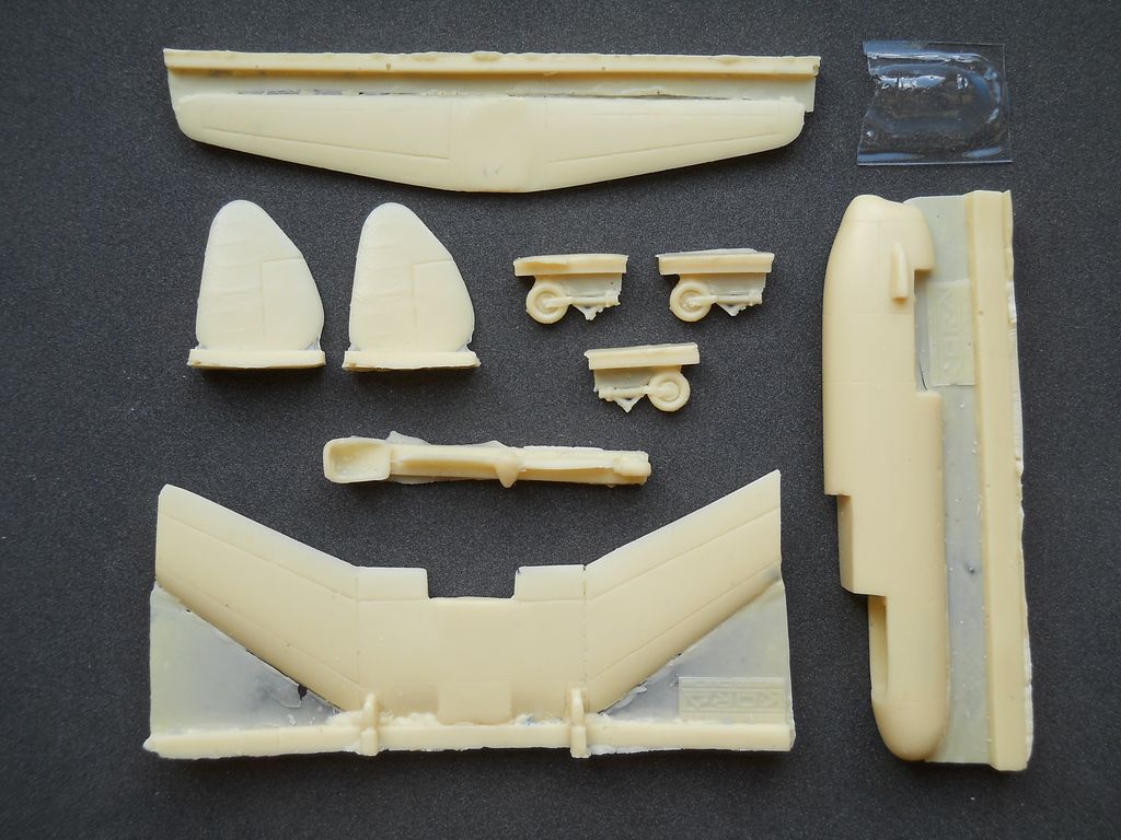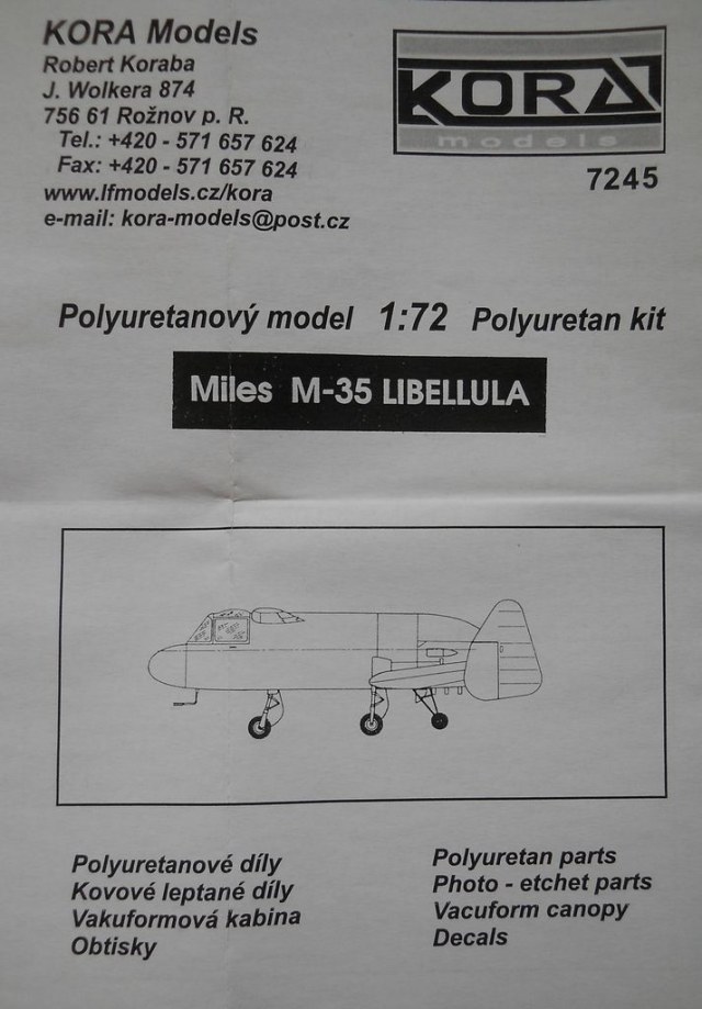 Модель из смолы от фирмы Kora в масштабе 1/72 (номер по каталогу 7245) упакована в небольшую картонную коробку с верхним открытием. Качество литья среднее. Фюзеляж выполнен цельным. Деталировка интерьера минимальна. Присутствует плата фототравления. Декали смотрятся хорошо. А вот ваку-фонарь придётся выдавливать заново. Инструкция минимальна по информации.