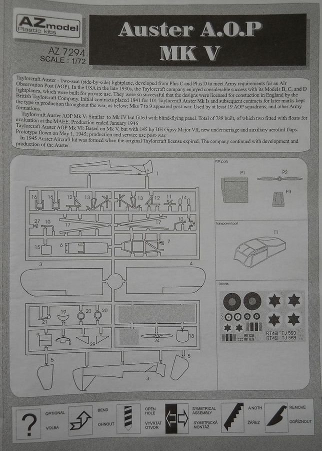 Модель от AZ model в масштабе 1/72 (номер по каталогу 7293). В данном наборе представлена модификация самолёта AOP Mk.V. ЛНД – неплохого качества. Имеются смоляные детали. Фонарь кабины выглядит отлично. Декаль присутствует на четыре варианта самолёта. Инструкция достаточно информативна и наглядна.
