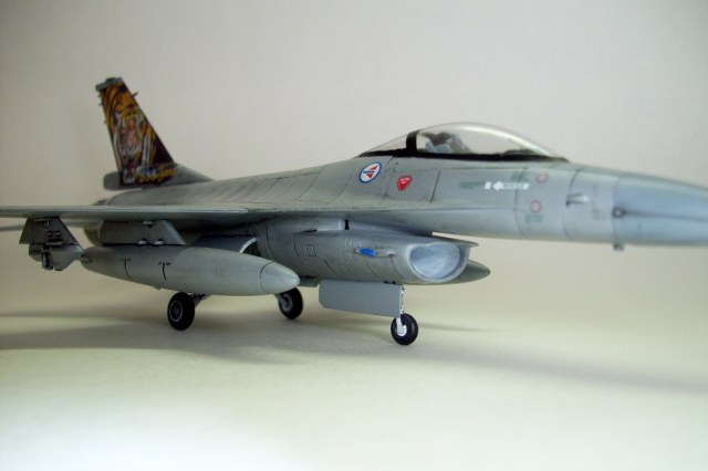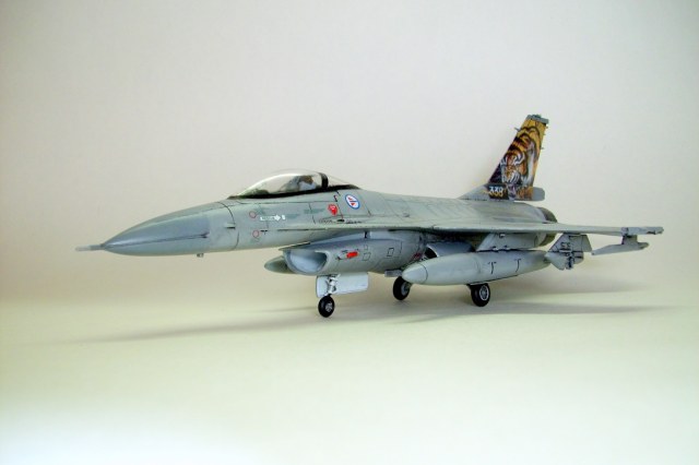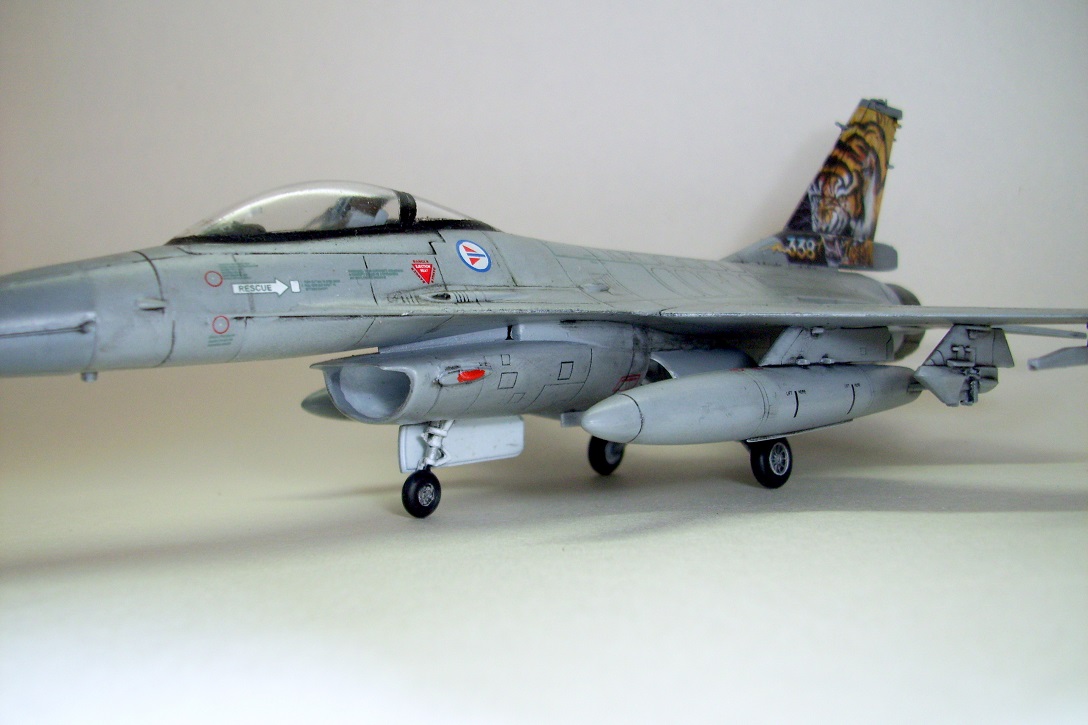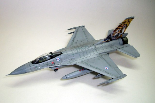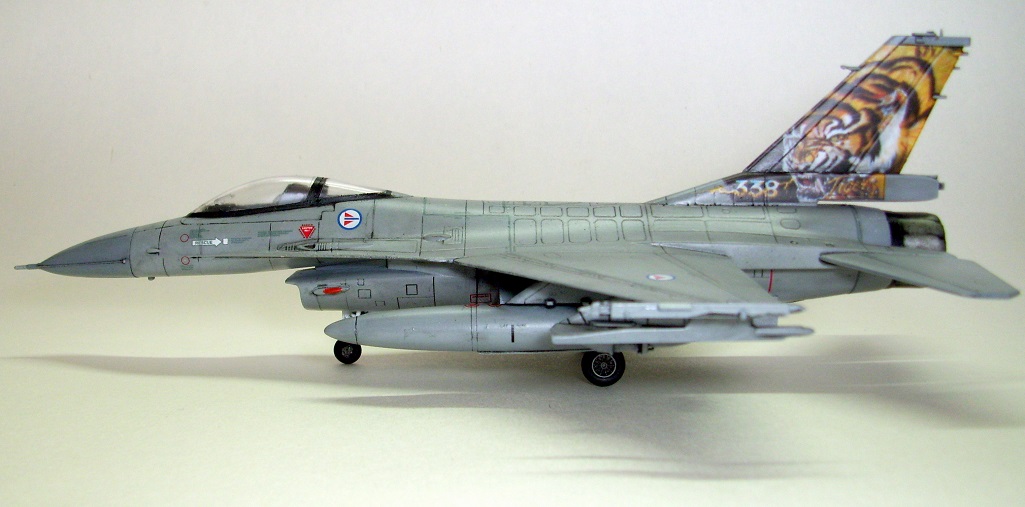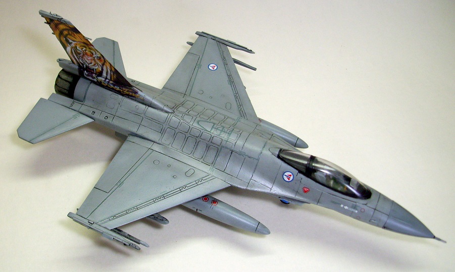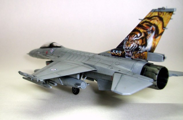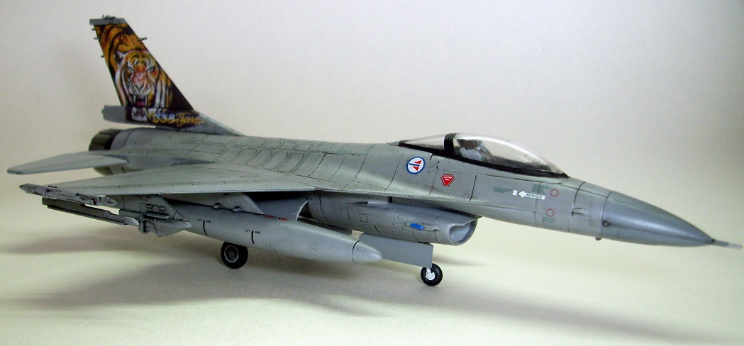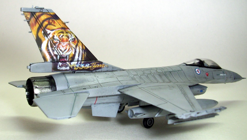 Представляю на ваш суд очередную мою модель: F-16A Fighting Falcon Норвежских ВВС, участника учений НАТО "Tiger meet 2004". Tiger Meet - это военные учения стран-членов НАТО, являющиеся самыми большими учениями военно-воздушных сил альянса в Европе. Ассоциация эскадрилий тигров (Association of Tiger Squadron) была создана в 1959 г . Инициатива исходила от французов, точнее от тогдашнего премьер-министра Франции М. Мессне. Цель налаживание дружеских, человеческих контактов между летчиками эскадрилий ВВС стран участниц блока НАТО. С 61 года инициатива была подхвачена американцами. Ими и была организована первая встреча тигров «Тайгермит» - в Великобритании на авиабазе Вудбридж. Произошло это 19 июля в 1961 г., с участием трех эскадрилий из состава 74-й эскадрильи Королевских ВВС Великобритании , 79-ой тактической истребительной эскадрильи ВВС США в Европе и эскадрильи ЕС-1/12 ВВС Франции. На бортах самолетов красовалась эмблема с изображением тигра. Именно тигр служит примером скорости, силы и охотничьего азарта- как раз эти качества и присущи летчикам истребителям. Встреча летчиков прошла успешно, и ученья «Тайгер мит» стали проводить ежегодно. Причем уже с следующего 1962 года, «покатушки» прибрели официальный статус учений НАТО. В ходе которых отрабатывается весь спектр применения авиации, от дозаправки в воздухе, до применения средств поражения установленных на самолетах.