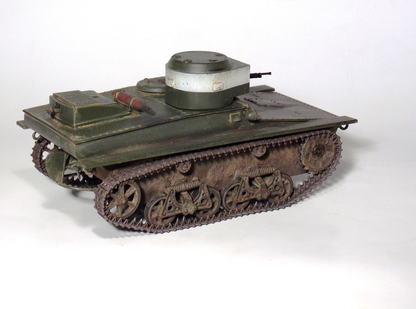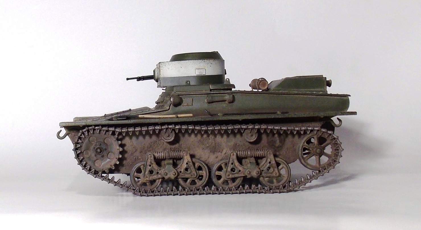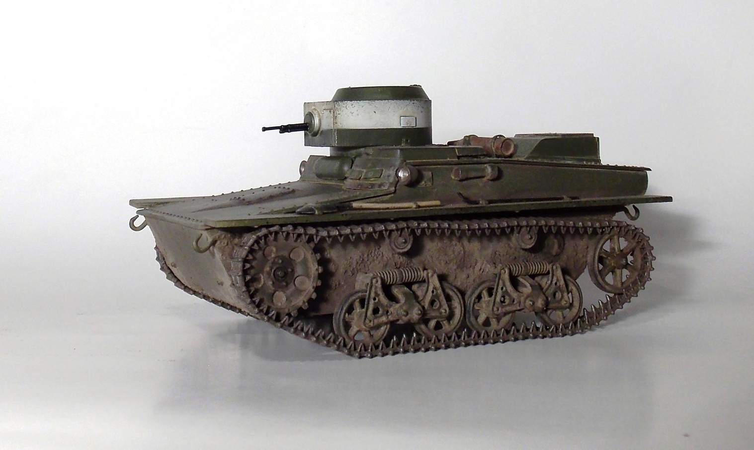 Представляю вашему вниманию очередную модель.Т-37 ,окрас под Большие Киевские маневры 1935 г.Захотелось сделать грязный танк,с объемной грязью.По качеству изготовления модели претензий нет,разве что траки очень мелкие и отделить их от литника идеально ровно не получается.В идеале надо каждый трак обработать.Ну и фара.Просто литой кусок пластика. Травло положить китайцы смогли,а к фаре кусок пластика прозрачного нет.Фару высверливал ,стекло имитировал лаком.