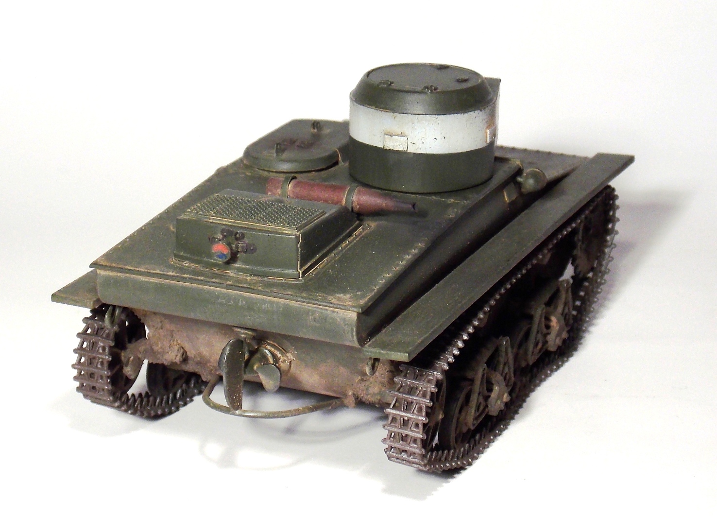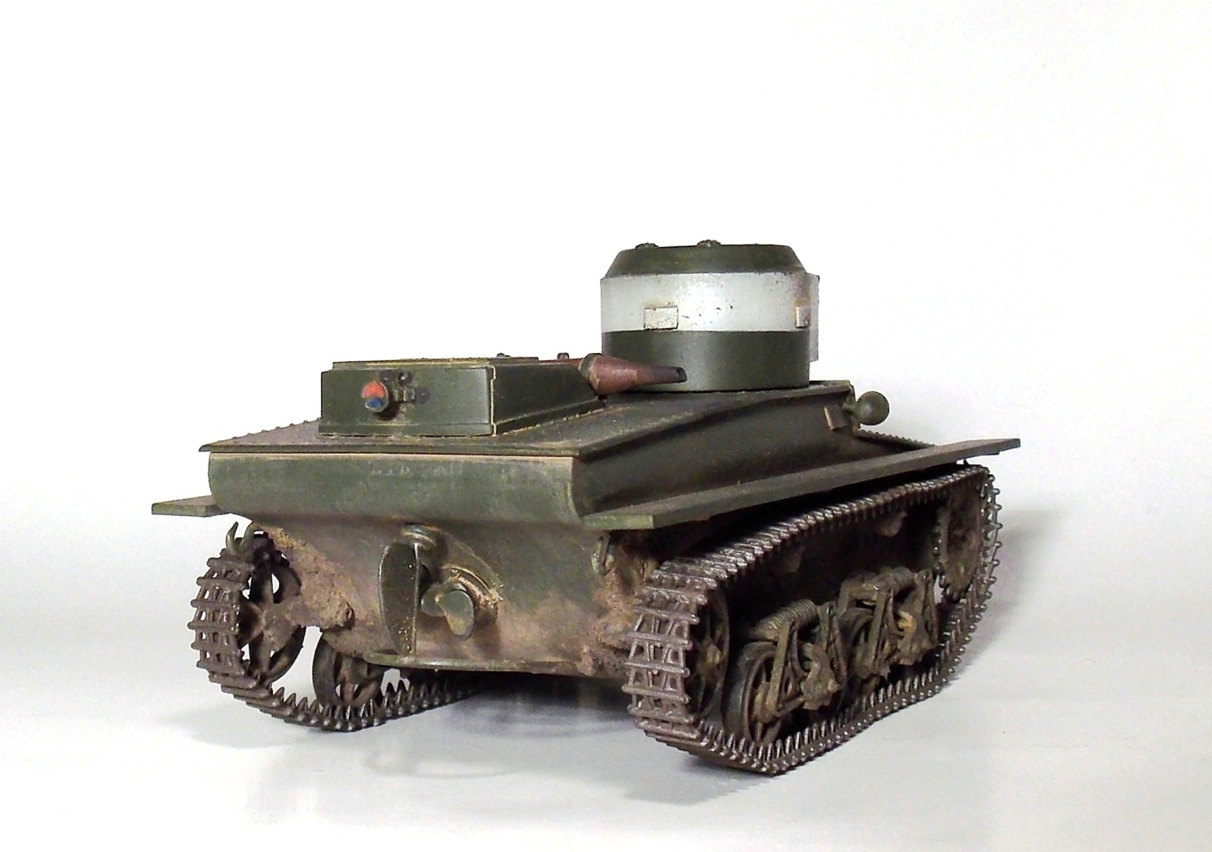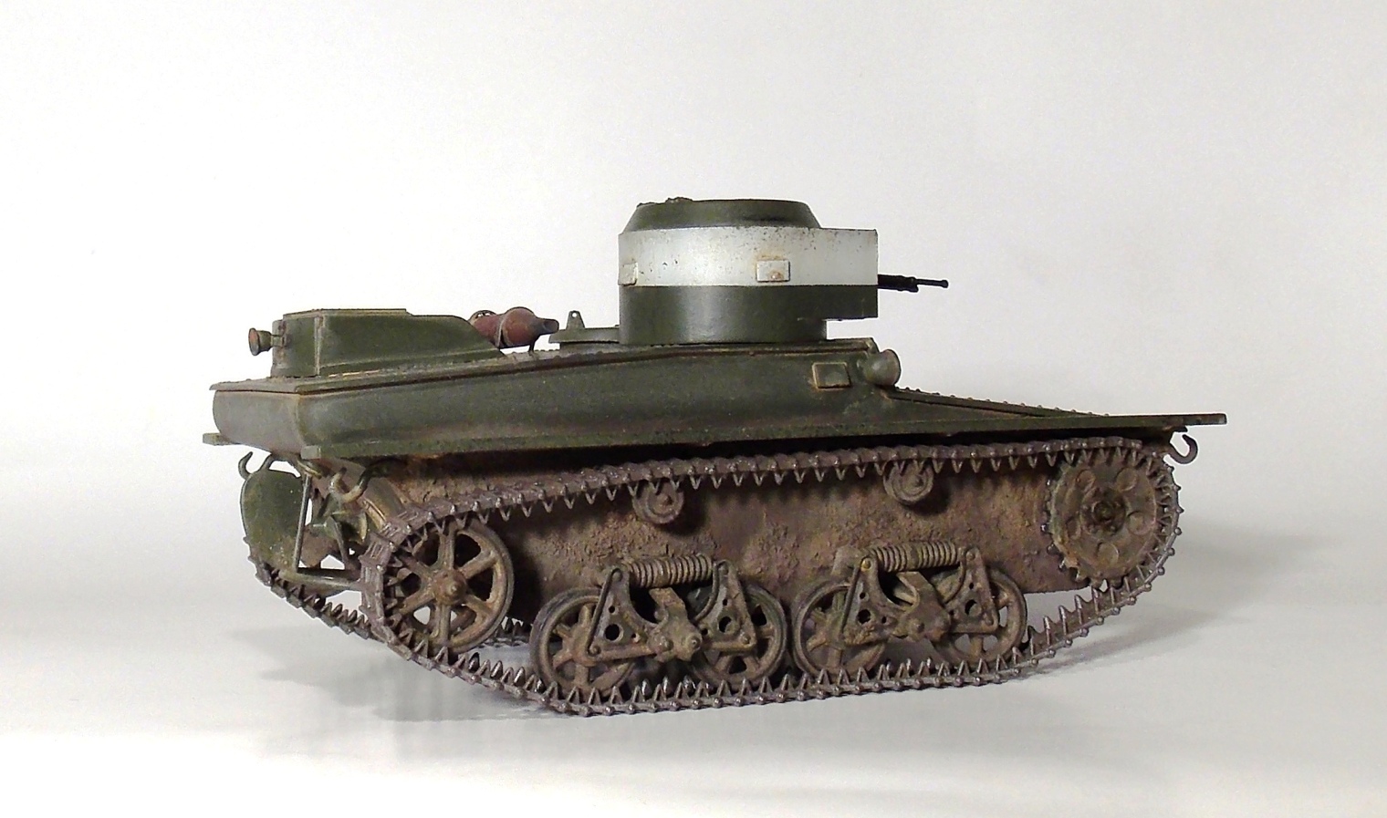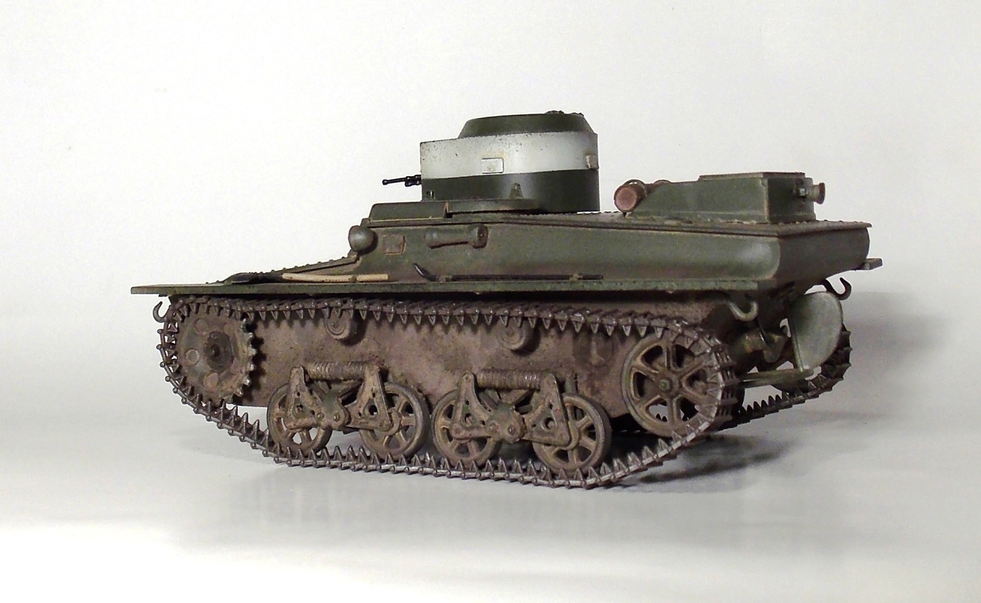 Представляю вашему вниманию очередную модель.Т-37 ,окрас под Большие Киевские маневры 1935 г.Захотелось сделать грязный танк,с объемной грязью.По качеству изготовления модели претензий нет,разве что траки очень мелкие и отделить их от литника идеально ровно не получается.В идеале надо каждый трак обработать.Ну и фара.Просто литой кусок пластика. Травло положить китайцы смогли,а к фаре кусок пластика прозрачного нет.Фару высверливал ,стекло имитировал лаком.