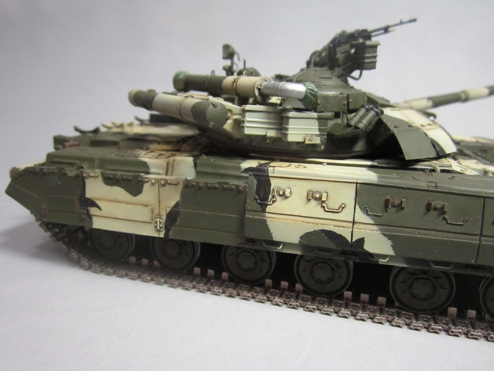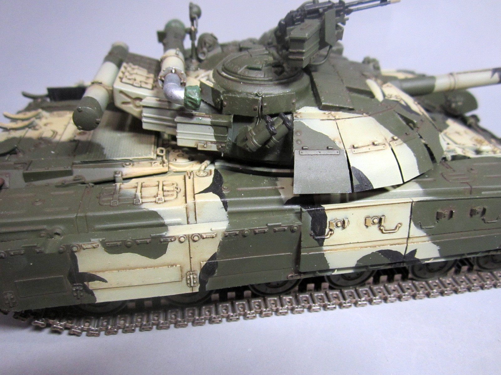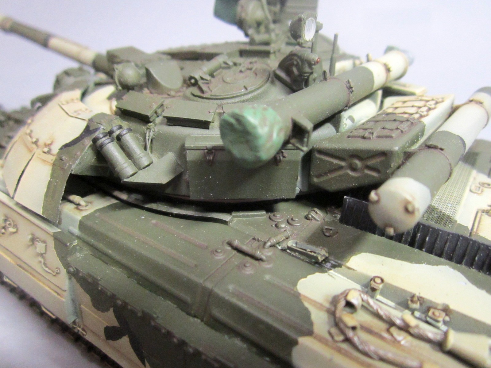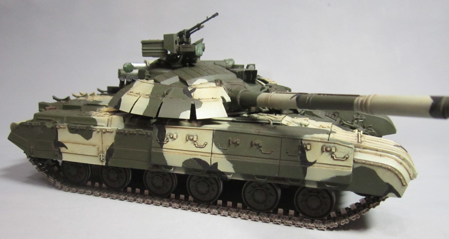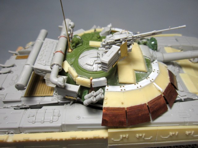Такой вот "франкенштейн": корпус - Т-64Б "Trumpeter", башня и смола - "Скиф", гусеницы - Sector35, всякие остатки из запасов, немного самодела. Башню от "Скифа" использовал по двум причинам: наличие надбоя и она лучше "заточена" под предлагаемый смоляной обвес (блоки ДЗ). Но подгонять "по месту" пришлось все равно. Собрать башню с ДЗ по инструкции - не удастся :-)