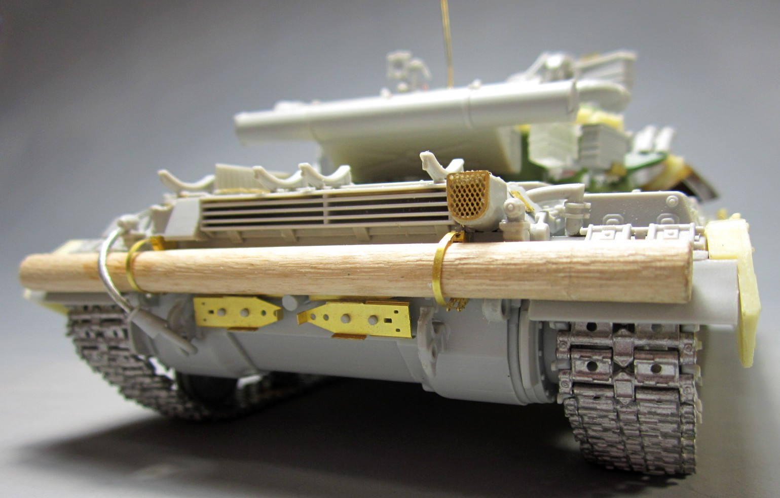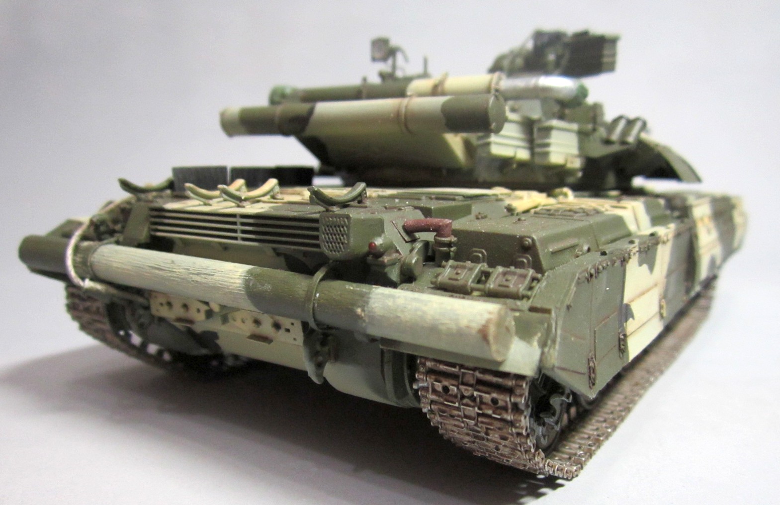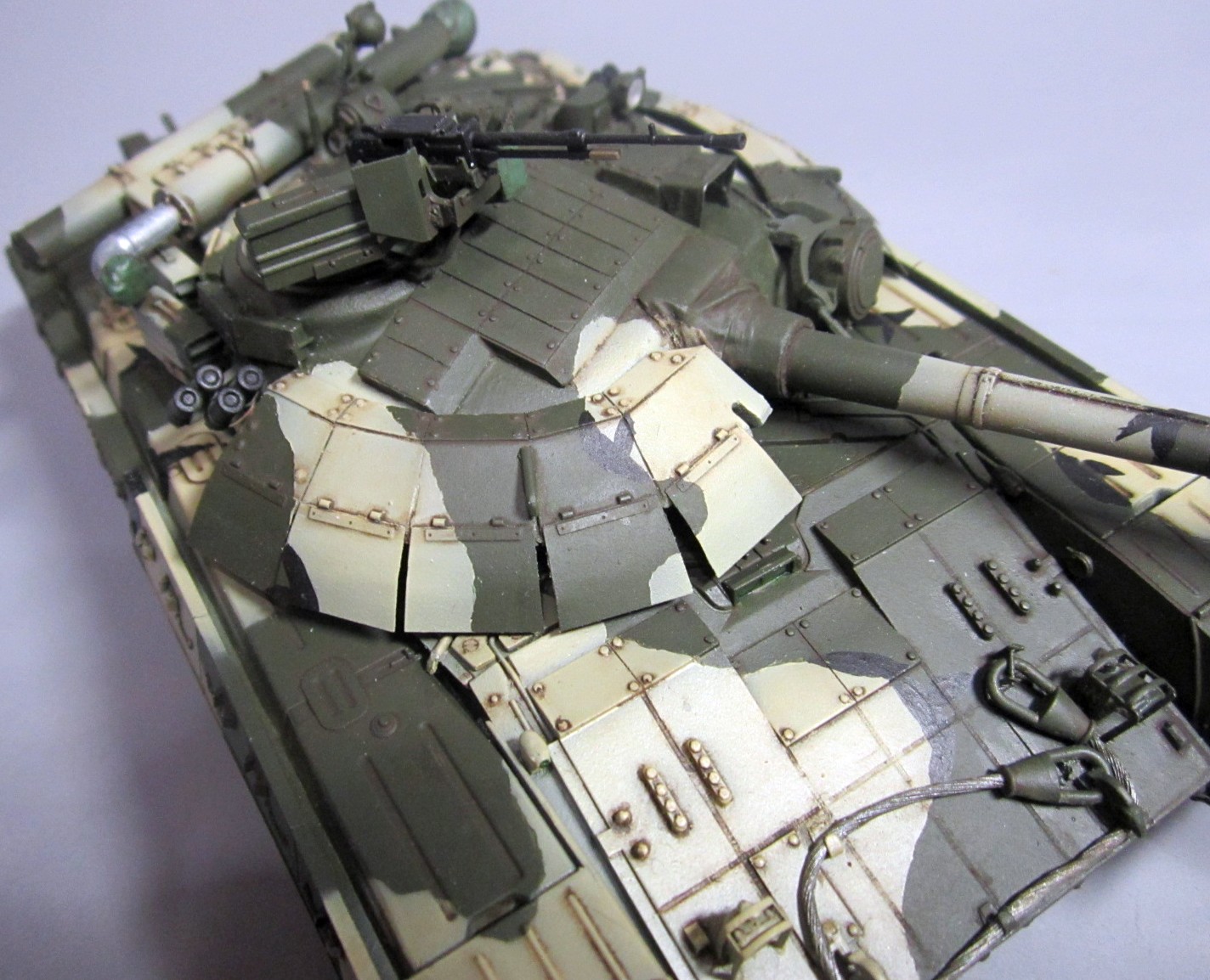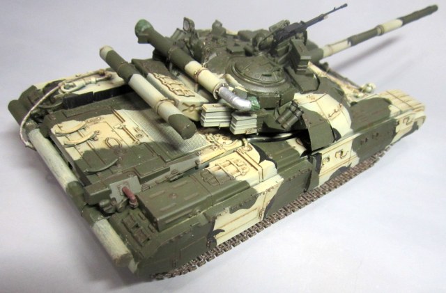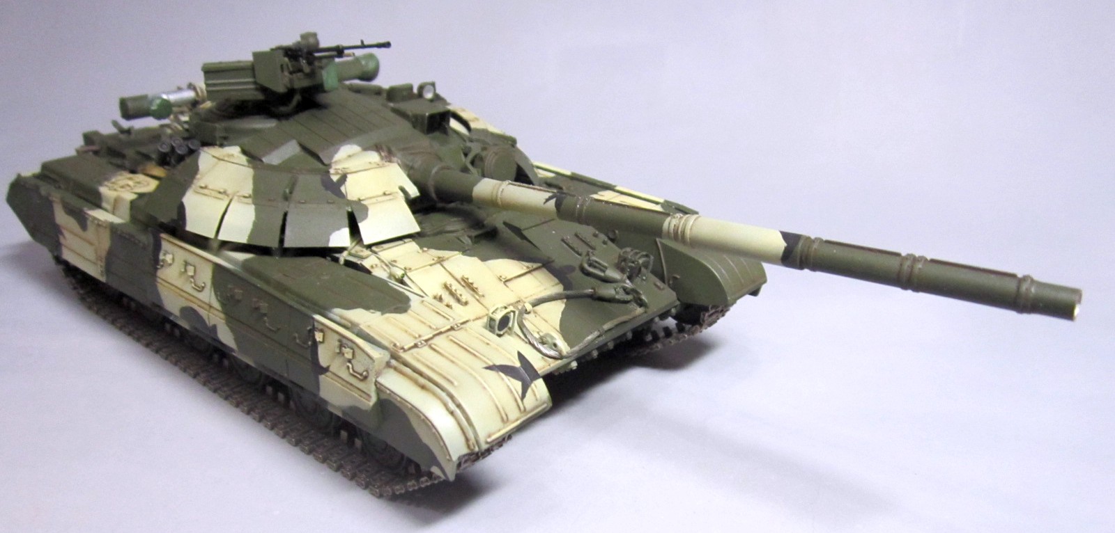 Такой вот "франкенштейн": корпус - Т-64Б "Trumpeter", башня и смола - "Скиф", гусеницы - Sector35, всякие остатки из запасов, немного самодела. Башню от "Скифа" использовал по двум причинам: наличие надбоя и она лучше "заточена" под предлагаемый смоляной обвес (блоки ДЗ). Но подгонять "по месту" пришлось все равно. Собрать башню с ДЗ по инструкции - не удастся :-)