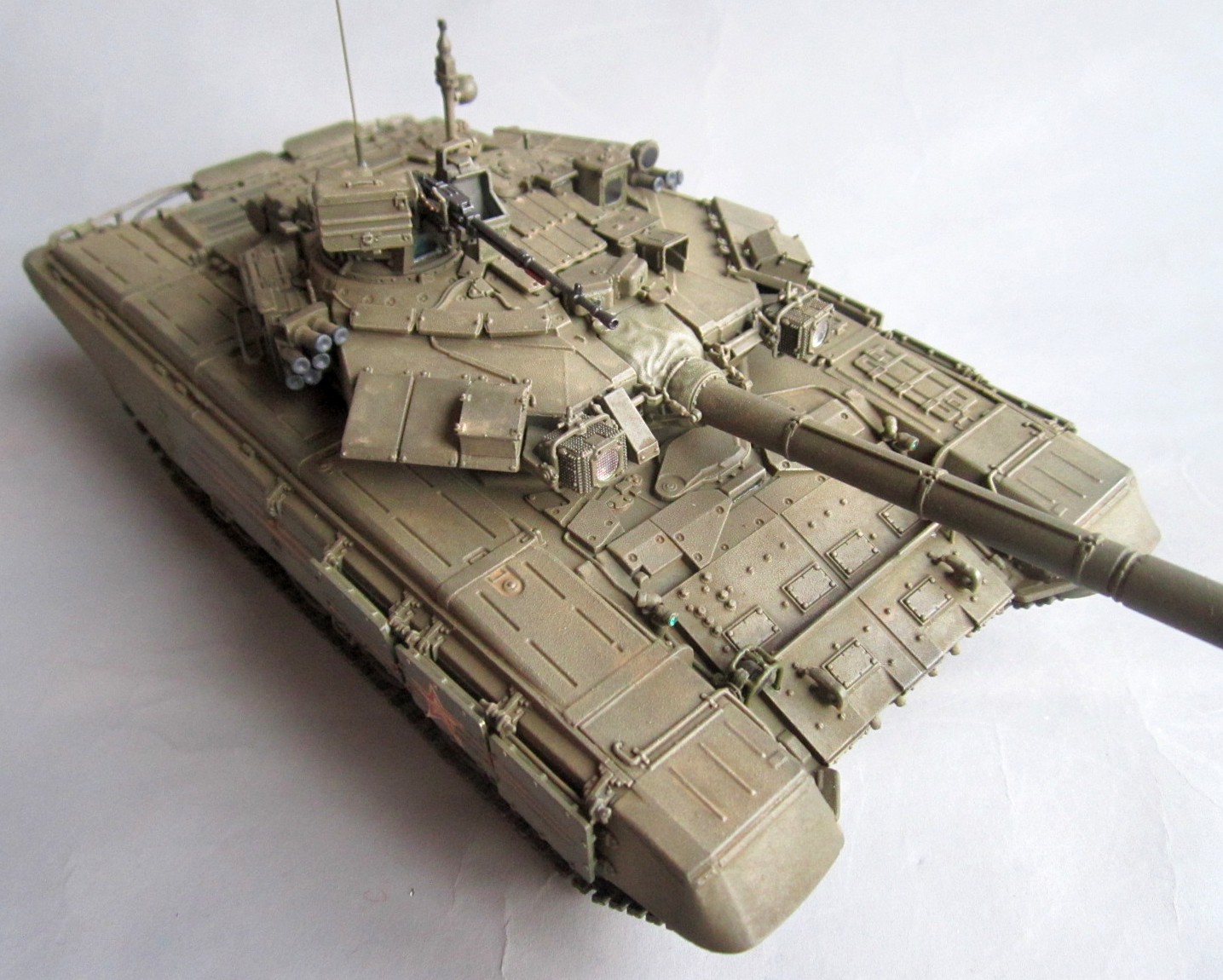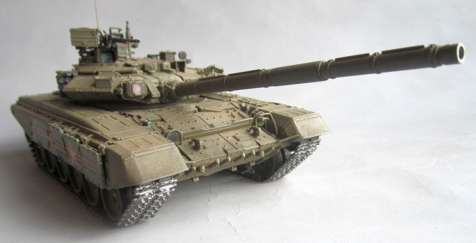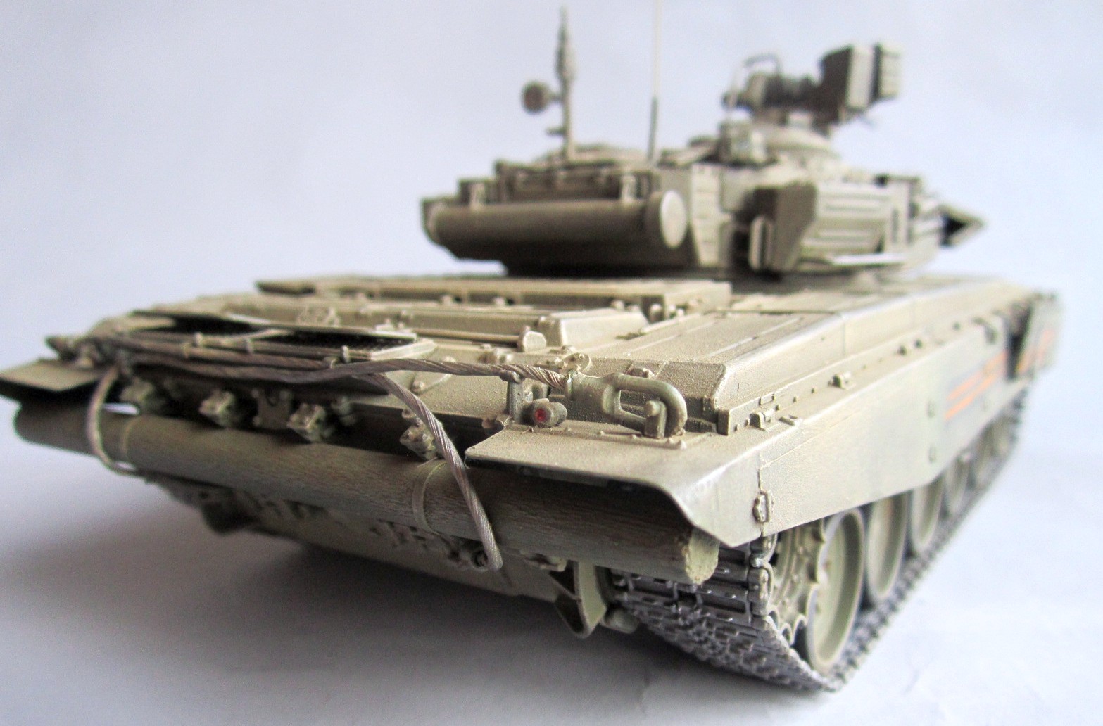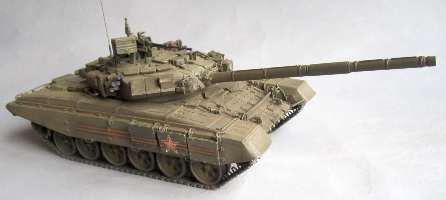 Мое пополнение в танковую бригаду Т-девяностых на "каропке". Модель собрана давным-давно. Она из первой партии появившихся в продаже в нашем регионе. Сборка - изкоробочная. Помню, что немного стачивал борта корпуса по высоте и "приподнимал" погон башни. Потом модель в собранном виде, но не окрашенная, на долго ""прилипла" к полке. В покраску попала буквально пару недель назад. Вариант окраски навеяло фото Т-90 с прошлогодней выставки в Жуковском. Но у меня получился вариант более затасканный, как будто машину усиленно гоняли с августа прошлого года по настоящее время :-) Одним словом - в оттенок не попал. Звезды-полосы на бортах рисовал аэром, а подправлял кистью (чем и испортил!).