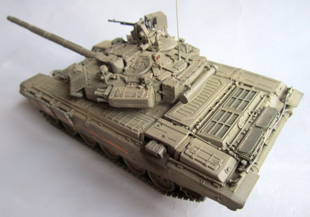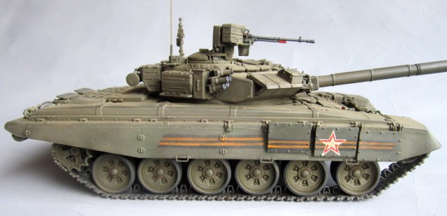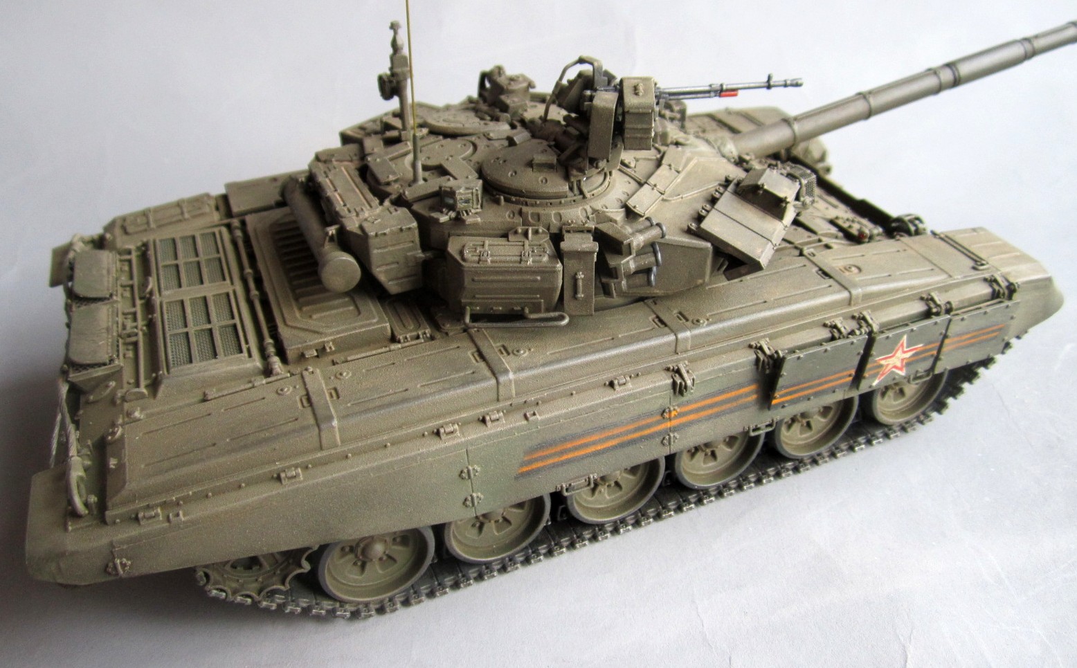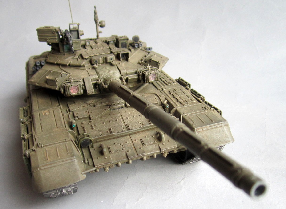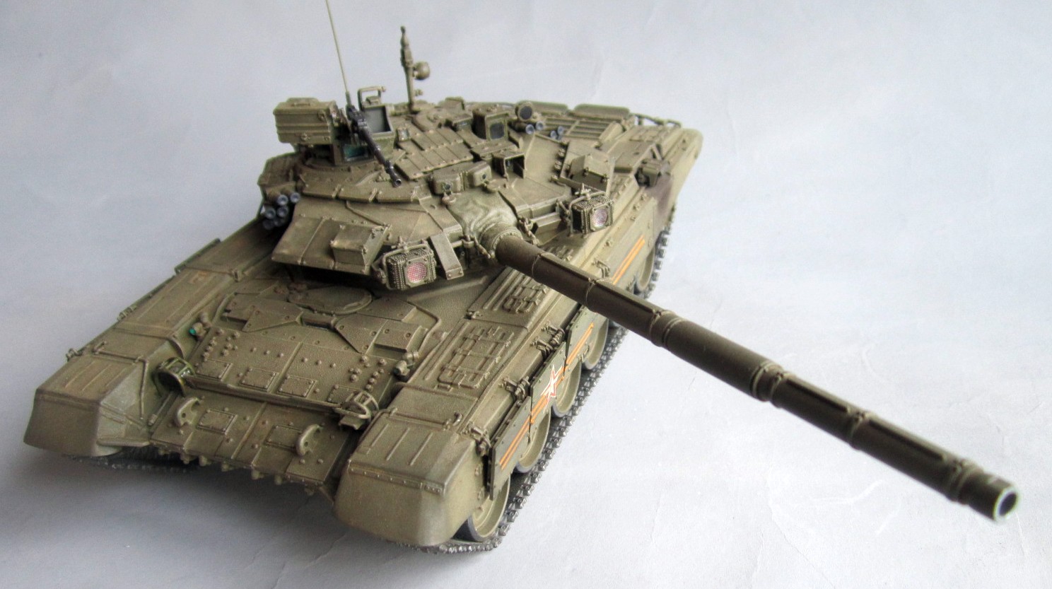 Мое пополнение в танковую бригаду Т-девяностых на "каропке". Модель собрана давным-давно. Она из первой партии появившихся в продаже в нашем регионе. Сборка - изкоробочная. Помню, что немного стачивал борта корпуса по высоте и "приподнимал" погон башни. Потом модель в собранном виде, но не окрашенная, на долго ""прилипла" к полке. В покраску попала буквально пару недель назад. Вариант окраски навеяло фото Т-90 с прошлогодней выставки в Жуковском. Но у меня получился вариант более затасканный, как будто машину усиленно гоняли с августа прошлого года по настоящее время :-) Одним словом - в оттенок не попал. Звезды-полосы на бортах рисовал аэром, а подправлял кистью (чем и испортил!).