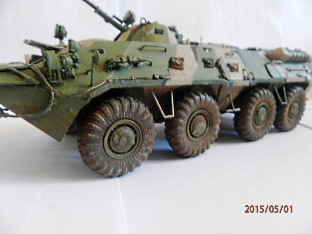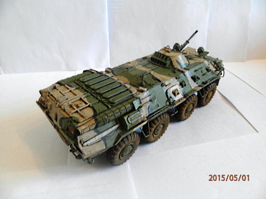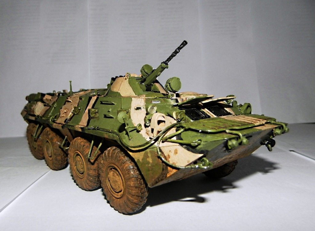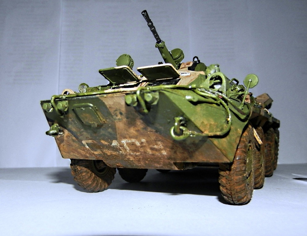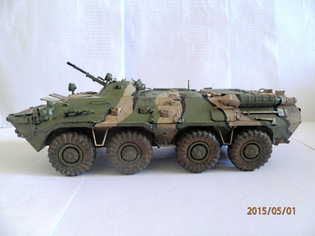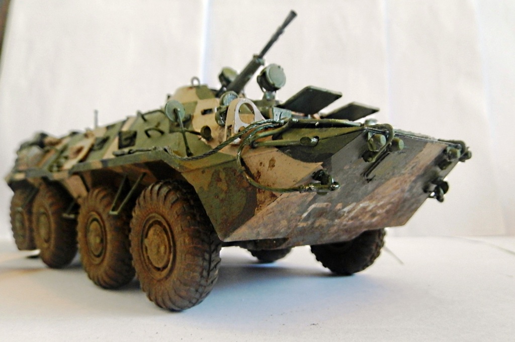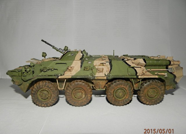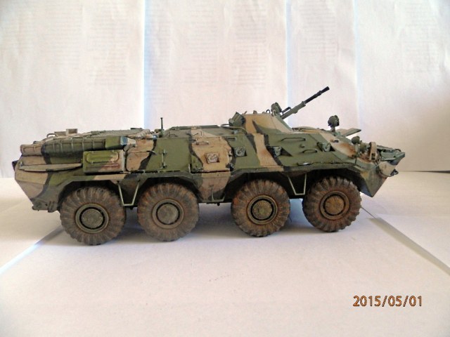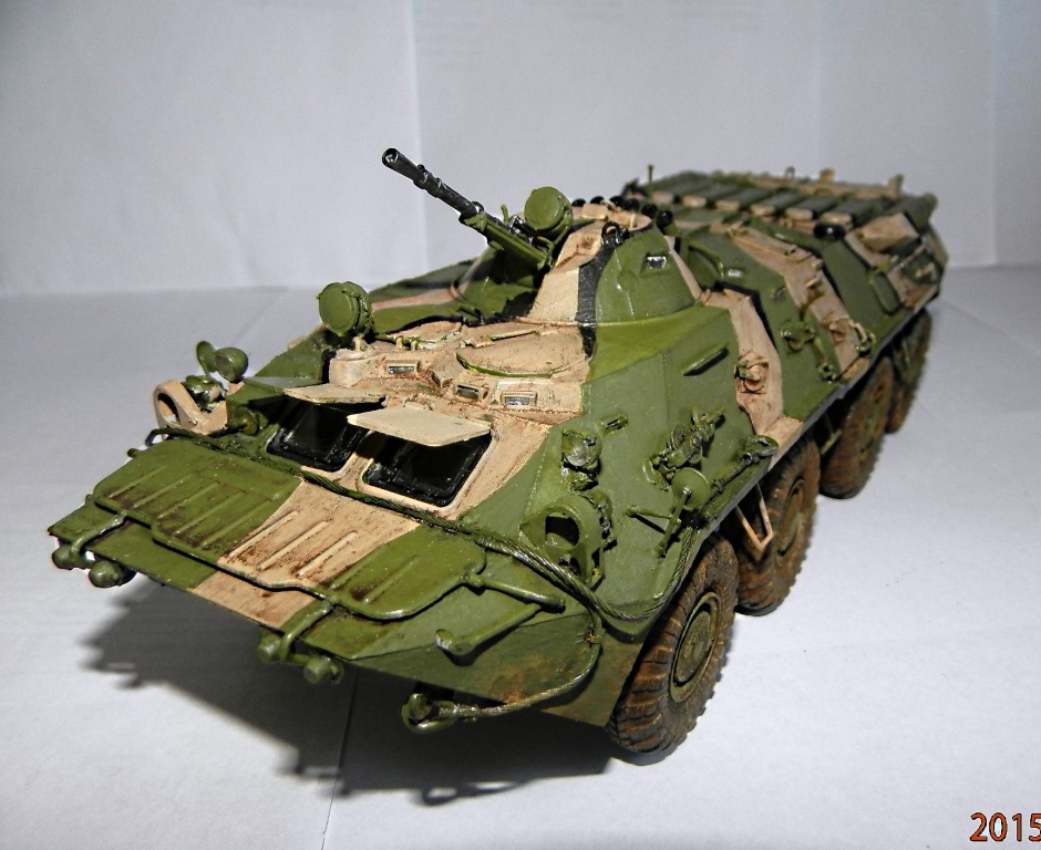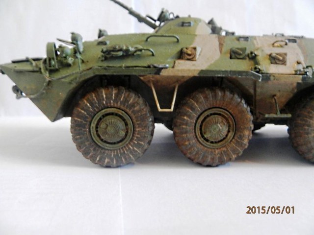Изкоробочный БТР - 80. Мой первый опыт по нанесению пигментов. Попробовал сделать грязь, как получилось - судить вам. Окрашено кистью акрилом от Tamiya. Использован фильтр "Mig", смывка с двумя звёздами на банке (Tamiya?), пигменты ZIP maket и MIG. Делал с января по апреля 2015 года. Камуфляж нанесён, опираясь на одну из схем окраски и рисунок на коробке.