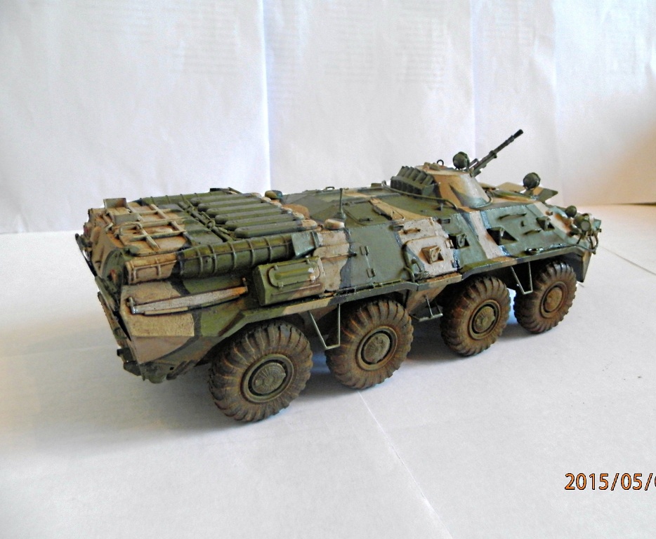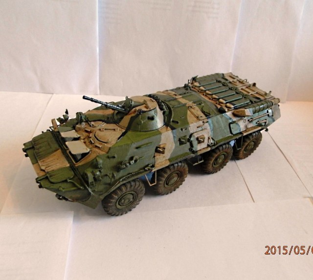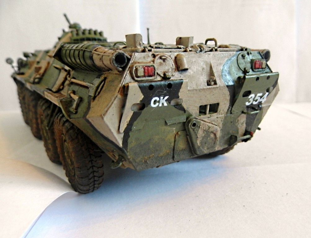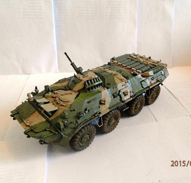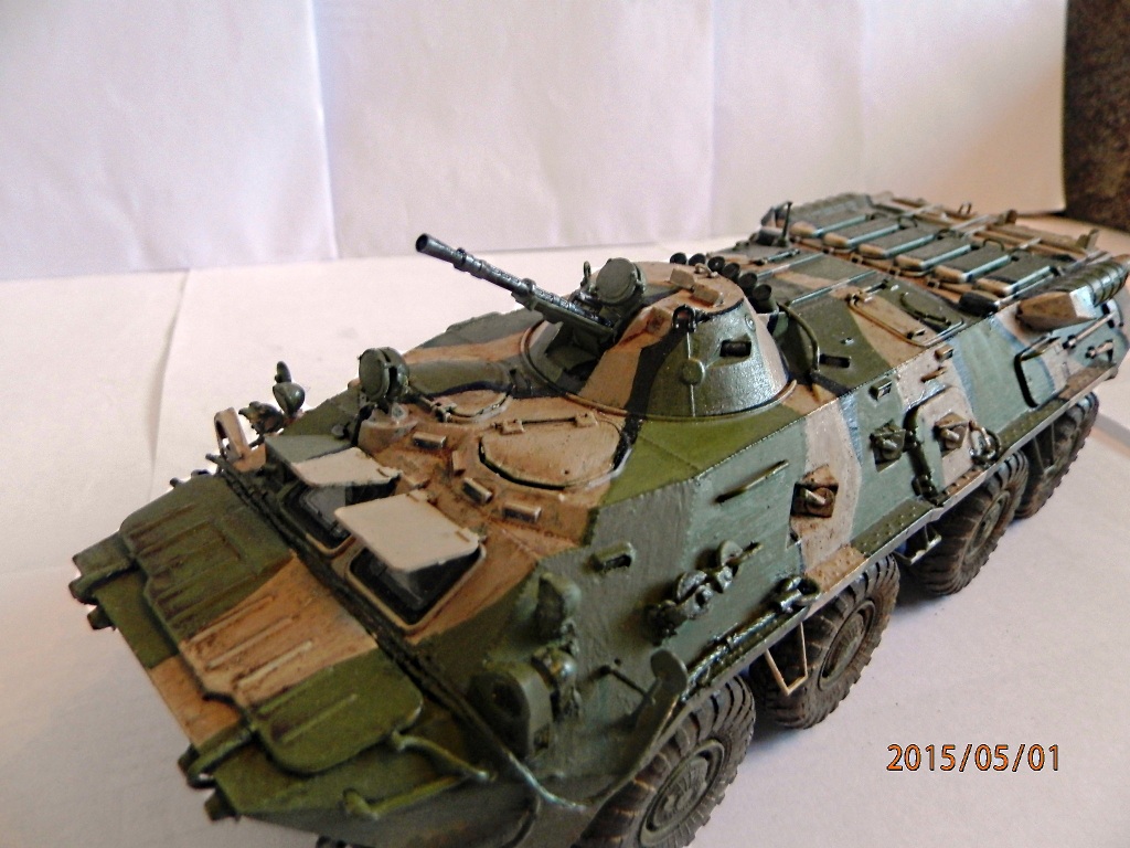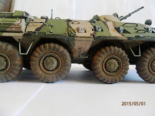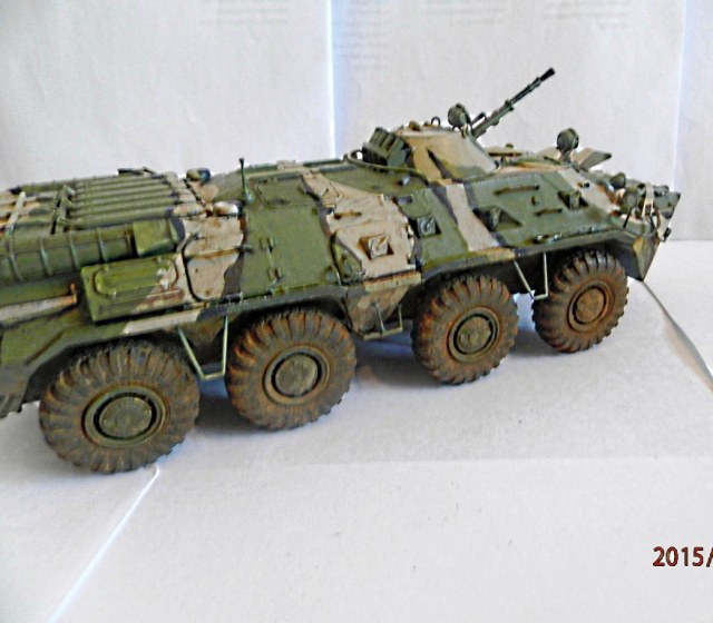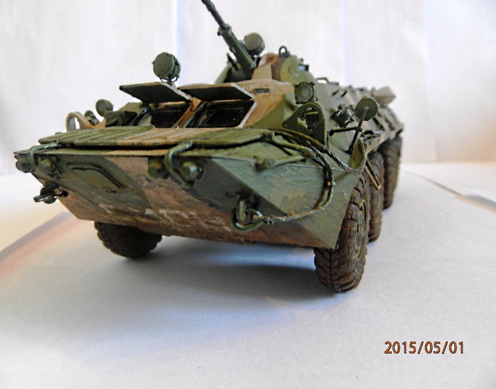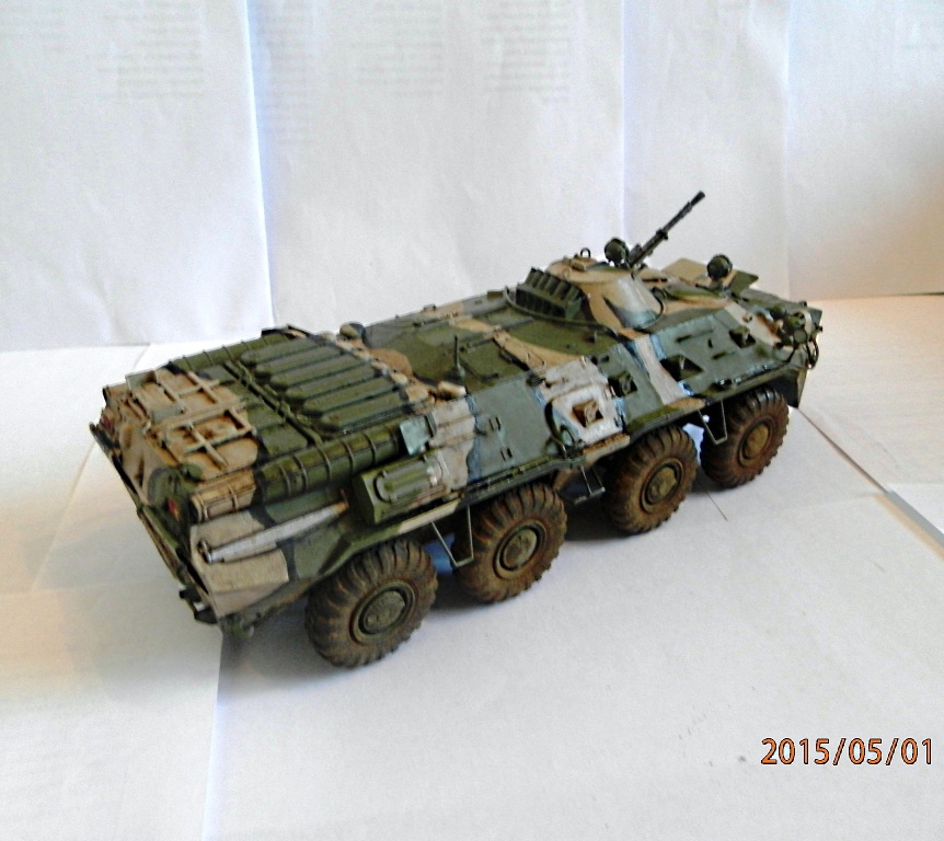 Изкоробочный БТР - 80. Мой первый опыт по нанесению пигментов. Попробовал сделать грязь, как получилось - судить вам. Окрашено кистью акрилом от Tamiya. Использован фильтр "Mig", смывка с двумя звёздами на банке (Tamiya?), пигменты ZIP maket и MIG. Делал с января по апреля 2015 года. Камуфляж нанесён, опираясь на одну из схем окраски и рисунок на коробке.
