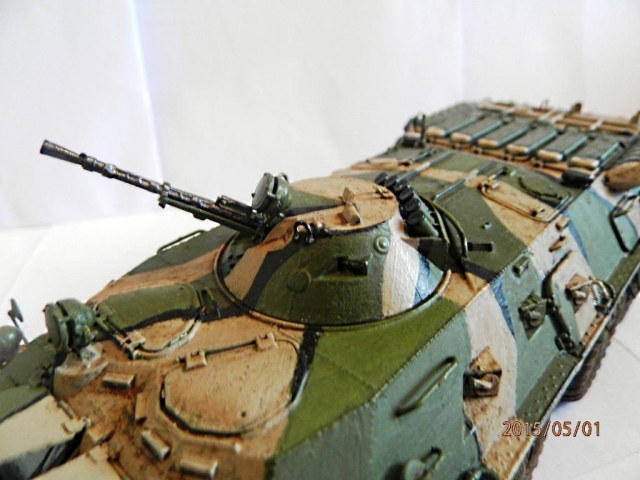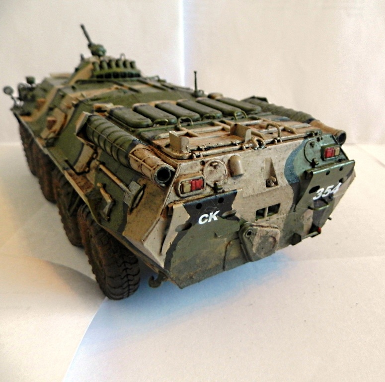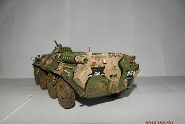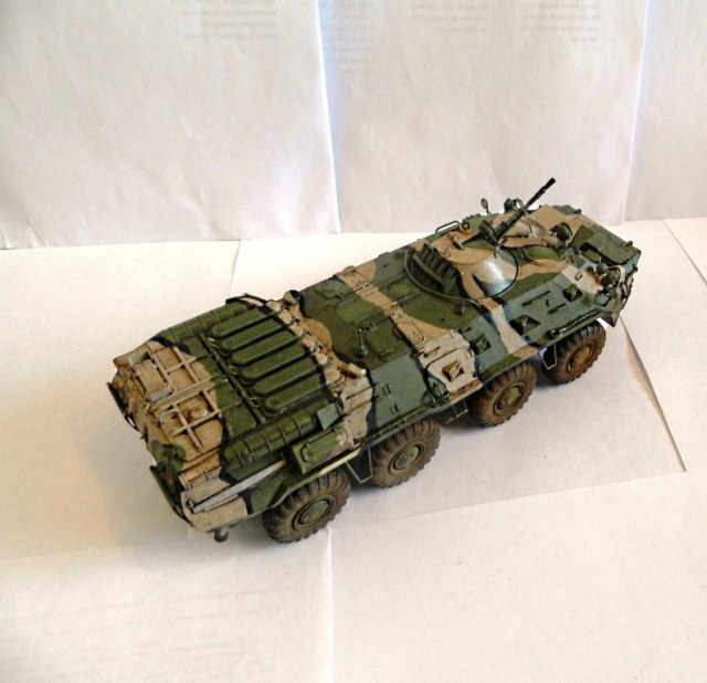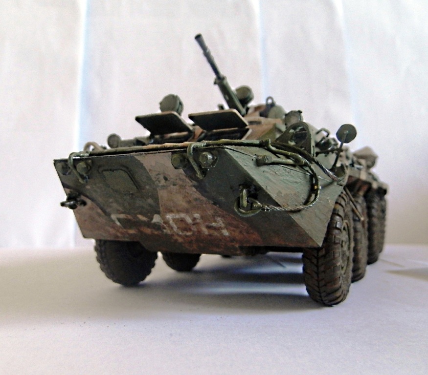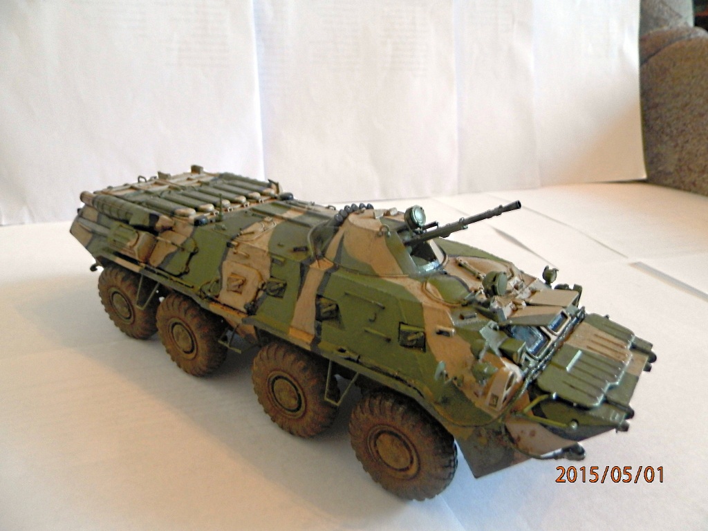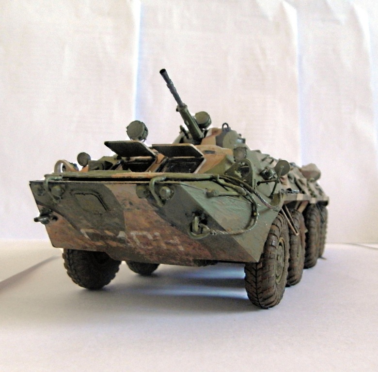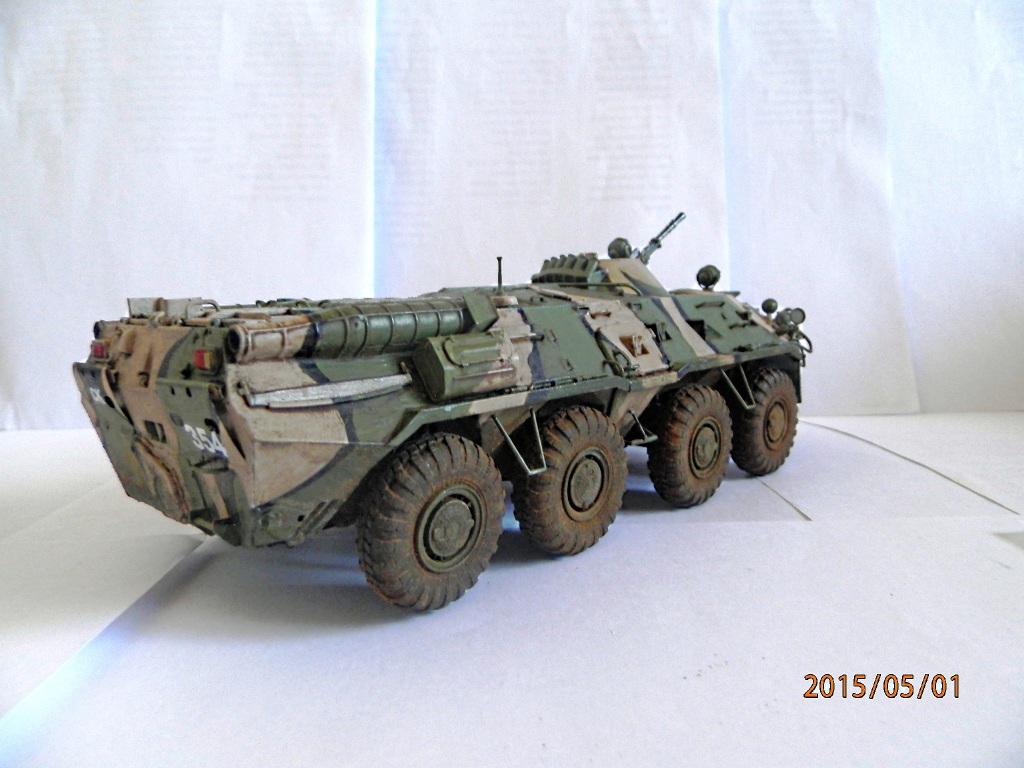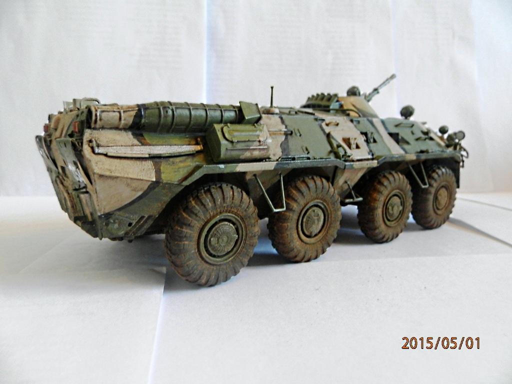 Изкоробочный БТР - 80. Мой первый опыт по нанесению пигментов. Попробовал сделать грязь, как получилось - судить вам. Окрашено кистью акрилом от Tamiya. Использован фильтр "Mig", смывка с двумя звёздами на банке (Tamiya?), пигменты ZIP maket и MIG. Делал с января по апреля 2015 года. Камуфляж нанесён, опираясь на одну из схем окраски и рисунок на коробке.