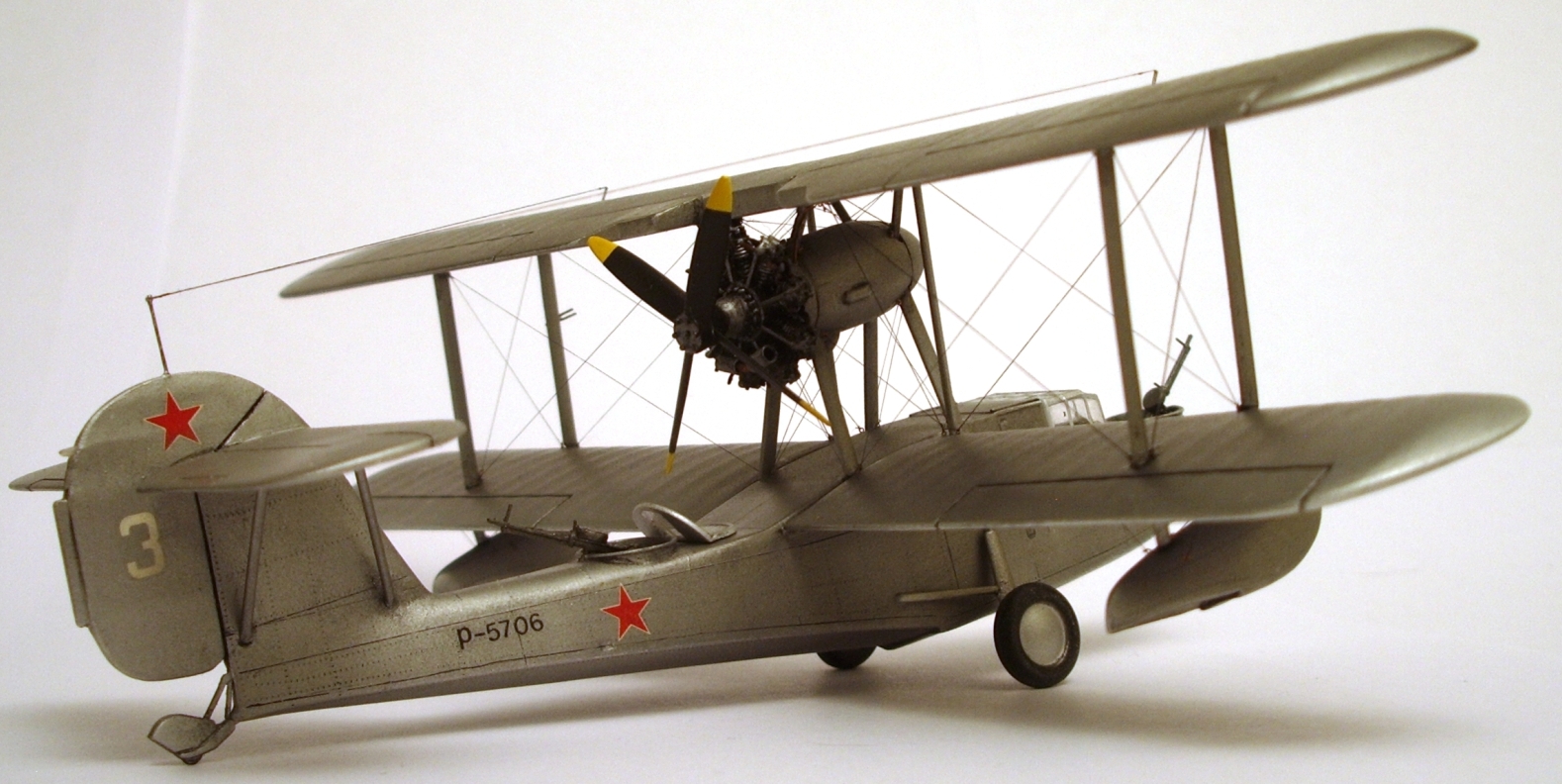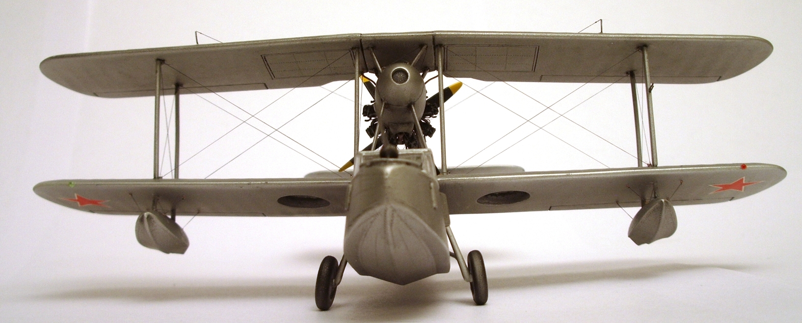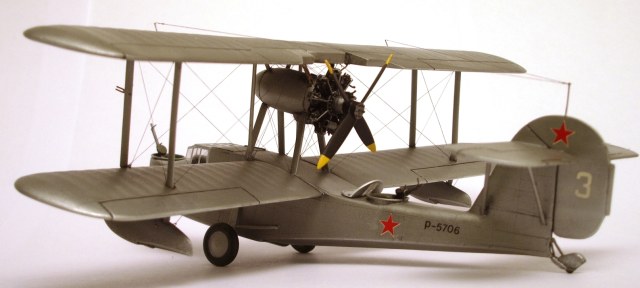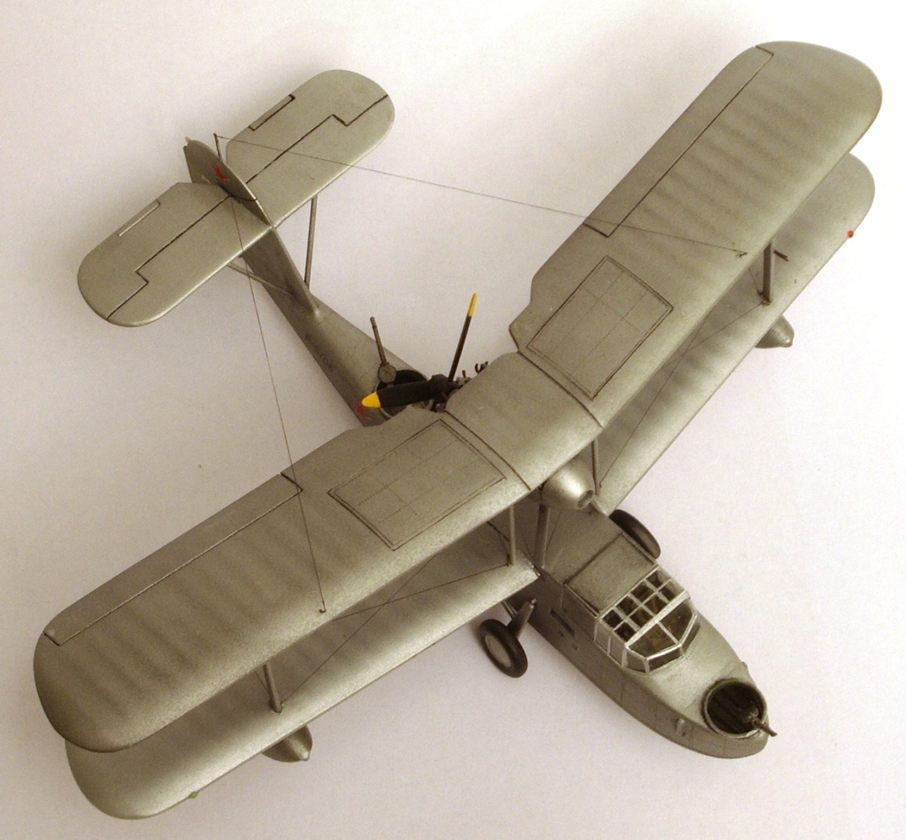 ПЛАНЕР «изкаробочный», только перенёс ниши шасси и добавил купола ниш и прорезал окна в фюзеляже. В качестве «стекла»-прозрачный упаковочный пластик на «футуре». Добавил БАНО, изменил положение некоторых стоек, добавил расшивку баков в верхнем крыле. ПВД, мачты антенн- иглы, талрепы- медные, растяжки и антенна- «чулок».