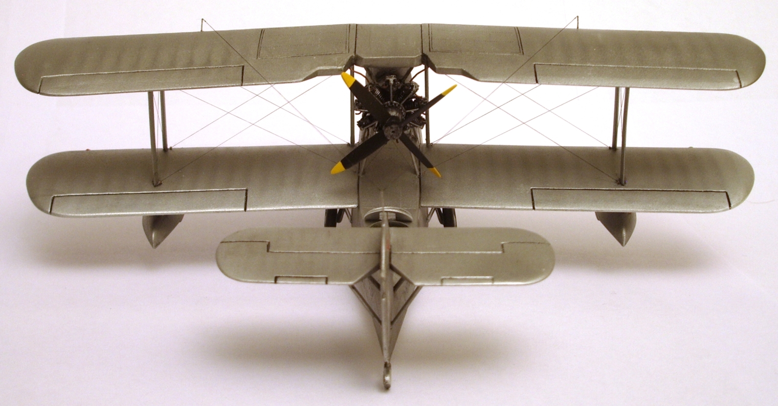 И о недоделках. Прежде всего, не совсем правильно установлены стойки мотогондолы, да и форма стоек оказалась не совсем верной. Заметил это поздно, переделывать не захотел. Не заметил, что не сделал расшивку на задней кромке нижнего крыла, той части, которая должна отклоняться при складывании крыльев. Есть некоторые сомнения в схеме растяжек и талрепов. Не сделал петли и подножки на стойках мотогондолы. Не стал делать бомбовую подвеску- вряд ли он использовался как противолодочный.