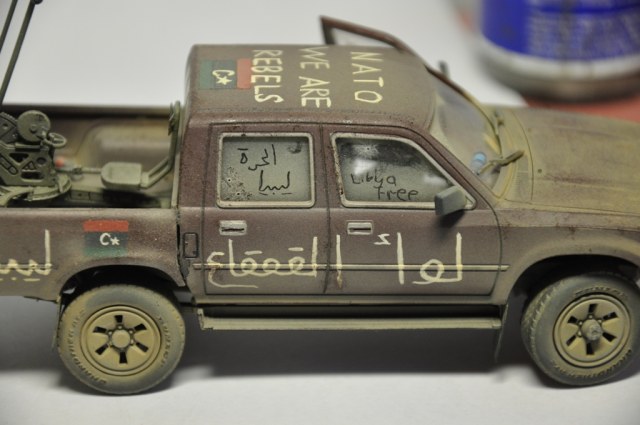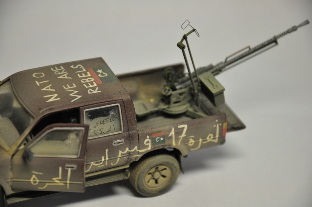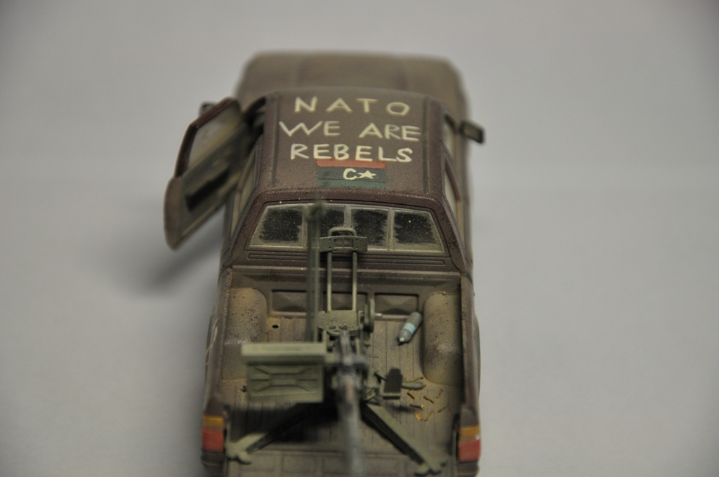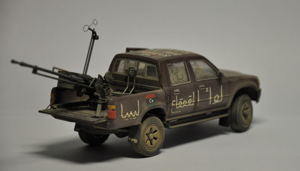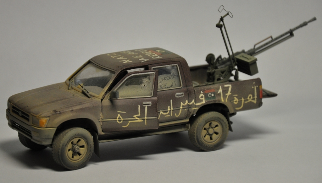 Давно хотел собрать ливийский пикап, ведь как сказал один мой хороший знакомый: «Война в Ливии – это война Тойот и крупнокалиберных пулеметов» - поэтому для диорамы по мотивам Гражданской войны в Ливии пикап должен занимать одно из центральных мест в композиции. Долгое время собирал фотографии прототипа, пересмотрел огромное количество видеоматериалов про войну в Ливии. Данная модель является собирательным образом ливийских повстанческих пикапов. Старался нанести как можно больше флагов. Ибо повстанцы очень любили их рисовать везде, где только можно.