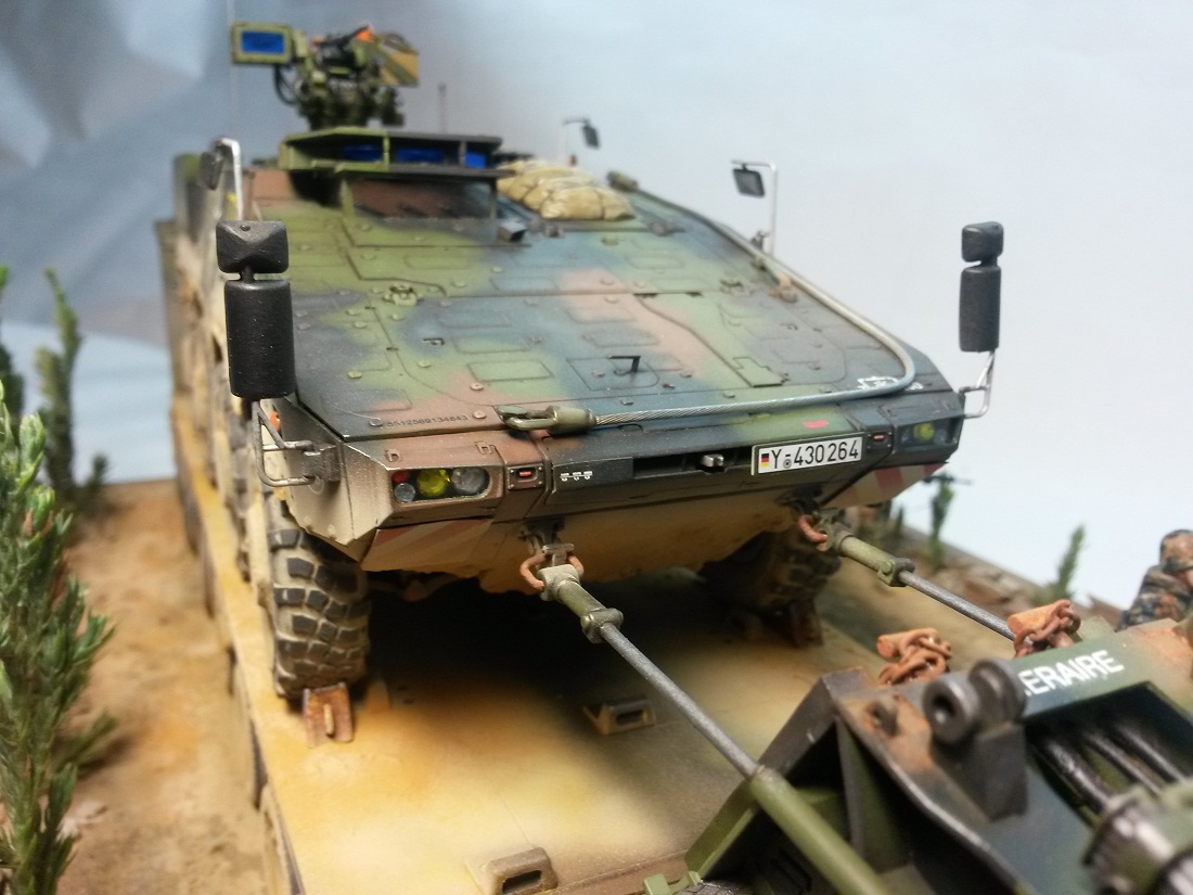 Очень заинтересовала диорама - во первых, современка, во-вторых, редкая тема бундесвера. Понравилось, как окрашена техника, но, на мой взгляд, деки на Боксере нужно было немножко затемнить, слишком уж ярко и вызывающе бросается жёлтый цвет. А вот работа с проводкой, шлангами, и цепями отличная) А вот следы от дворников на лобовом стекле вышли не сильно выразительно- какая-то слегка неестественная грань. И фигурки как-то поблёскивают. Несмотря ни на что, работа, считаю, удалась, посмотрел с удовольствием)
