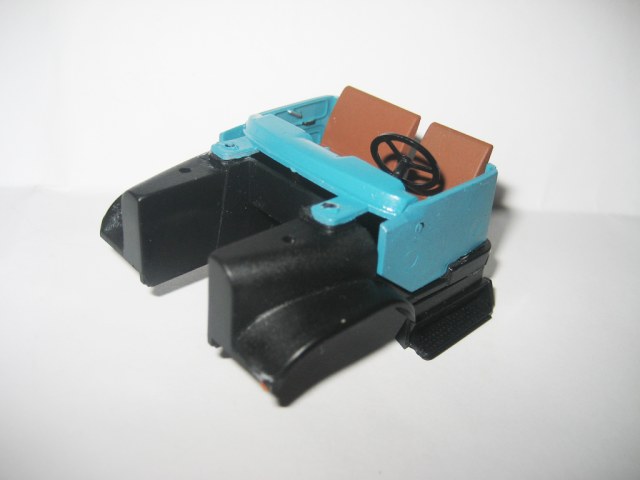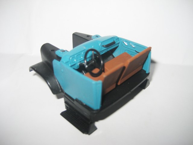 В салоне по схеме, металлические части традиционно в цвет кабинки, сиденья коричневые.