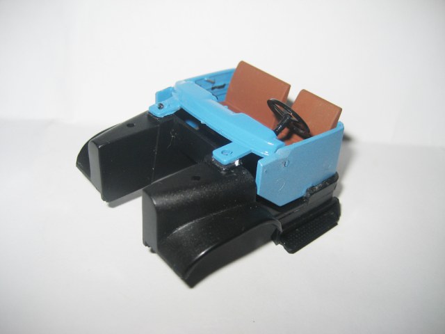 В салоне традиционно металлические части в цвет кабинки, сиденья коричневые.