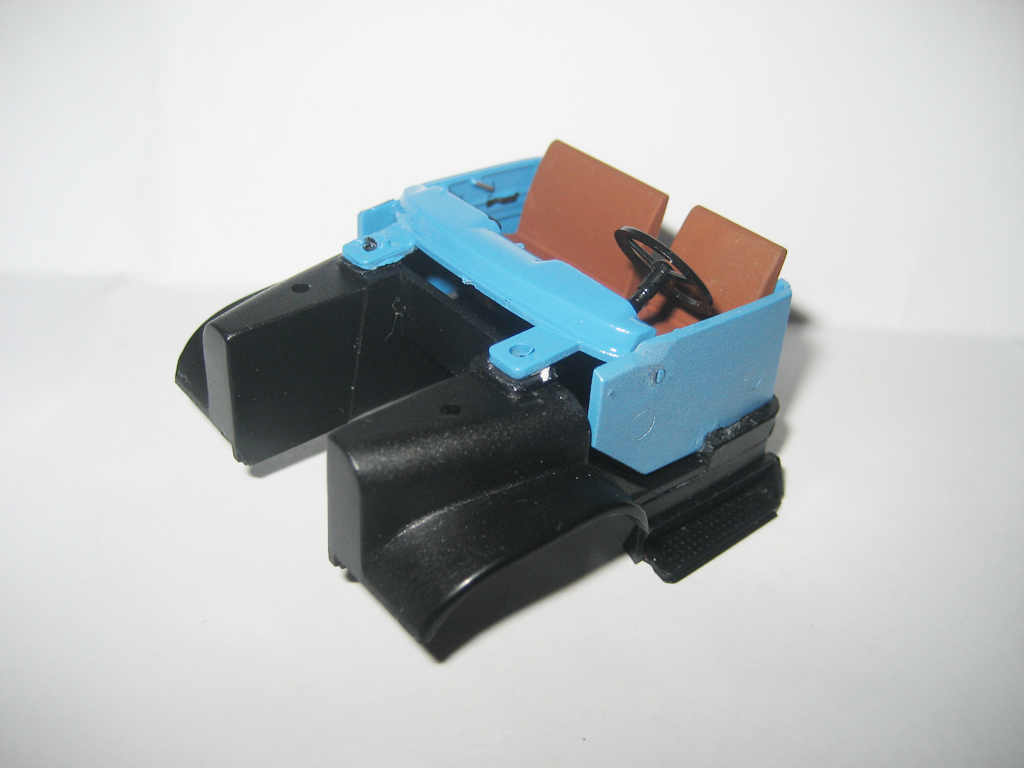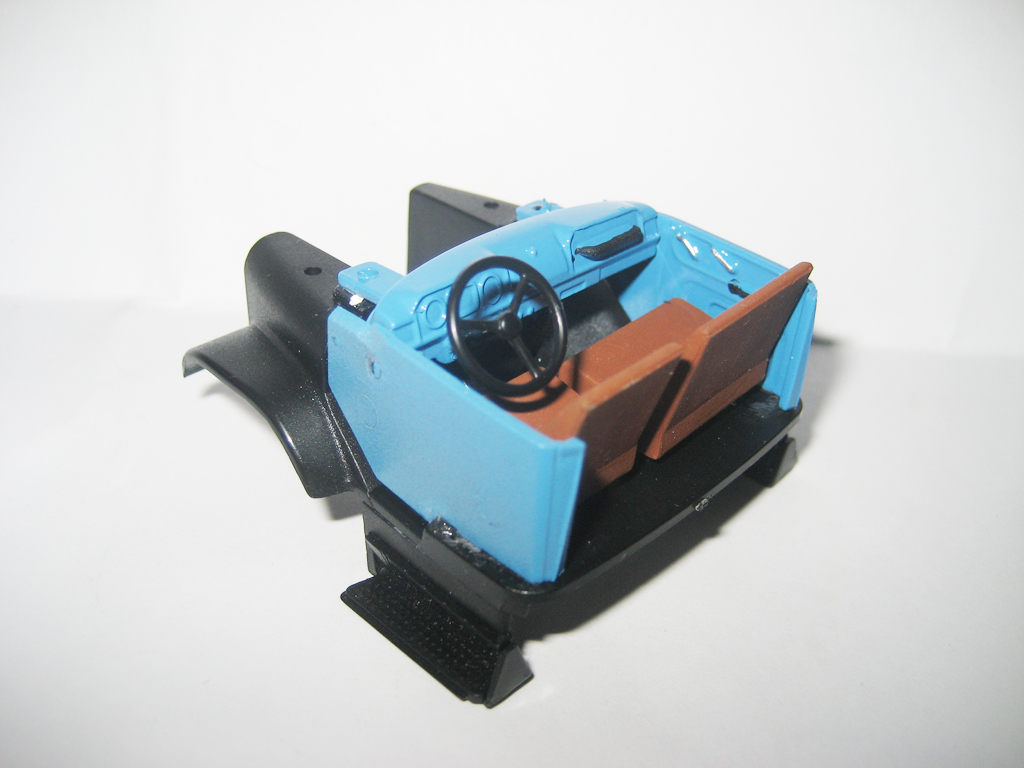 Фары осветлены серебрянкой; жалюзи радиатора посеребрены; машина Ивановского хозяйства; дворники воспроизведены из скрепок от степплера; установлены два бака меньшего литража; посеребрена выхлопная, двигатель тоже выделен; подобрано так же интересное сочетание цветов модели автомобиля.
