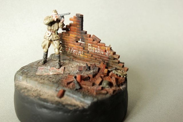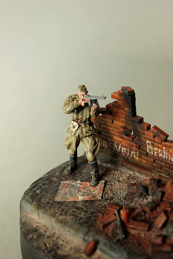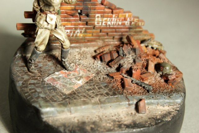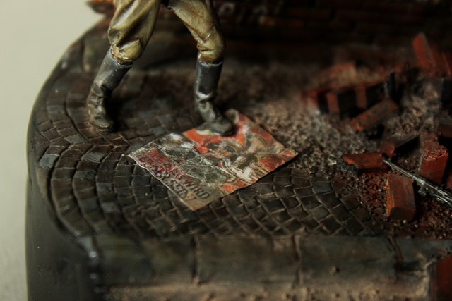 Подставка, как говориться: "из того, что было". Основание из ГВЛ и гипса. Рельеф мостовой и 2-х компонентной шпакли, кирпичная стена и ее обломки - Italeri. MP-40, немецкий шлем и ведущая звездочка от Kettenkrad'а - Dragon. Агитплакат - BlackDog.