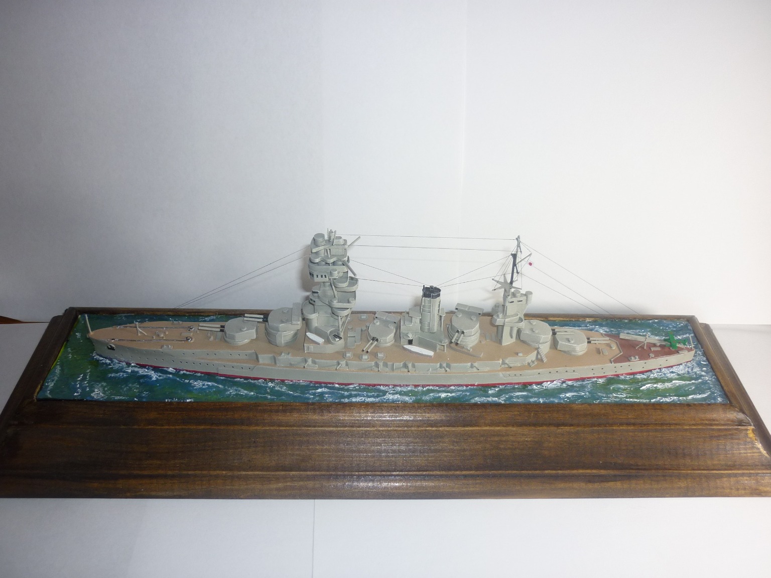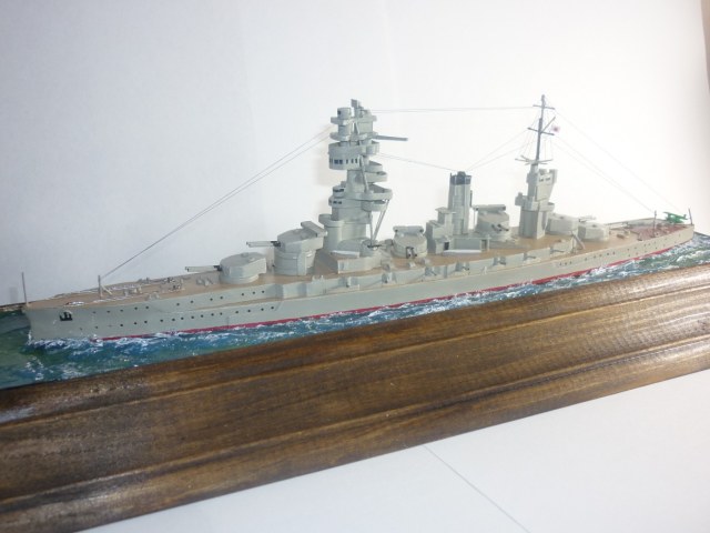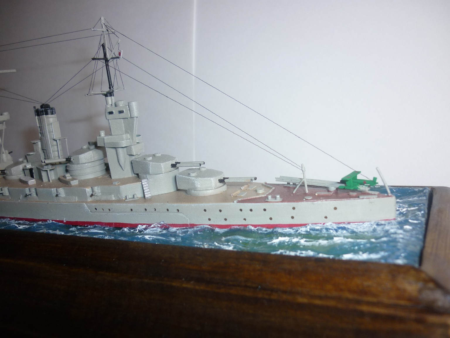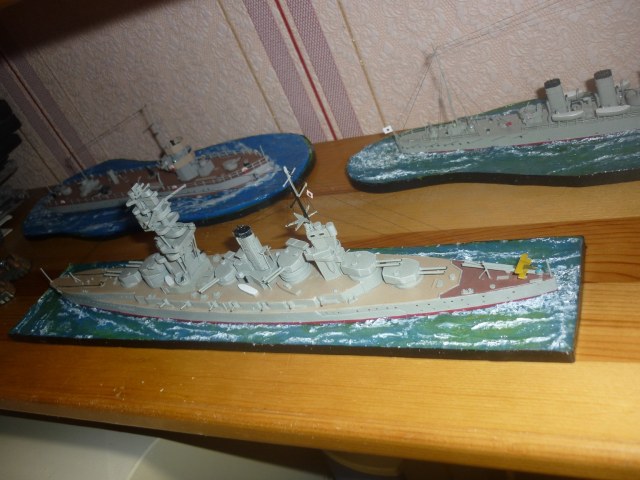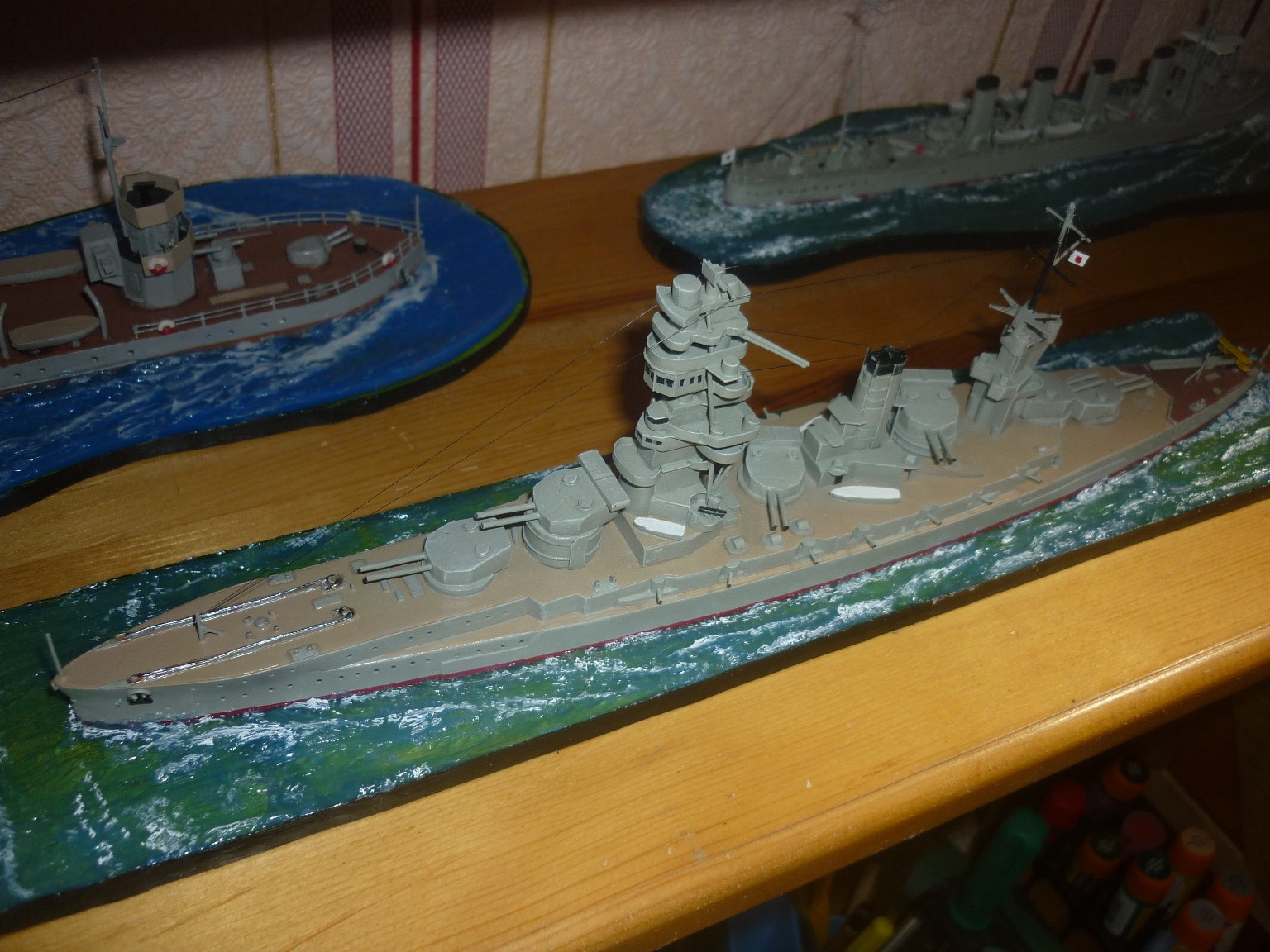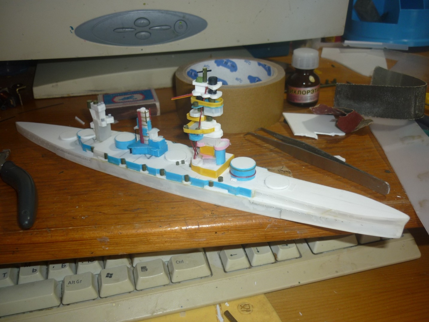 Строился линкор около двух недель, благо длинные выходные этому очень способствовали. Удалось(ну, мне так кажется) достаточно достоверно передать форму носа корабля, плюс все стыки ушли за бронепояс. Пагода вышла несколько кривоватой, но не критично. Очень долго я с ней мучился. Башни ГК несколько упрощенной формы - нет скосов на крыше, поскольку не был уверен, что они получатся одинаковыми. Пропорции у них и так "гуляют". ПВО упростил до неприличия. Как говорится - извините, я больше так не буду))) По окраске тот же "топор" , что и предыдущие - холст, масло акрил художественный и "Звезда", кисть. Якорные цепи, которые больше похожи на тросы не в масштабе, мне не удались. Если кто подскажет способ - буду благодарен. Ну и чтобы корабль не был куском серого пластика прошелся сухой кистью по граням. "Ниистарична", но смотреть приятней.