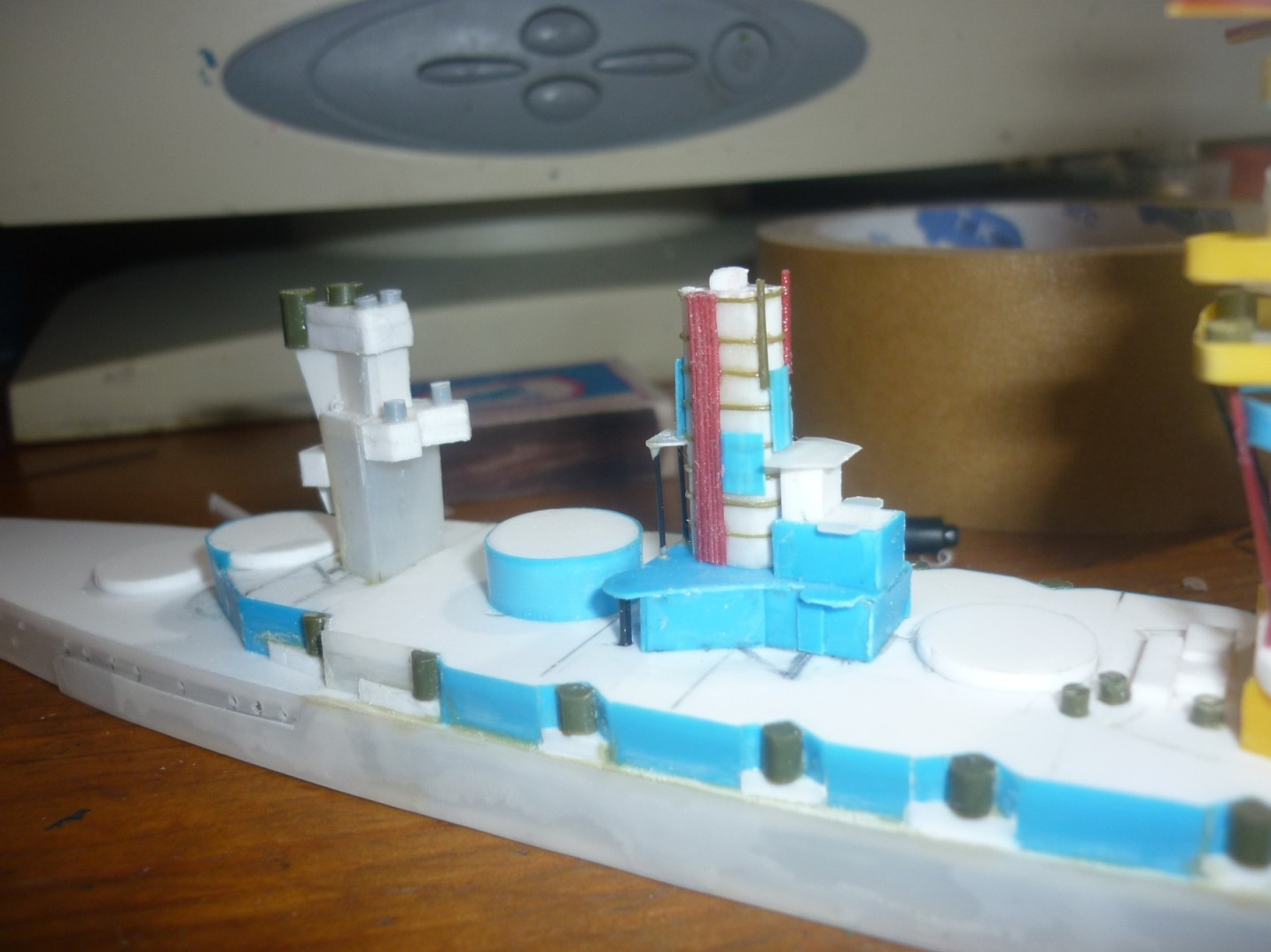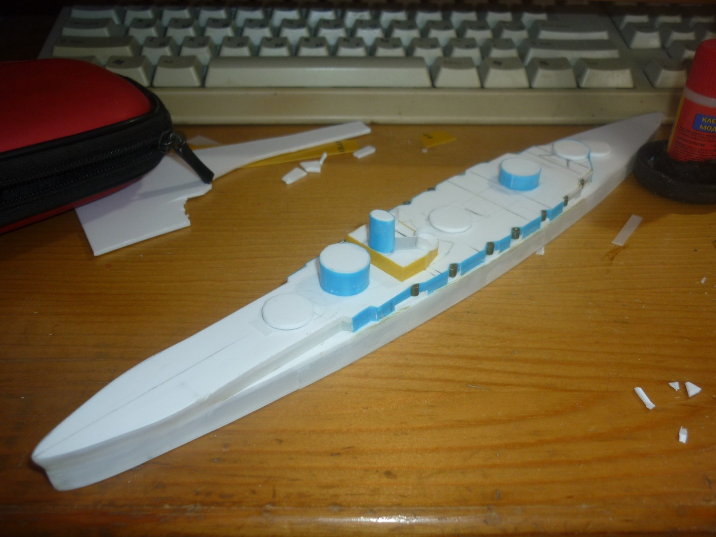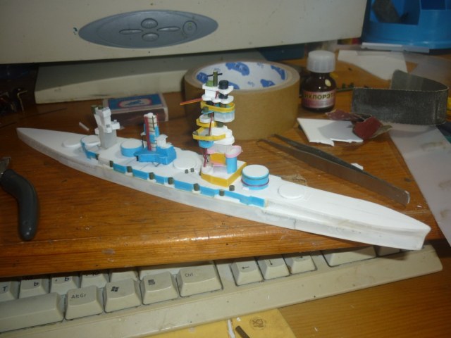 .......Строился линкор около двух недель, благо длинные выходные этому очень способствовали. Удалось(ну, мне так кажется) достаточно достоверно передать форму носа корабля, плюс все стыки ушли за бронепояс. Пагода вышла несколько кривоватой, но не критично. Очень долго я с ней мучился. Башни ГК несколько упрощенной формы - нет скосов на крыше, поскольку не был уверен, что они получатся одинаковыми. Пропорции у них и так "гуляют". ПВО упростил до неприличия. Как говорится - извините, я больше так не буду)))......
