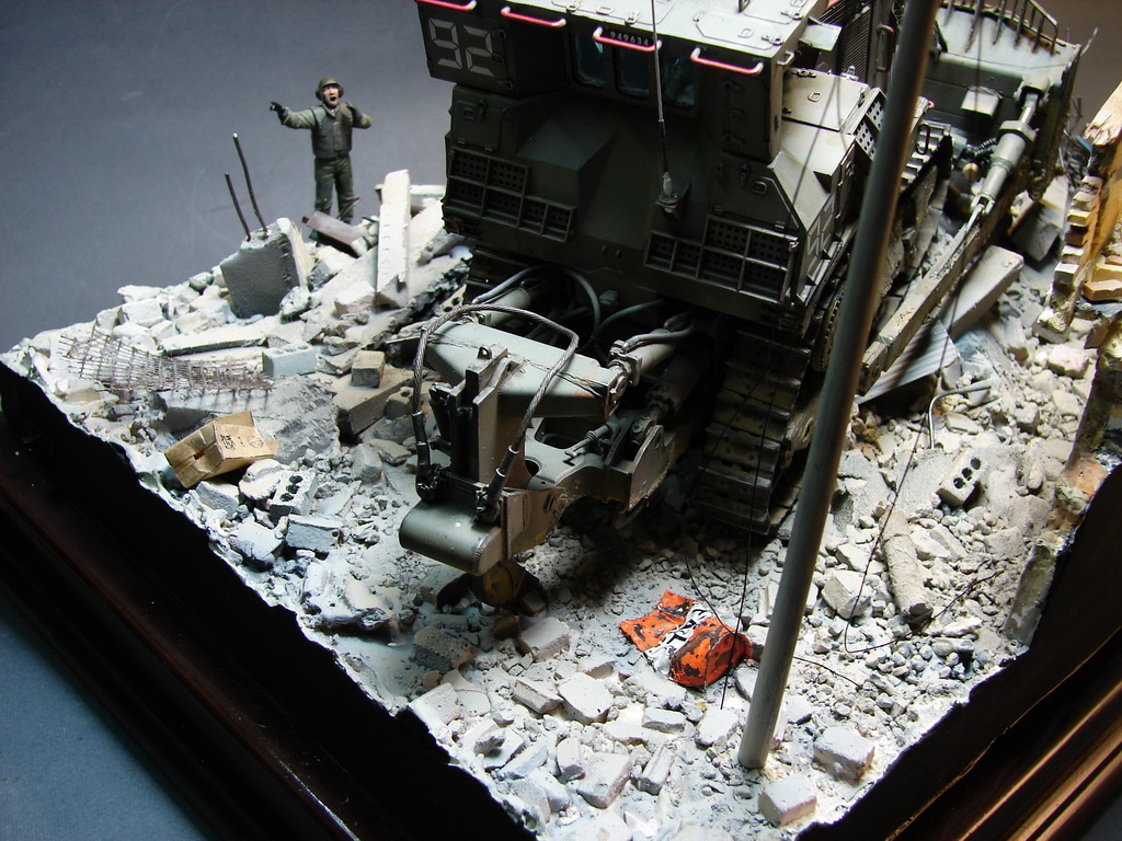 Всем,привет.Трактор CaterpillarD9,израильская армия использует,зачастую как средство возмездия против арабских террористов.Идея сделать диораму с бульдозером в своей обычной среде,возникла очень давно.Саму модель трактора я уже здесь выкладывал.В преддверии киевской выставки сделал основание по него.Практически ,все основание сделано из пенопласта.Фигурки-микс из старых академовских танкистов.