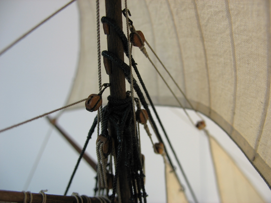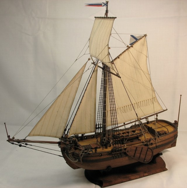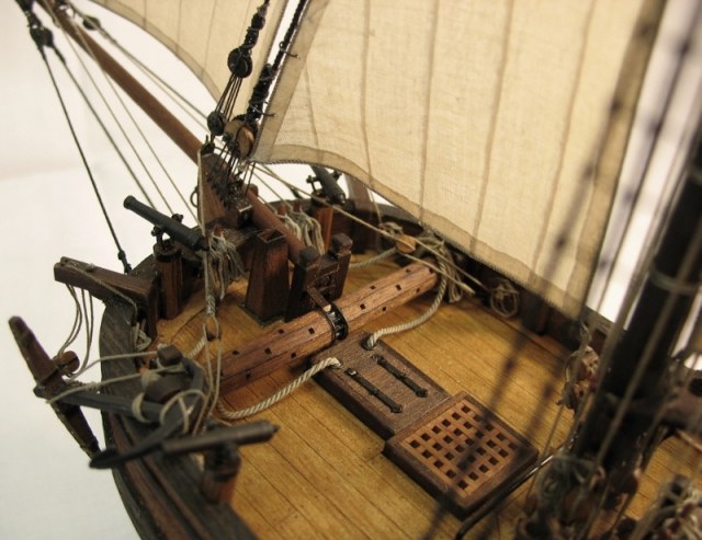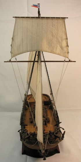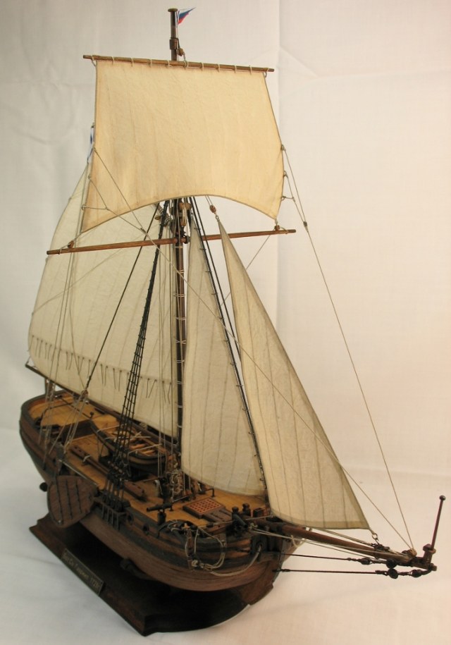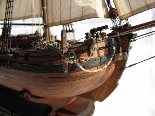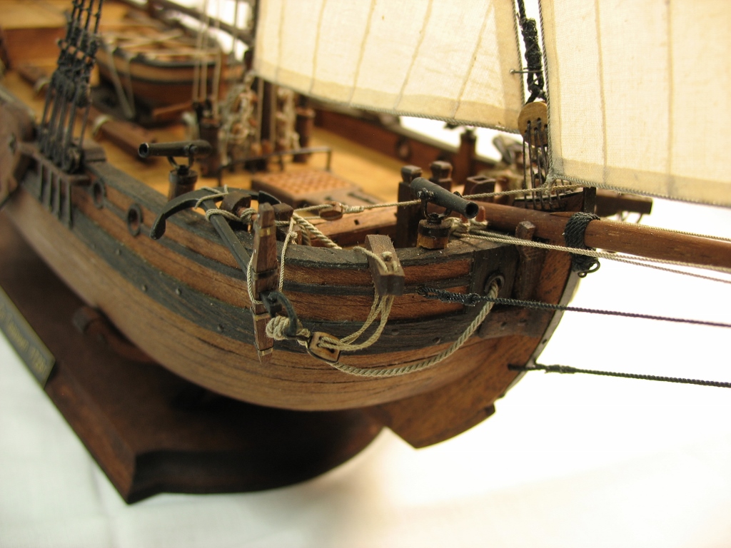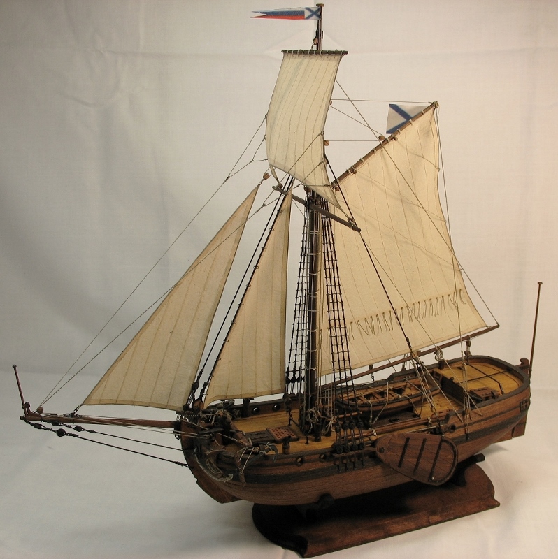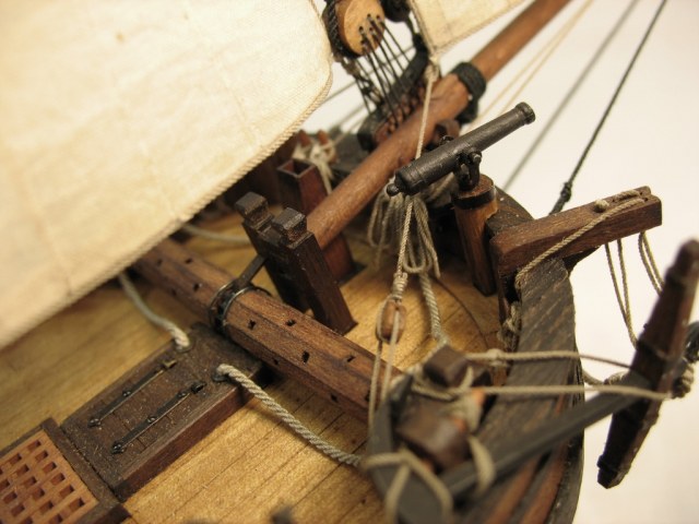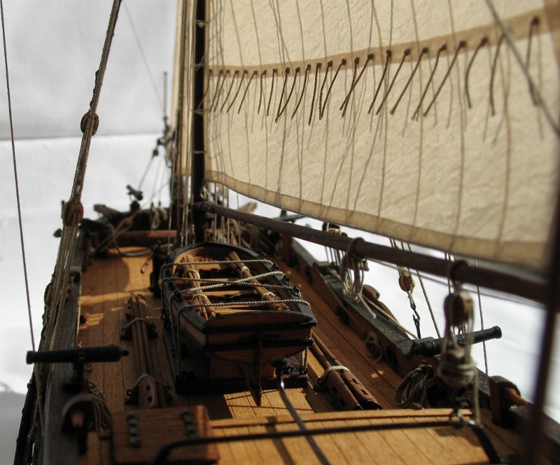 Чисто,аккуратно,правильно.Только два замечаний: наглая фанера планширя и большая "дырка" фальконета.Замечания скорее к производителю.Паруса скушные какие-то.Даже риф-сезни как из проволоки.....В остальном белый шар.