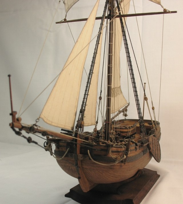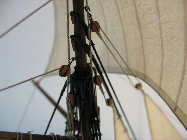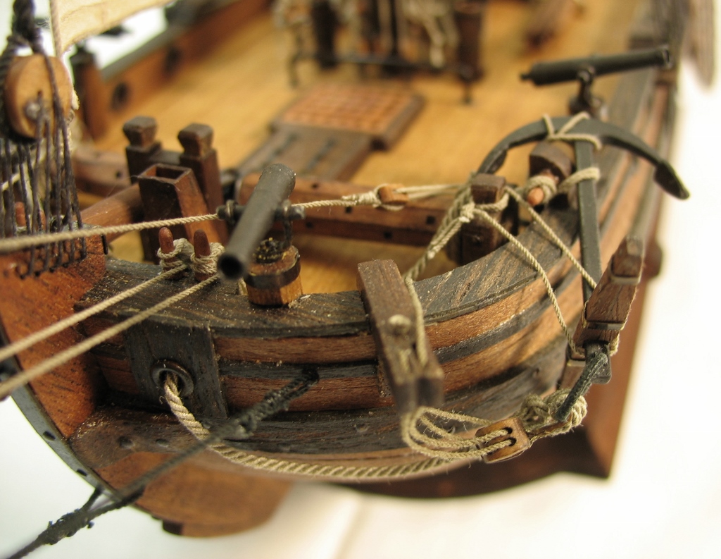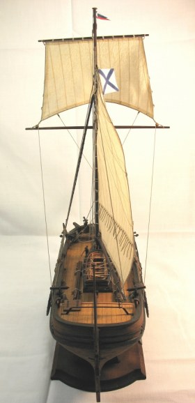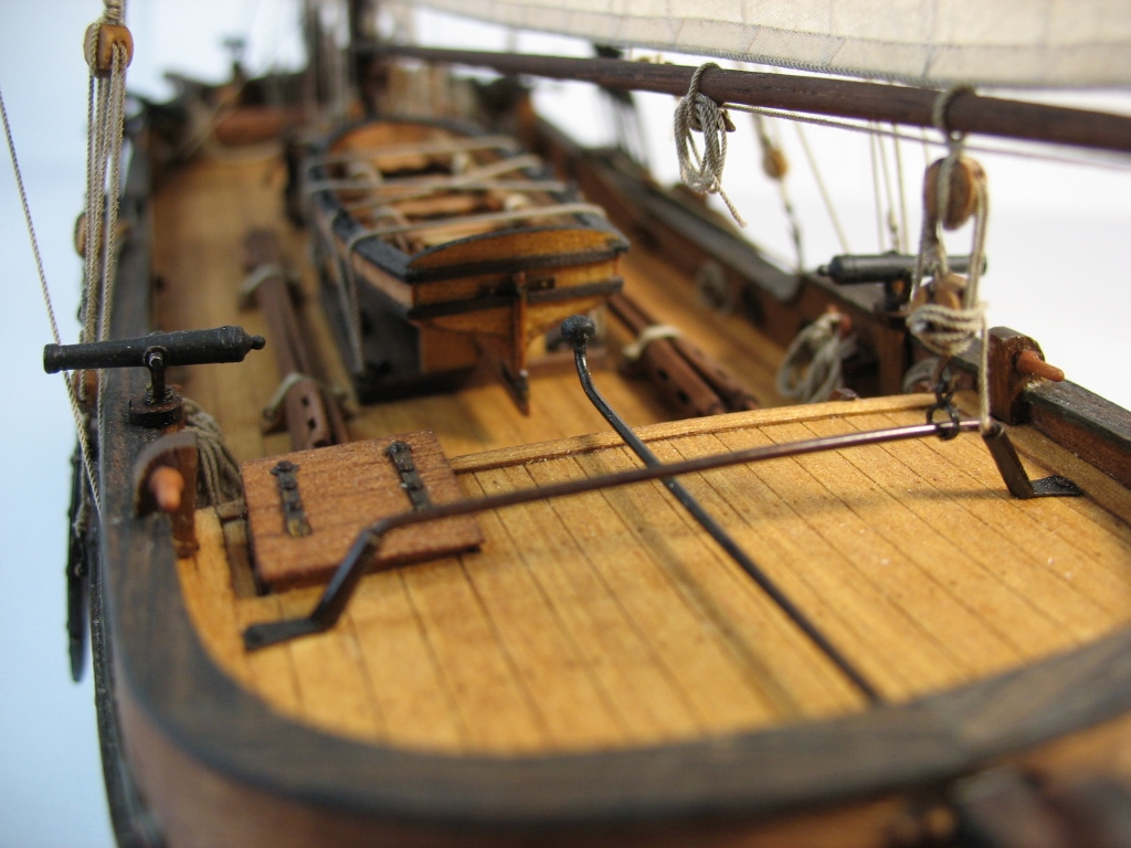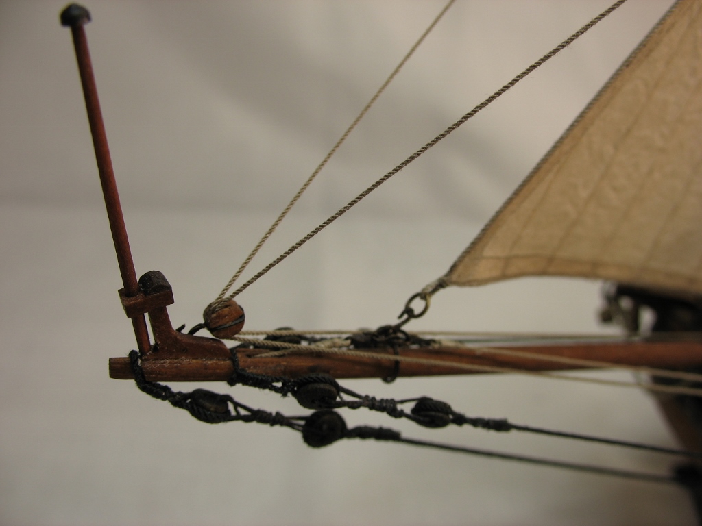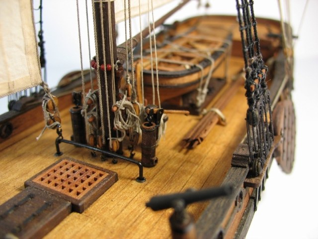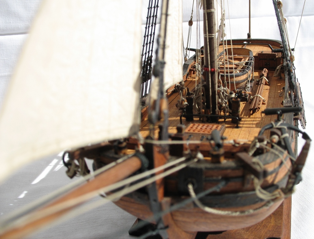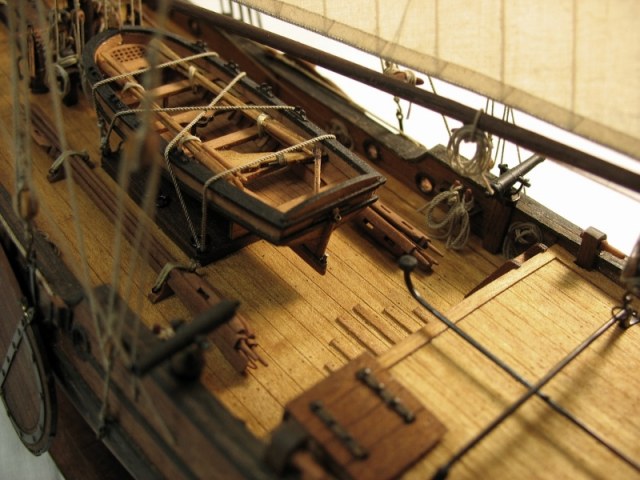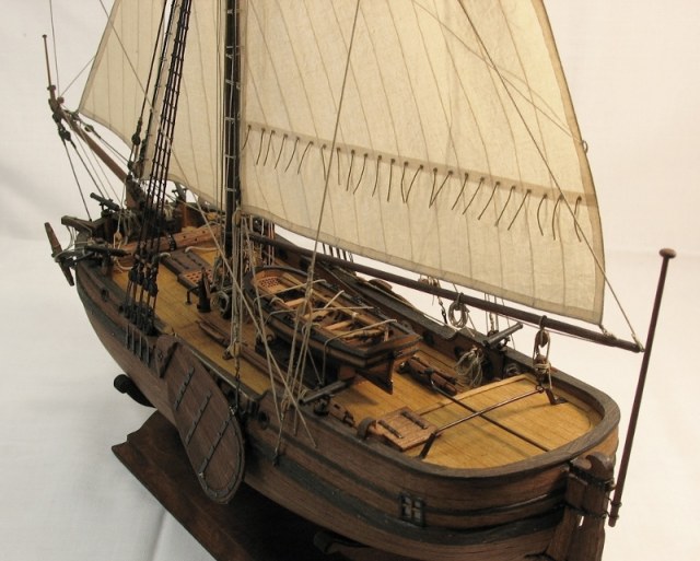 Чисто,аккуратно,правильно.Только два замечаний: наглая фанера планширя и большая "дырка" фальконета.Замечания скорее к производителю.Паруса скушные какие-то.Даже риф-сезни как из проволоки.....В остальном белый шар.