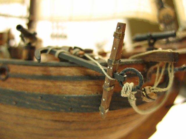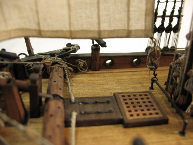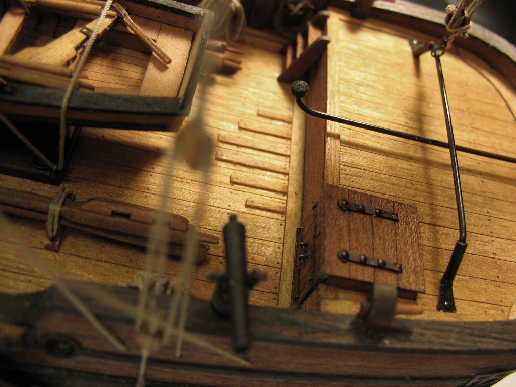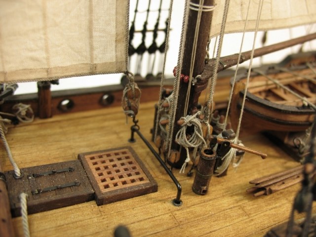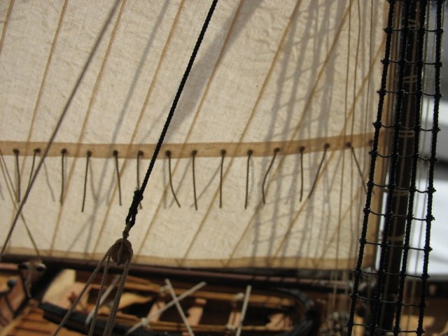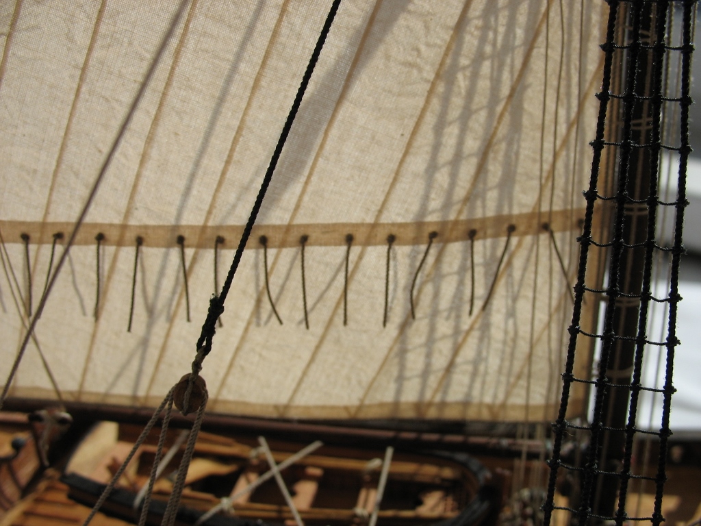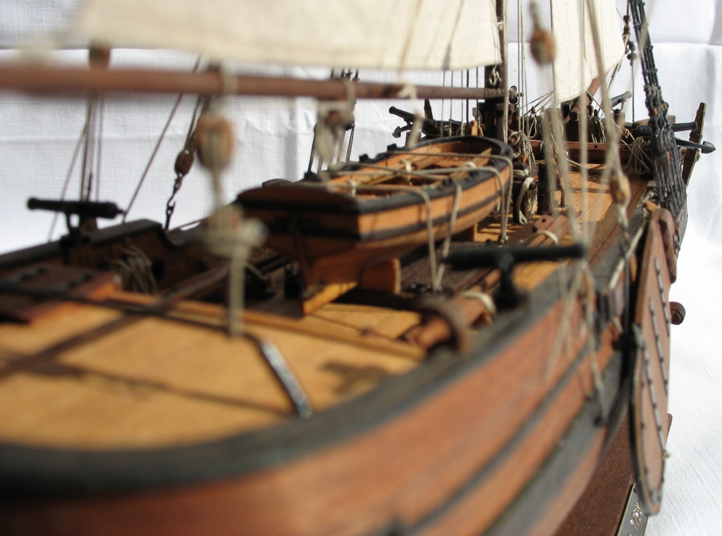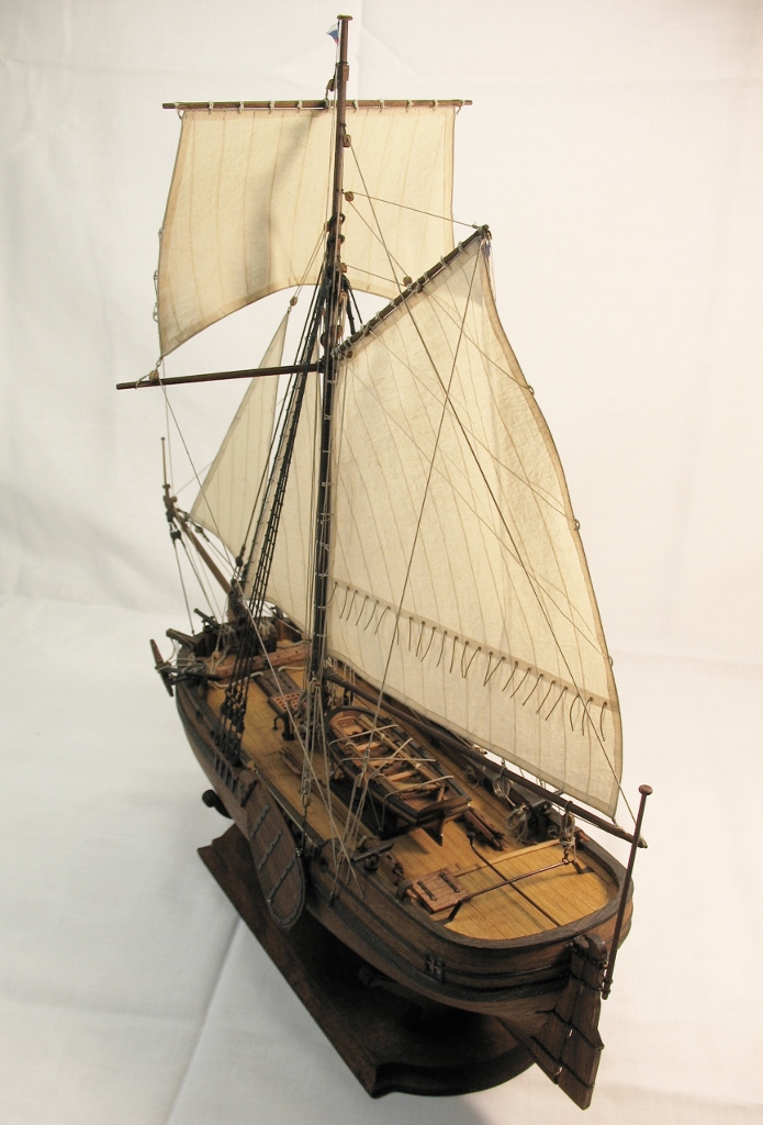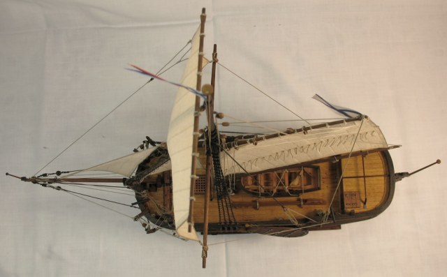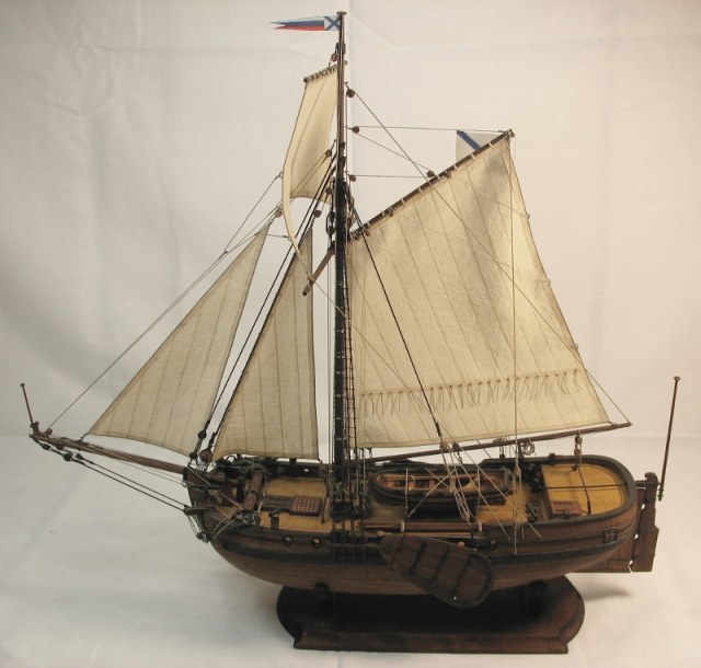 Чисто,аккуратно,правильно.Только два замечаний: наглая фанера планширя и большая "дырка" фальконета.Замечания скорее к производителю.Паруса скушные какие-то.Даже риф-сезни как из проволоки.....В остальном белый шар.