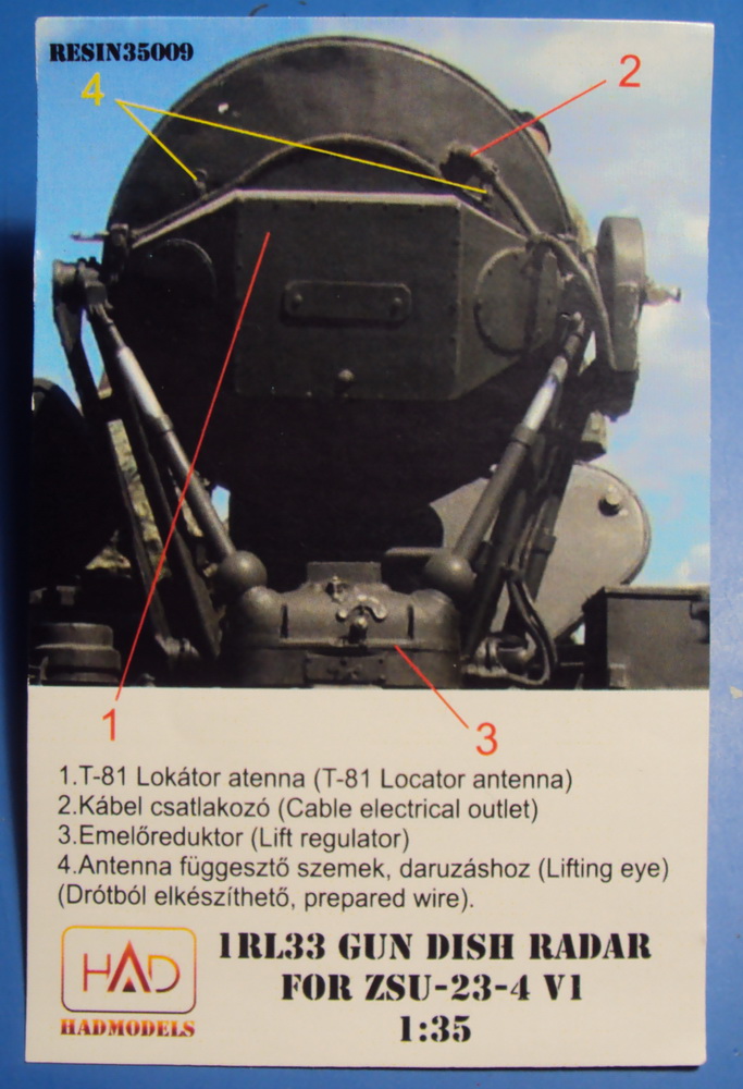 В коробке из плотного картона находились, буклет, и пакет с тремя смолеными деталями. Радар, основание и еще одна деталь в назначении которой я так и не разобрался.