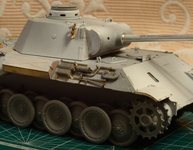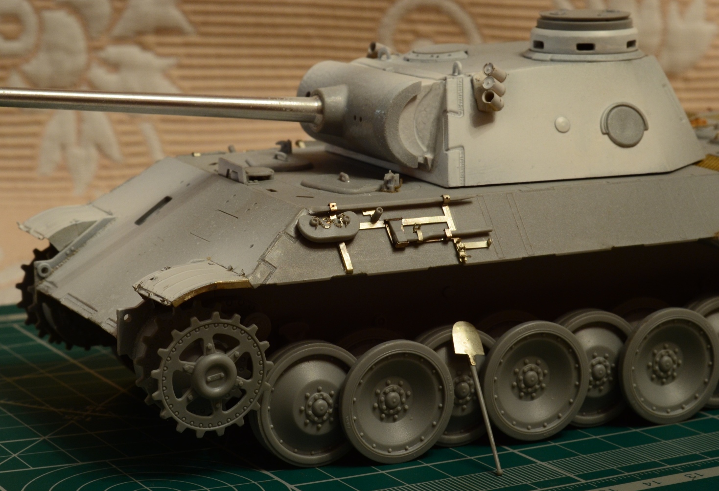 Долго пришлось промучаться над комбашенкой. У Дрэгона проблемы с членением её (она состоит из 2-х половинок, в результате чего посередине смотровых окошек образуются щели, которые практически невозможно идеально обработать). Также сами окошки должны иметь практически идеально прямоугольную форму, а у китайцев углы скруглены. Звезда форму выдержала, также членение получше, но сами окошки сильно шире, чем нужно. Пришлось брать башенку из смолы от Panzer Art. Там окошки тоже с небольшими закруглениями даны, но их обработать оказалось попроще. Правда их размер несколько больше чем нужно... Ну и большой минус - смола непрозрачная, так что стёкла имитировать пришлось самому. В общем сколько я не искал идеальную комбашенку на эту модификацию Пантеры - так и не нашёл...