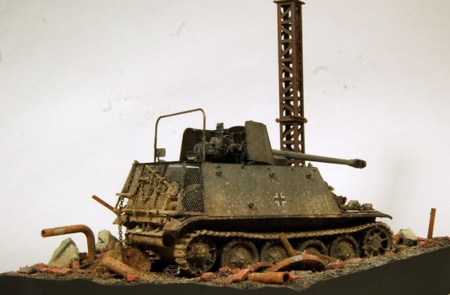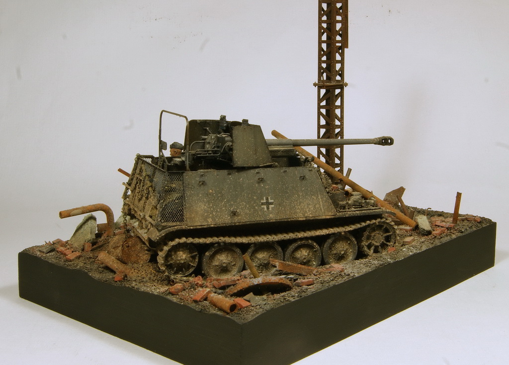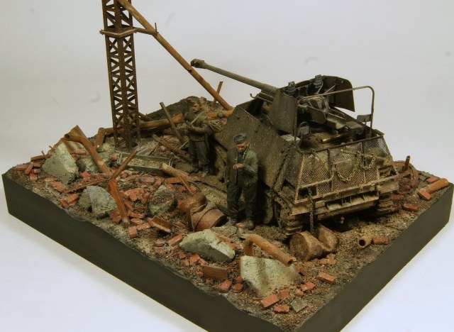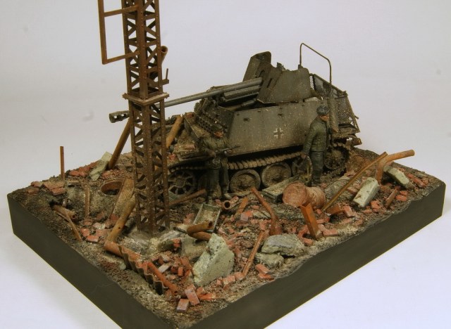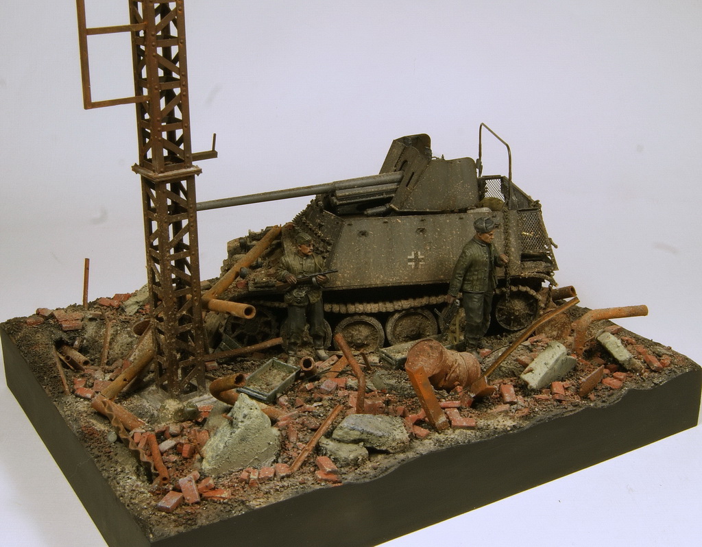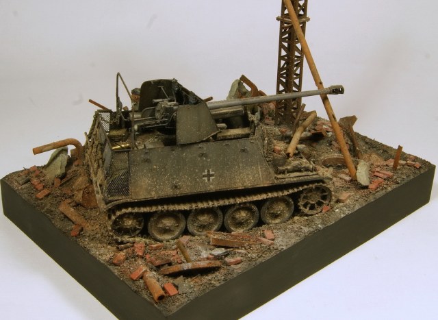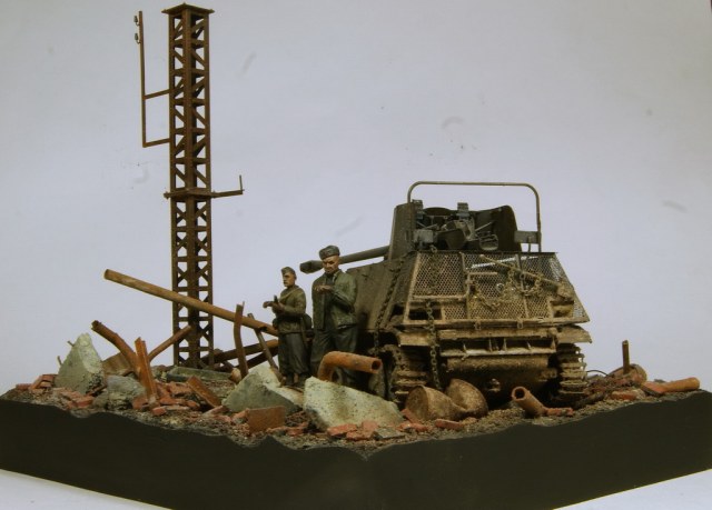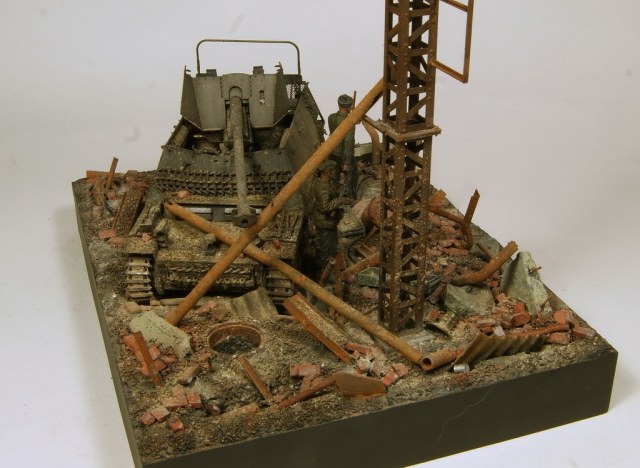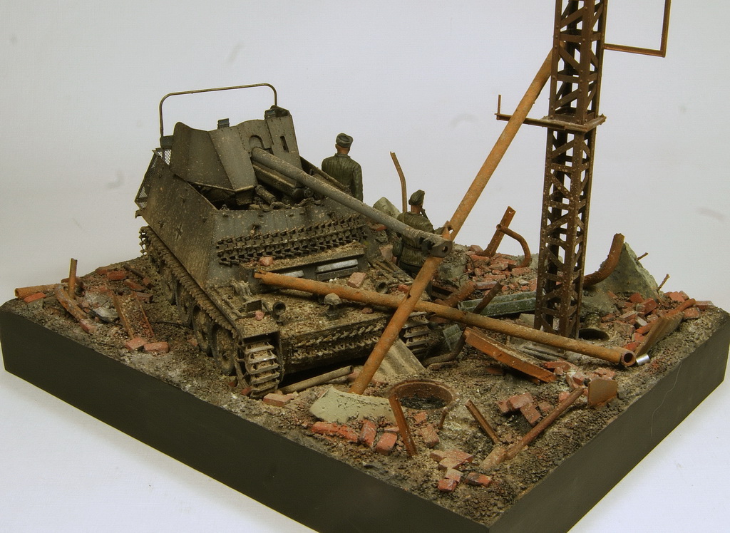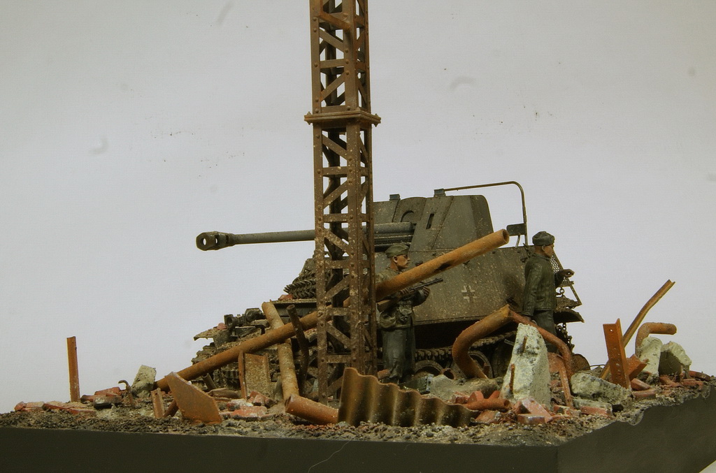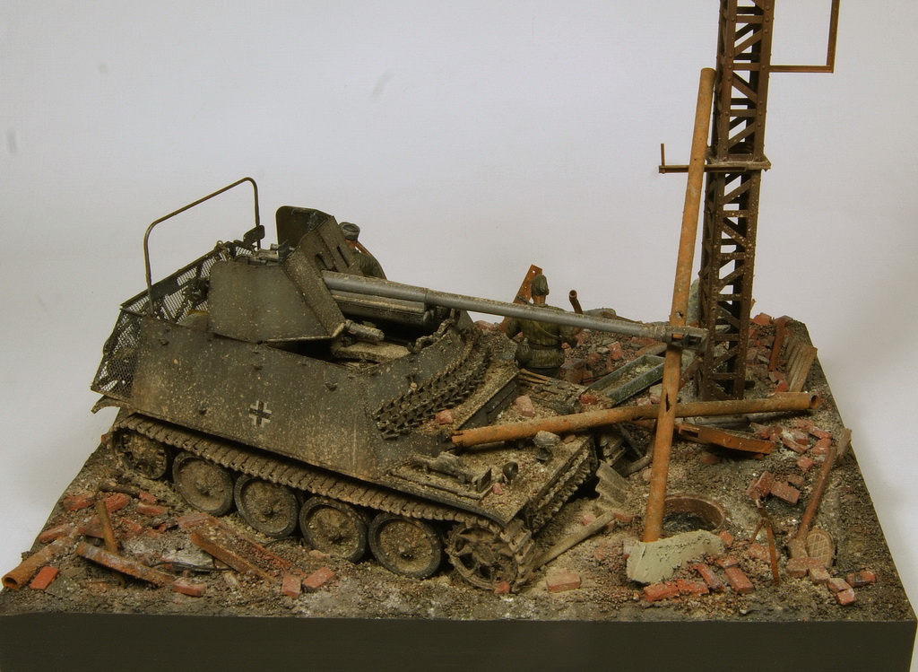 Сюжет на тему городских боев и их последствий, в качестве жертвы Marder IId от Bronco. Основной затеей этой работы была попытка самостоятельно, из подручных средств сделать базу, и вокруг нее выстраивать сюжетную линию. Обязательным условием для меня было наличие в сюжете какой то составляющей, имеющей отношение к тематике Сталинградской битвы, в итоге, в качестве этого элемента я выбрал модель от Бронко.