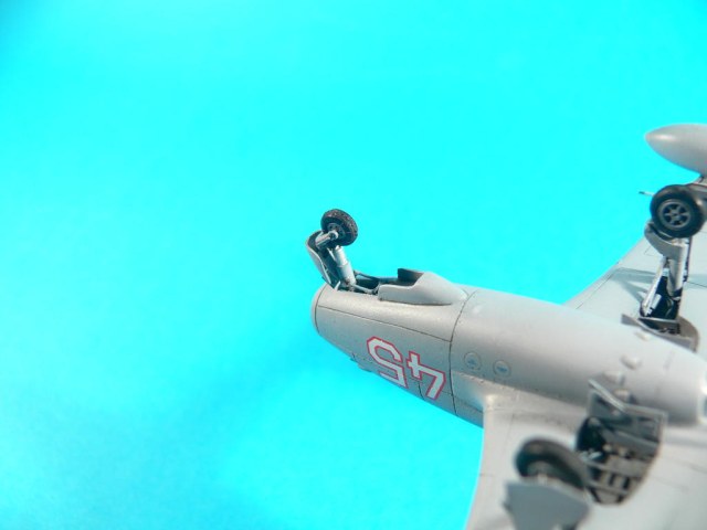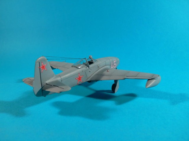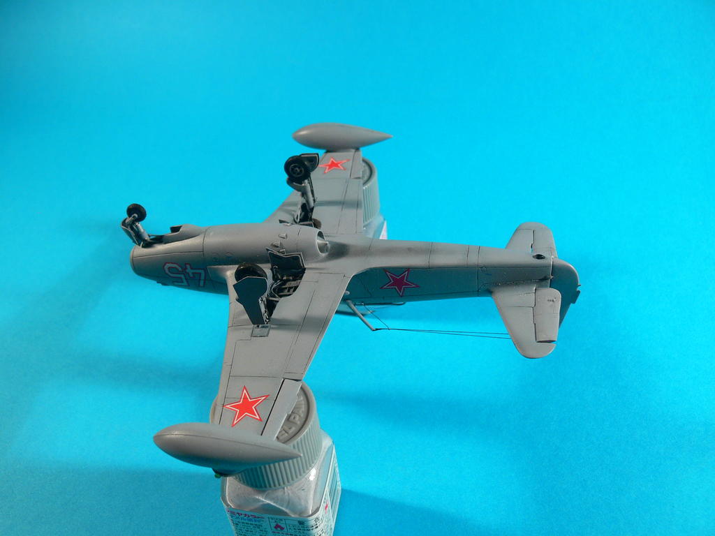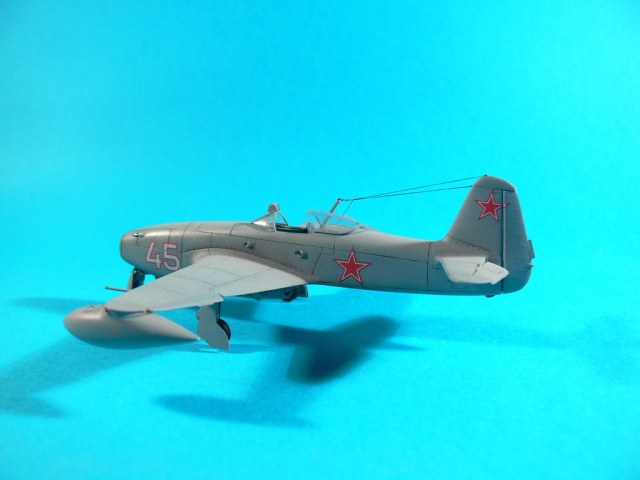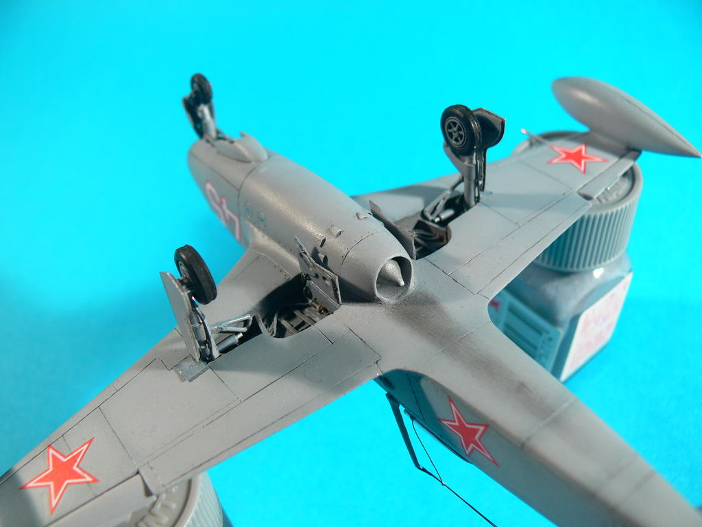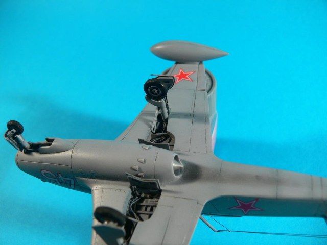 К сожалению, практически вся мелочевка у Амодела отлита весьма грубо, посему пошла в мусорное ведро. Стабилизаторы у Амодела, видимо, взяты от Як-7, они меньше и РВ занимает всю поверхность задней кромки. Их тоже пришлось отправить по известному адресу. Внутренности ниш шасси были сошлифованы и восстановлены из подручных материалов (обрезки пластика, проволока, алюминиевая фольга). На ПТБ добавлены сварные швы и заливные горловины. Расшивка перерезана, нанесена клепка. Фара и перископ выточены из куска плексигласа. Бортовое вооружение и ПВД — иглы от шприцев. Из тянутого на зубочистке доширакостирола сделаны обтекатели приводов управляющих поверхностей. Сделаны с нуля стойки и приводы шасси. Створки — частично самодел, частично доведенные до масштабной толщины китовые (носовая — SpecialHobby, основные — Амодел). Антенна — мононить для бисероплетения.