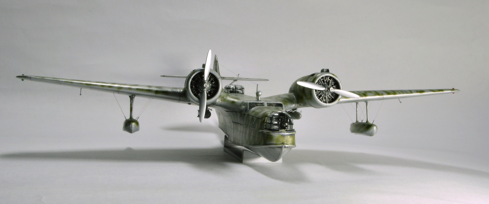 Фото строевого с номером известно только одно и делать очередного брата-близнеца не хотелось. В статье о Че-2 было сказано,что после начала войны они в большинстве своём получили импровизированный камуфляж из полос. Ситуация с МБР-2 это в какой-то степени подтверждает это высказывание.Так что решил нафантазировать. Хотя мне лично по душе однотонные модели,так как виден силуэт самолёта,его обводы.Камуфляж это всё разбивает.