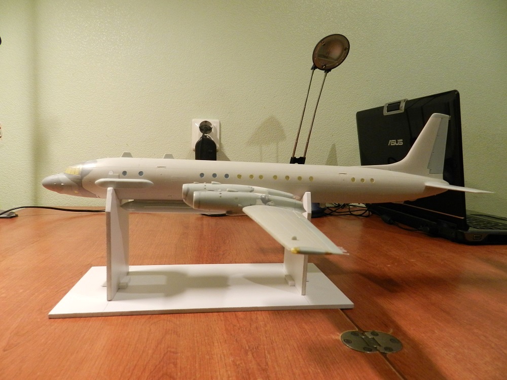 Всем привет! И еще, на этот раз моя крайняя модель разведчика Ил-20 от Амодела. Сам самолет мне нравился давно, ну и получилось что жена осчастливила меня им на день рожденья. Амонстр в их стиле, фюзеляж и крылья из смолы, движки, нос и мелочевка из пластика. Модель в постройке совсем не простая, стыковка никакая , расшивка жирная и глубокая, нервов и мастерства требует не мало. При шкурении фюзеляжа от неровностей вылезло куча пузырей, задолбался их залечивать . Кромки крыльев обколоты и толстые, приклеивал пластиковые полоски и выводил. С носовой частью там вообще проблема , стыковка хреновая и надо править форму, с фонарем тоже не просто не правильные формы окон (подправлял как мог). Наверно самая долгая работа работа была с движками, делал вставки, правил форму , переделывал воздухозаборники , сопла и всю мелочевку, дорезал расшивку. Потом начал садить на крылья , вот тут намучался подгонять и как обычно на все куча шпакли. Доработал стойки и брызговик на переднюю стойку . Расшивку кое где подправлял , всю мелочевку пришлось делать самому, на модели её практически нет а что есть очень грубо смотрится. Ну и вроде все (может конечно что то и упустил из постройки). Красил акрилом "тамия", смывка масло , декали от " бегемота".