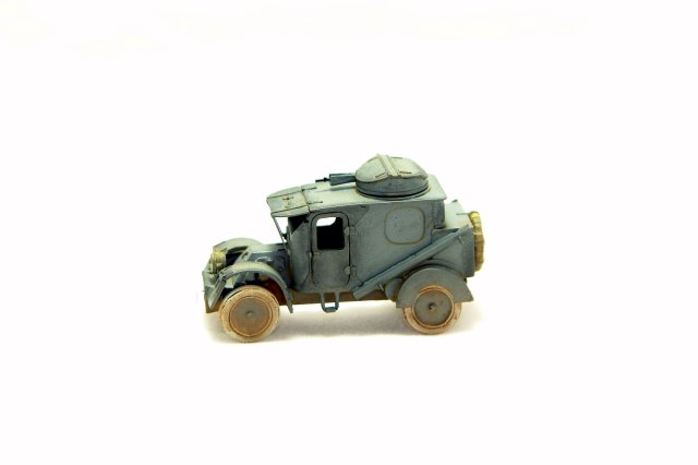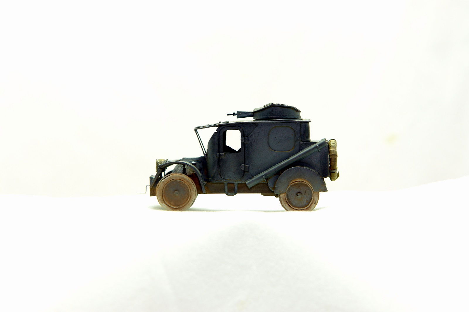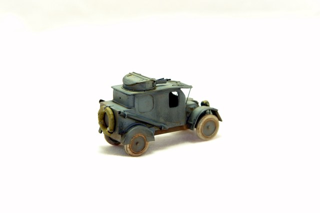 Модель (смола) очень хорошая. Есть частично внутренности. Но я переделал желоба, на гнутые из жести, изменил запаску, крепление крыльев. Фару закрыл брезентом. Попытался приблизить к виду испытаний в РИ. Не стал менять передние крылья. Знаю, что не соответствуют времени, а это времен службы во Франции, но больно форма понравилась. Потом может быть поменяю. Делать из жести 3 минуты времени. Пылить сильно не стал, так как на фото времен испытаний авто чистый - чистый.