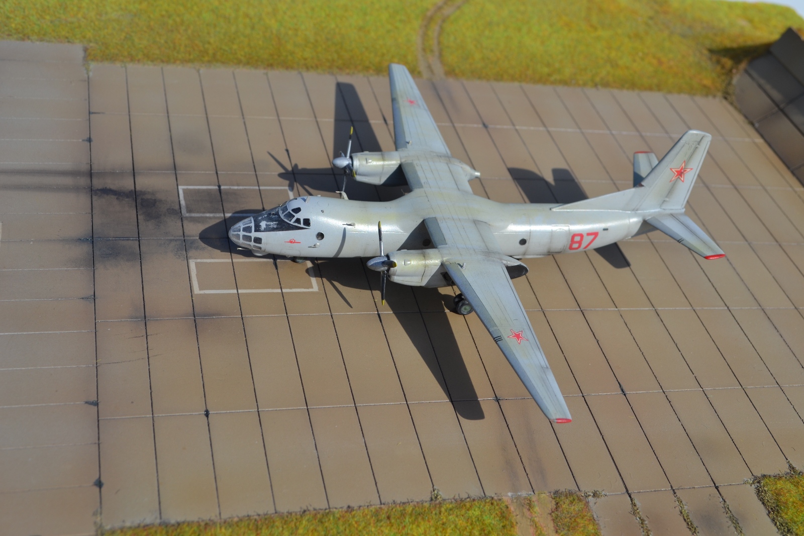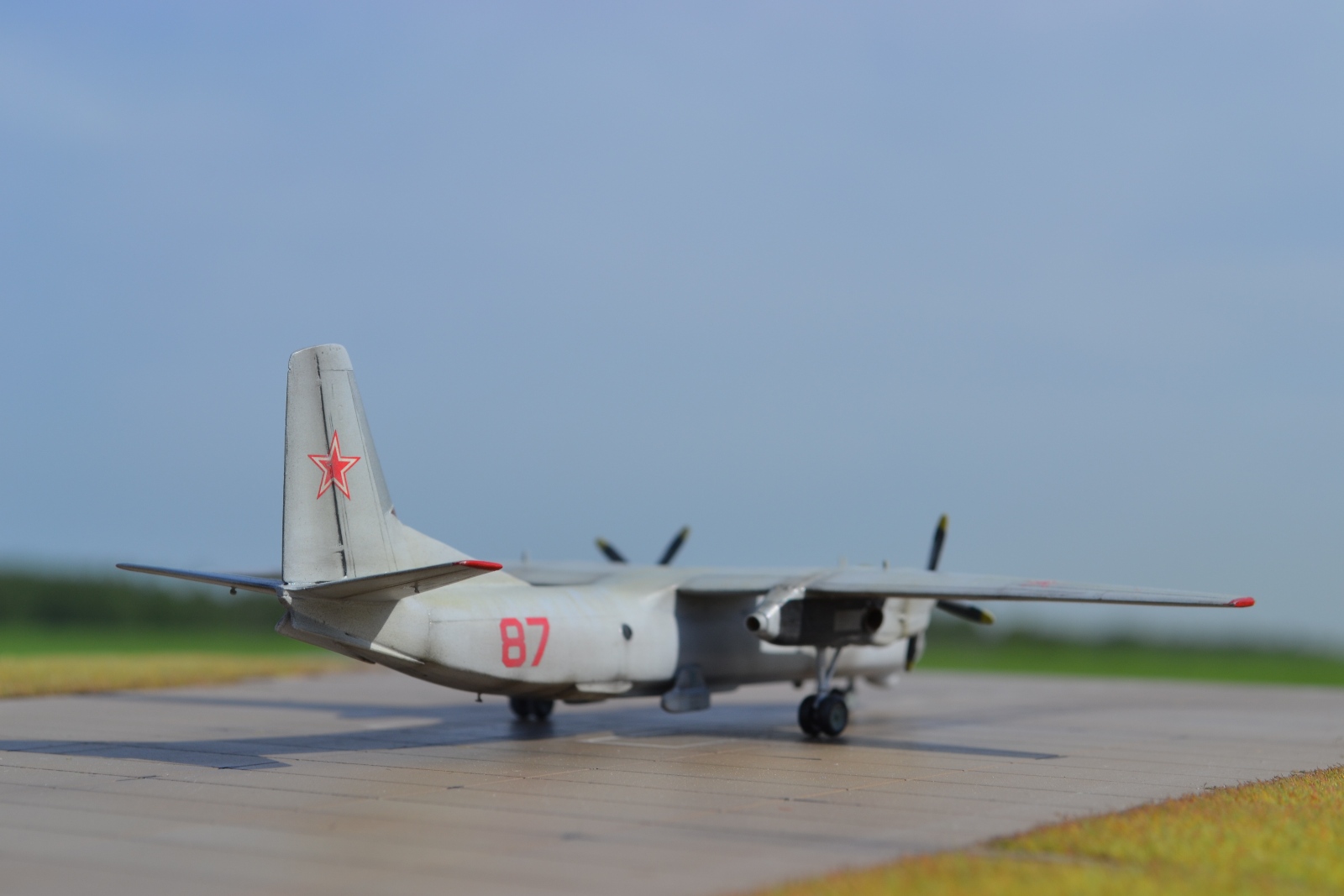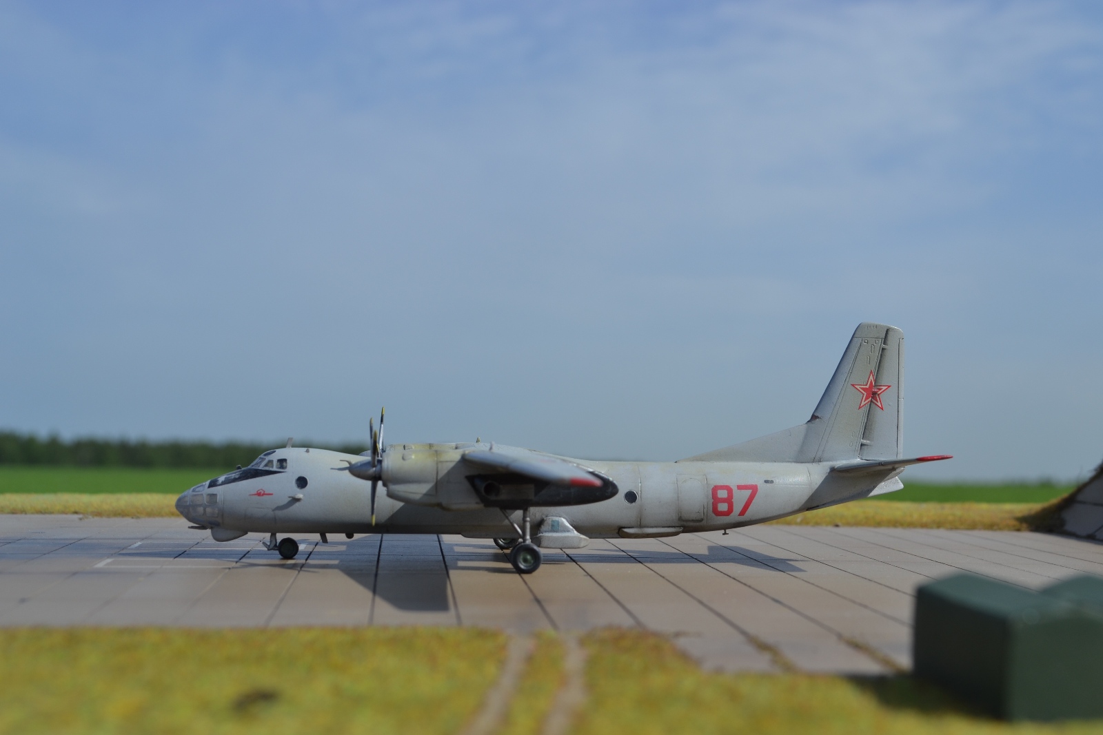 Собрал модель фоторазведчика Ан-30б времен войны в Афганистане. Сборка прошла без проблем. Добавил БАНО, антенны, блоки отстрела ловушек. Очень пригодились маски остекления от Алексея Бацких, ибо веранду штурмана своими силами мне не замаскировать.Коки винтов смоляные- выручил Андрей Пчельников, за что ему огромное спасибо! Окраску сделал серенькую ВВС СССР (очень хотелось знак "отличный самолет" под фонарем). Красил тамиевским серым грунтом, о чем сильно пожалел, так как прешейдинг весь исчез, пришлось очень сильно попачкать пастелью. Попробовал надуть аэром проплешины желтого грунта. Сверху-матовый лак от Тамии. На фотосесии отвалилась дека с левого блока ЛТЦ и забыл подрезать ПОС правого винта. Приятного просмотра!