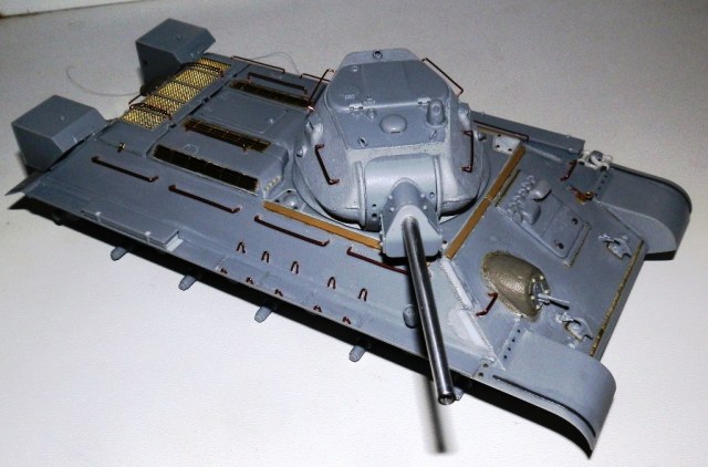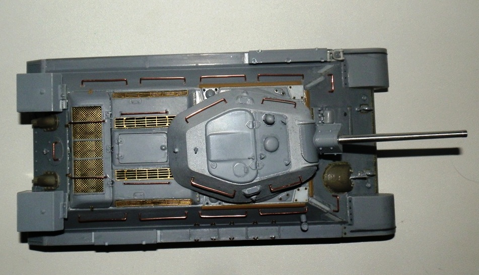 При сборке модели постарался доработать по мере сил и возможностей. По корпусу нанес шиповое соединение бронелистов, сделал защиту башни, заменил сетки и вентиляционные решетки на травление от Мира Моделей. Бронировку курсового пулемета и выхлопные трубы с бронировкой поставил от ЗИПа, ствол от RB Model. На башне нанес фактуру литой брони с помощью тамиевской шпаклевки, номера срезал с литников. Кроме того много других небольших доработок, таких как сварные и литьевые швы, проводка к фаре, болты от Мастерклаба, поручни по корпусу и башне-медная проволока. Антенна-кошачий ус, трос из магазина метизов, фара Эльф. Более подробно можно посмотреть в моей сказке о стройке Т-34/76 Стройка .