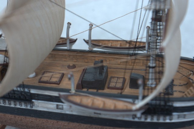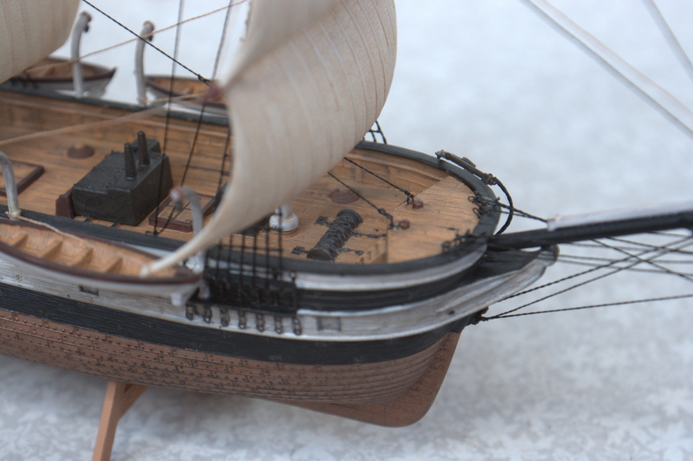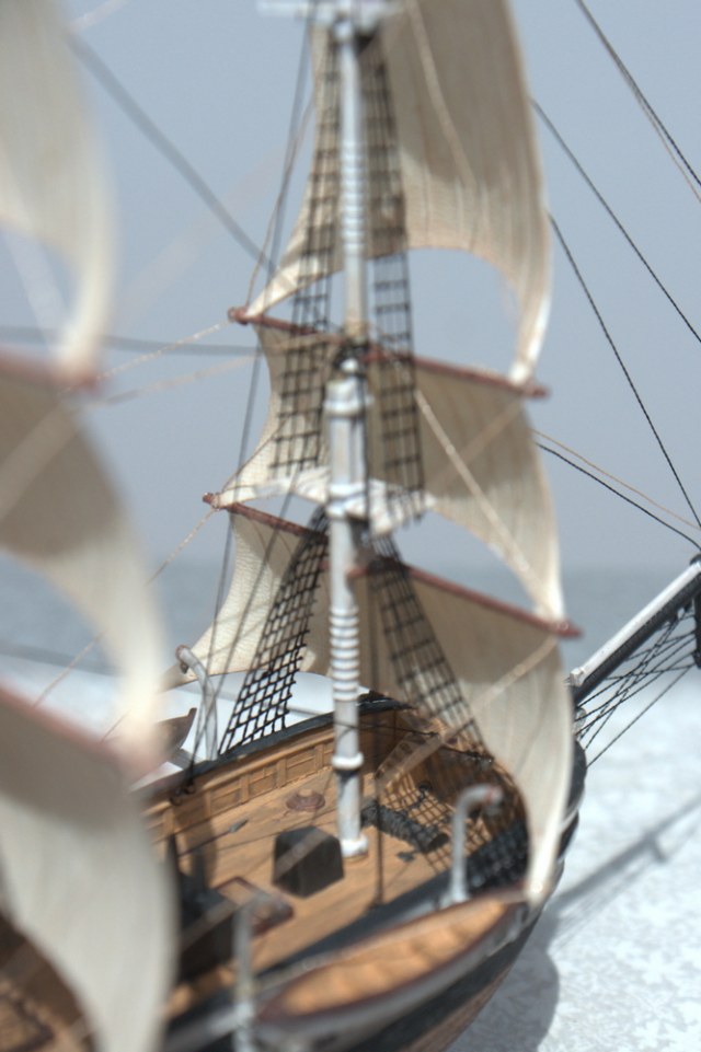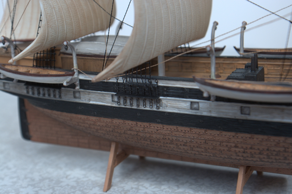 Вант-путенсы были выдавлены в корпусе, размер маленький, стачивать и переделывать на объемные тяжело, решил не мудрить и оставить как есть. Ванты сами по себе должны быть за мачтами, а в этой модели - строго под ними. Цвет обшитой части - верно, он должен бы был быть с прозеленью, да и более медный, чем бронзовый. Ограждения на юте, как ни странно, в оригинале тоже не было.