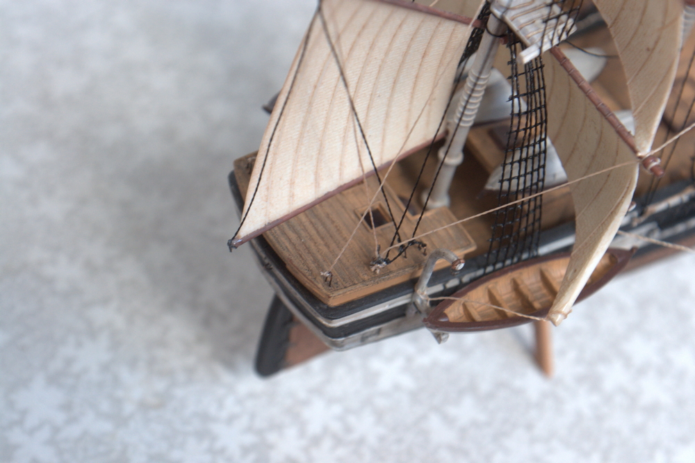 Собирал и красил по старым фотографиям оригинального судна и похожих судов. Впрочем, часто менял что-то для соответствия собственной эстетике или логике (например, перо руля должно быть обшито медью, но на пластике модели оно имеет вид деревянного - красить дерево металликом не стал.) Эмаль, аэрограф, кисти - всё стандартно.