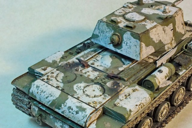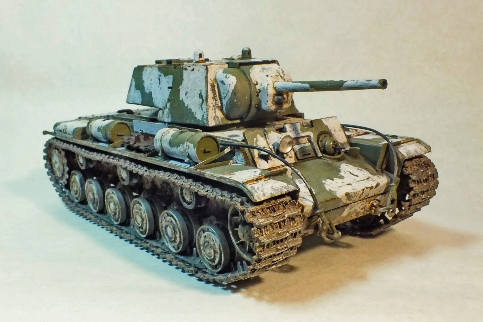 Модель собиралась с активным применением точильно-режущего инструмента.Добавлены сварные швы,проводка к фаре и сигналу,броненакладка на НЛД,петли для крюков на башне.Заменены ручки на доп. баках,стволы пулемётов,фара,решётки МТО,косынки крепления надгусеничных полок.Ствол орудия заменён на деревянный(из кисточки).Гусеницы наборные "Восточный экспресс".
