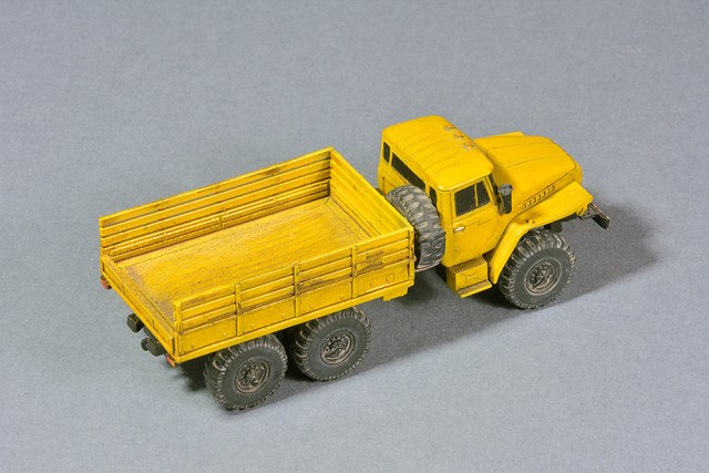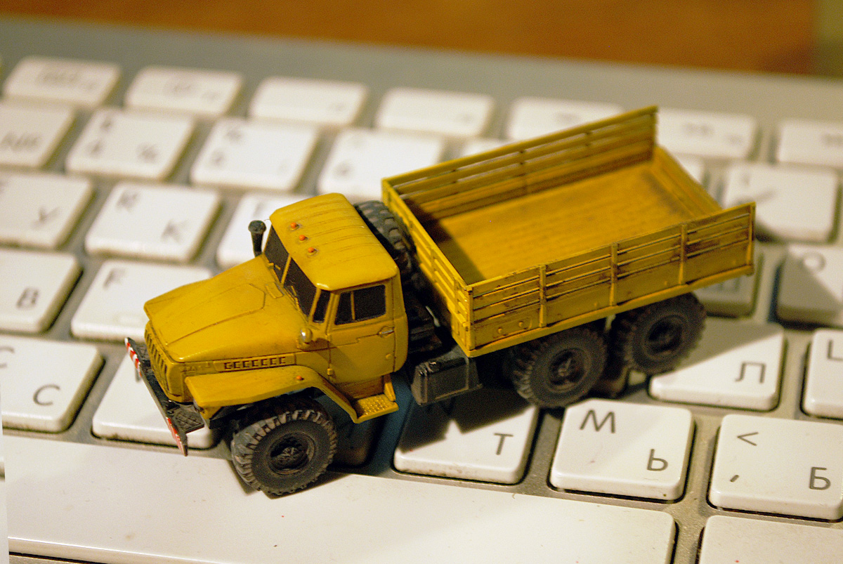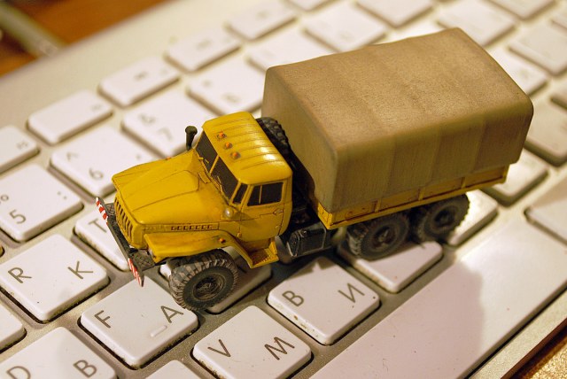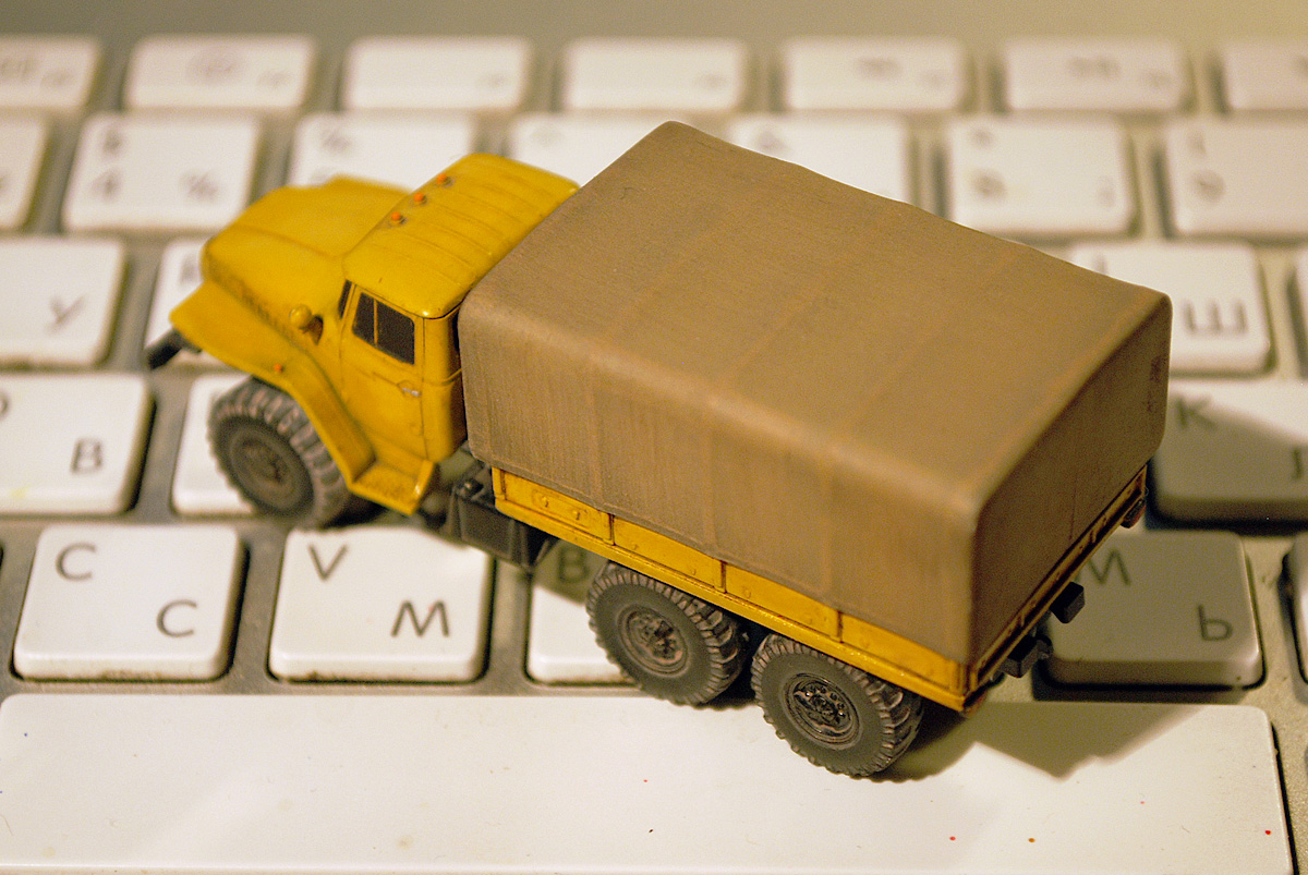 Наверное и моделью-то язык не повернется назвать. Игровая фишка и есть. Решил покрасить не как положено, а в ярко желтый цвет. Надеюсь, можно считать, что возможен такой грузовик аэродромной прописки. Описывать особенно нечего, кроме, пожалуй, окраски тента. Сперва загрунтовал (ну, конечно по зашпаклеванным швам) белой грунтовкой. Потом прошелся из аэра по граням черной акриловой гуашью. Краска очень хорошая и не дорогая, но весьма не стойкая к истиранию. Поэтому, с самих граней легко и естественно стерлась пальцами. Затем, легкие слои акрила и маслом, жесткой кистью сделал грубые вертикальные и горизонтальные "полосы", имитирующие фактуру (текстуру) ткани.