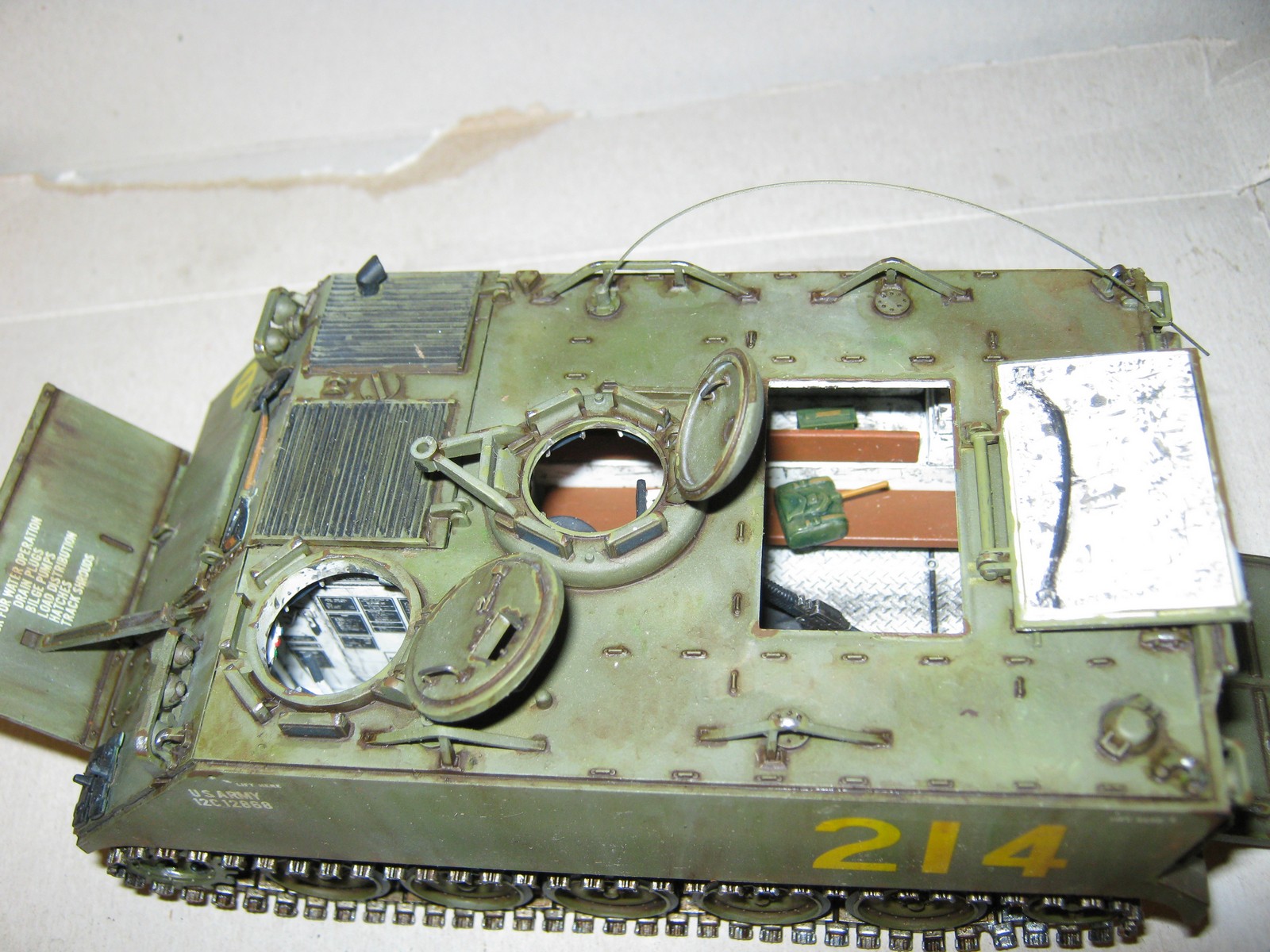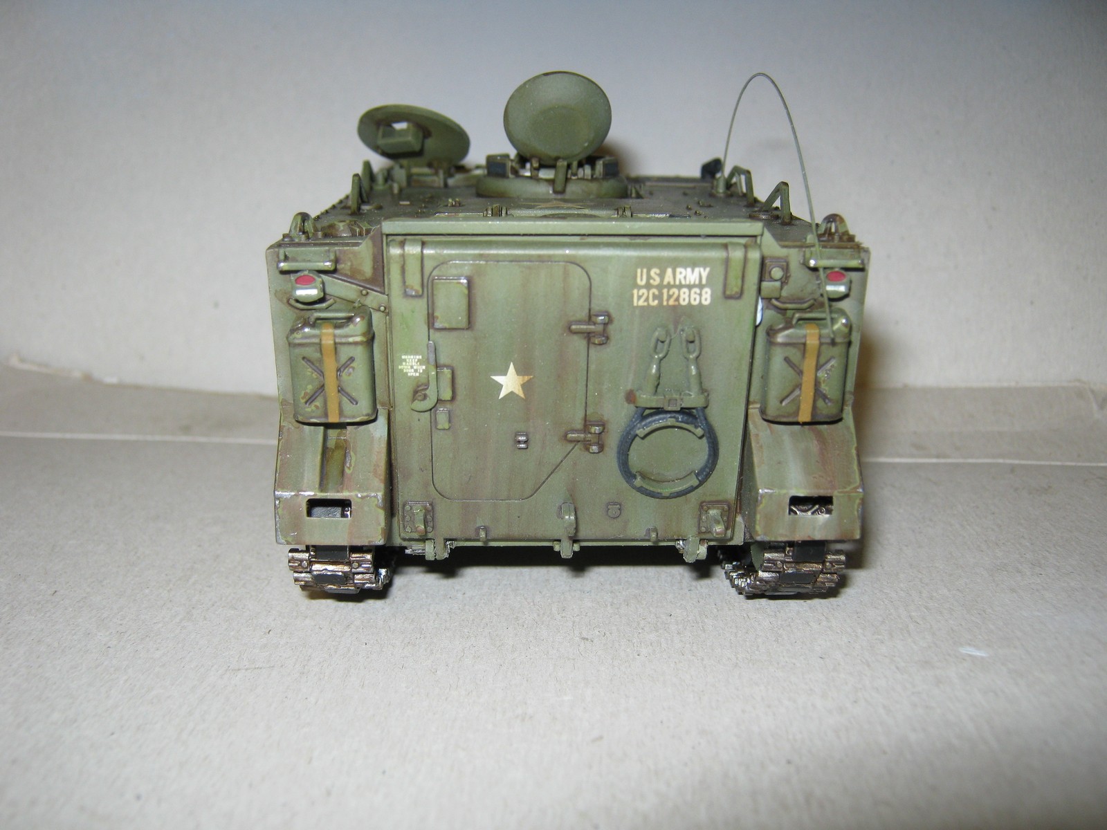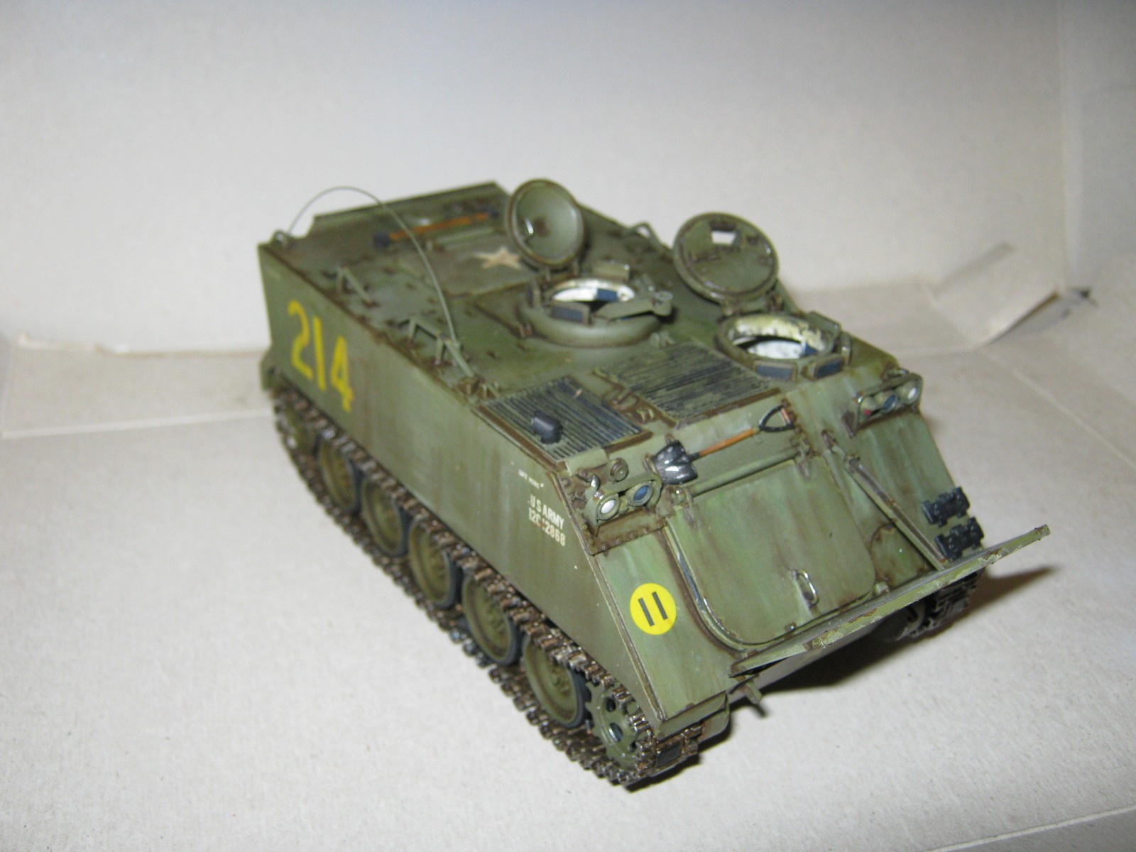 Модель TAMIYA, М113 времен Вьетнамской войны. Собирательный образ. Красил аэрографом, краска Вальехо, смывка масло. Сборка прошла нормально, хоть набор и старый 1974 года, но альтернатив практически нет. Из доработок: антенна из струны гитраной и немного барахла в салоне в виде пулемета М60, пары канистр, цинков с патронами и рюкзака морпеха.